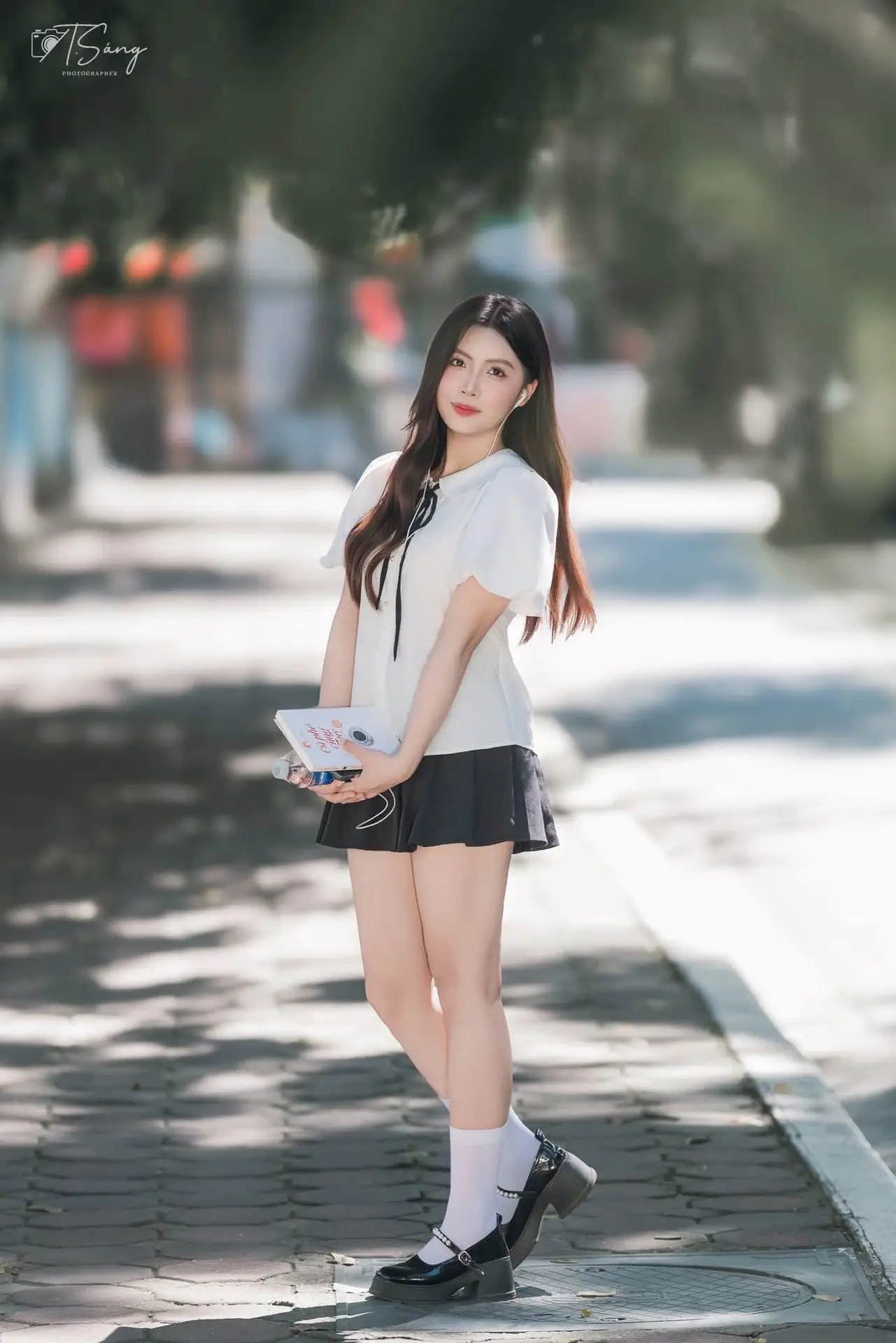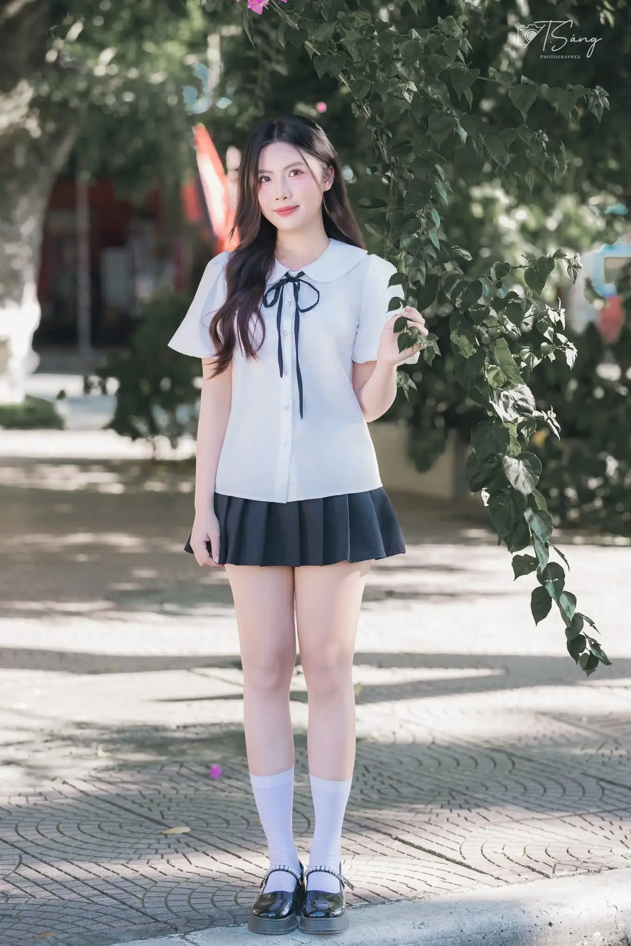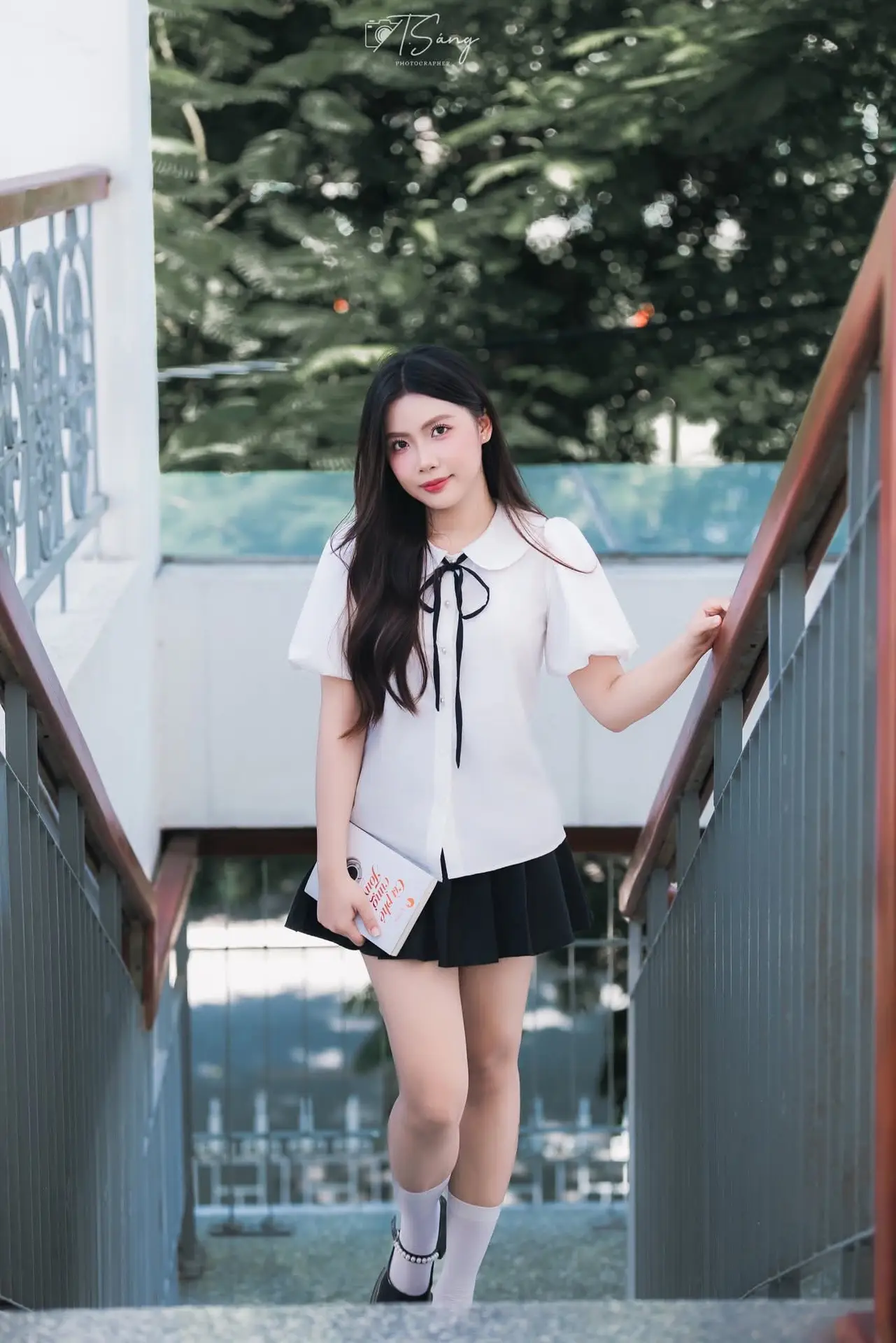 This captivating image beautifully captures a schoolgirl's graceful moment, featuring a gentle smile and innocent eyes. She radiates fresh, youthful charm in her classic school uniform. The white collared shirt with its delicate bows, paired with a pleated black skirt and white knee-high socks, creates a look that is both timeless and chic. This portrayal not only highlights the elegance of the attire but also evokes cherished memories of student life. The harmonious blend of her outfit and serene expression beautifully celebrates the gentle beauty of youth.#schoolgirl #uniform #youthfulbeauty #studentlife #asiangirl