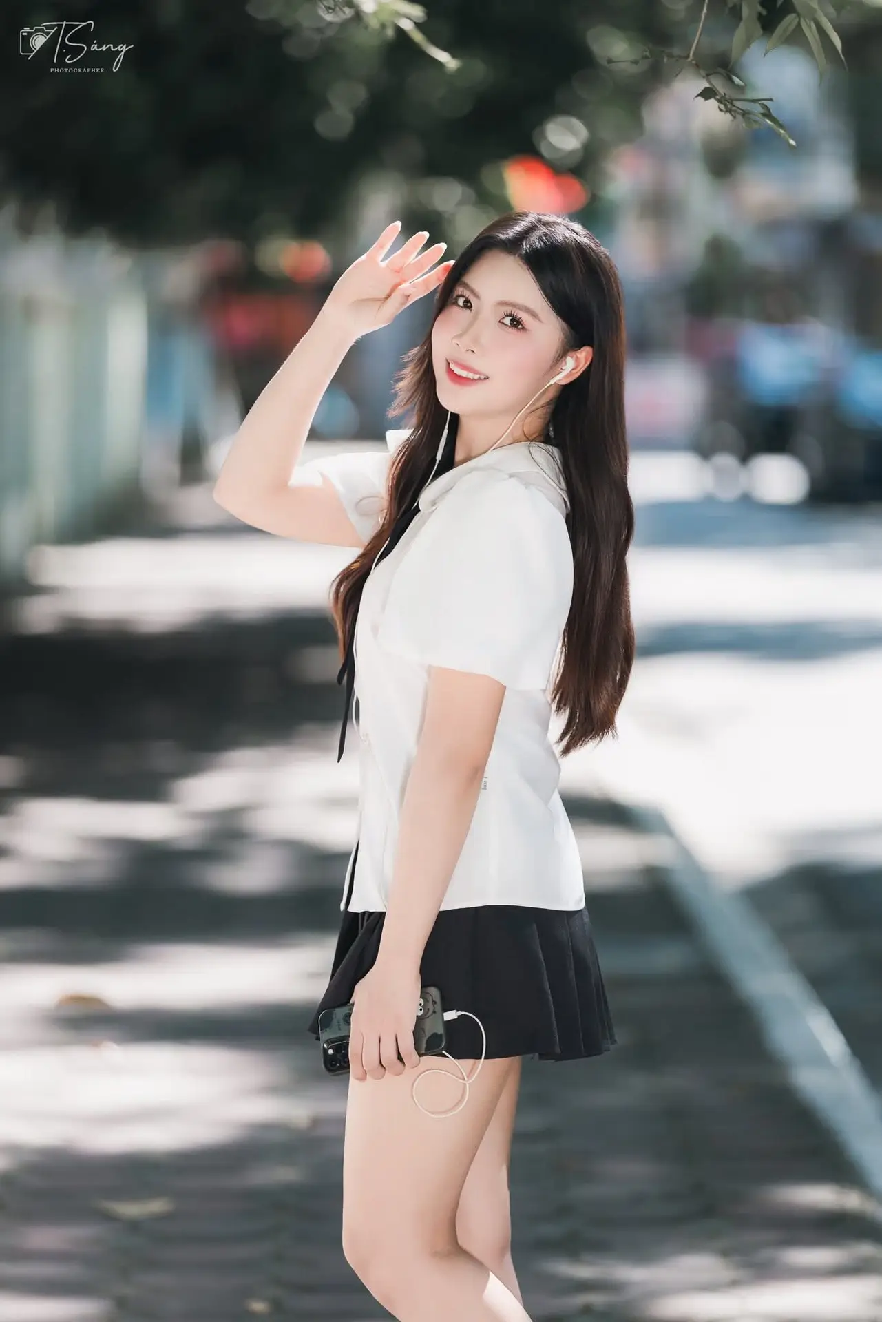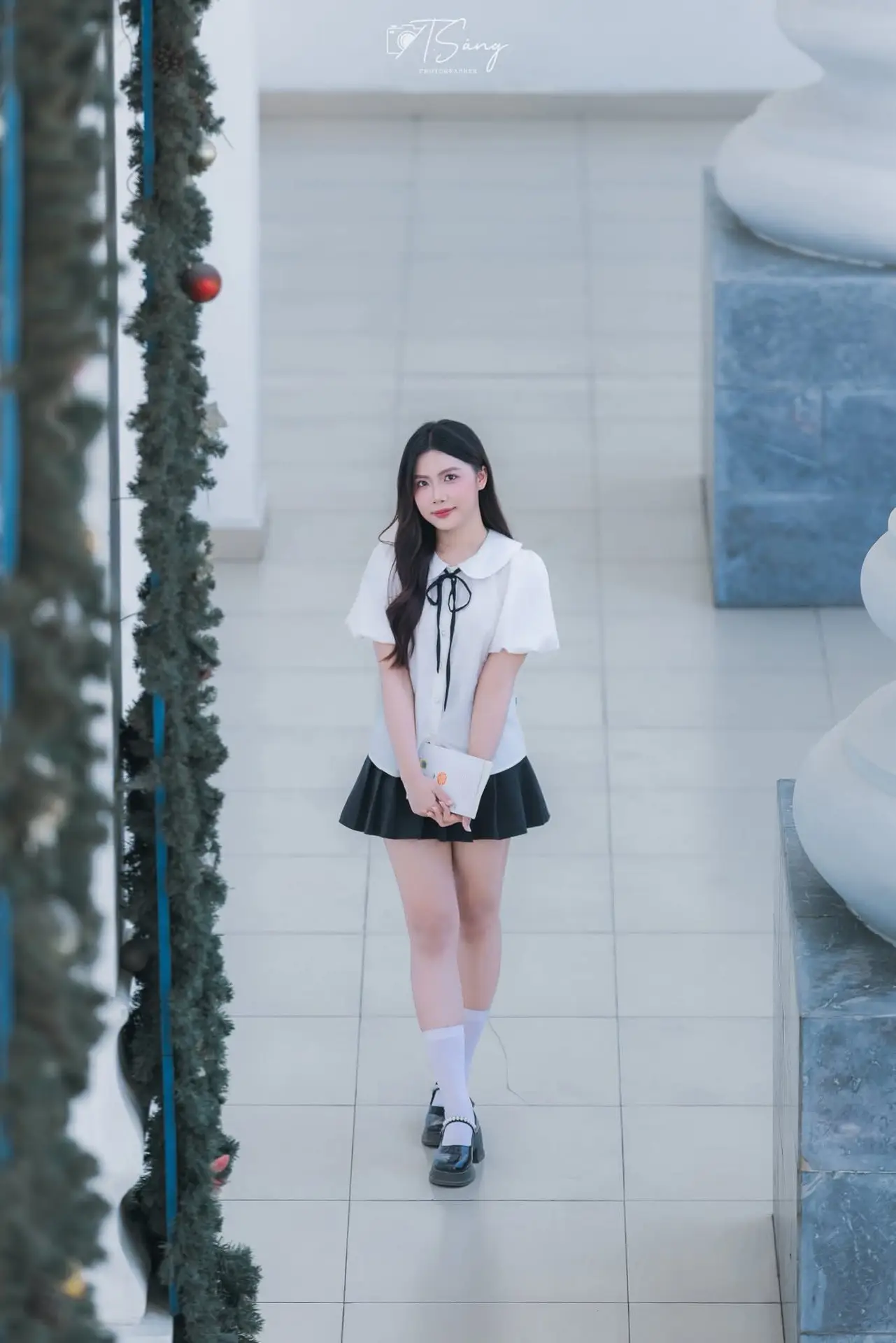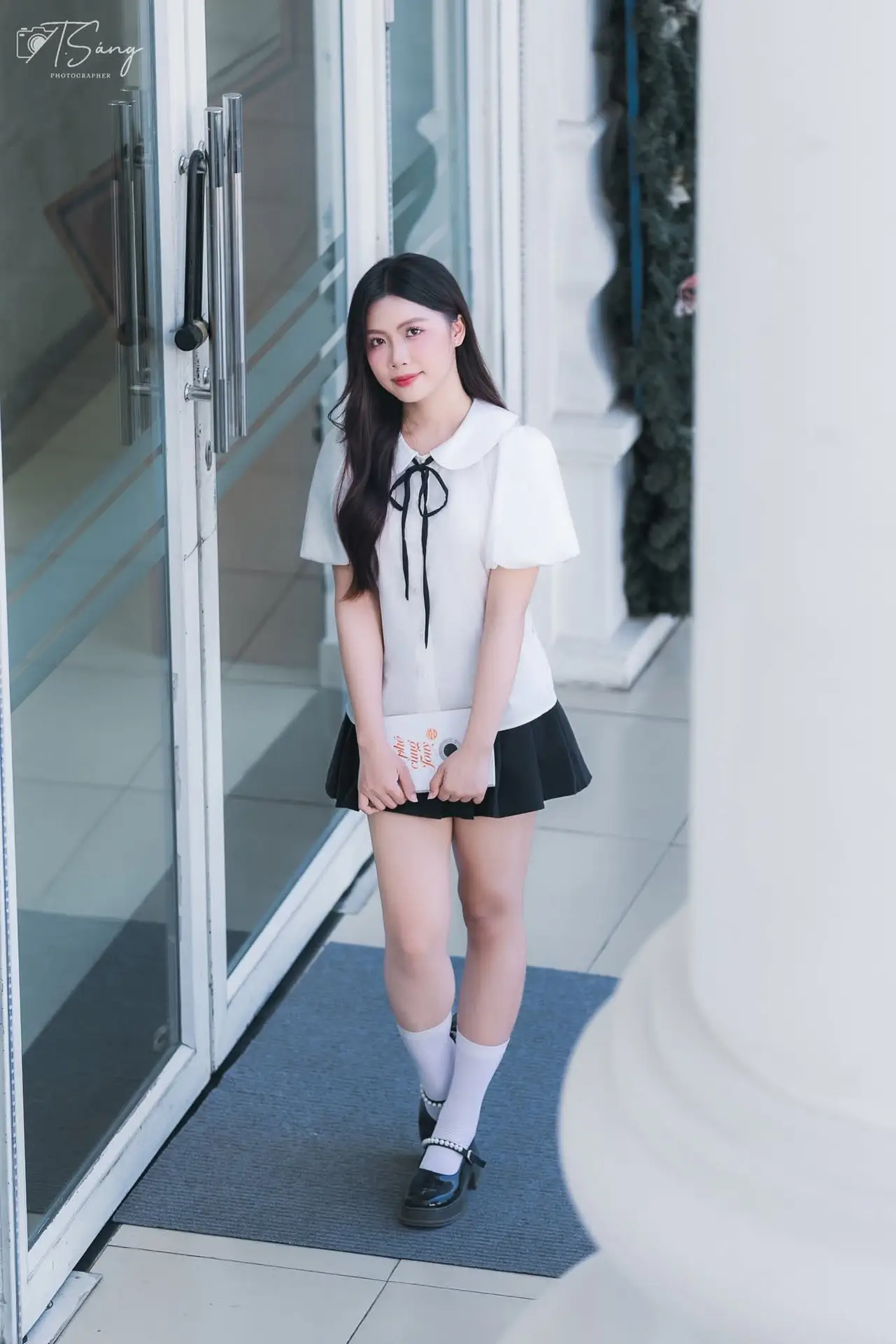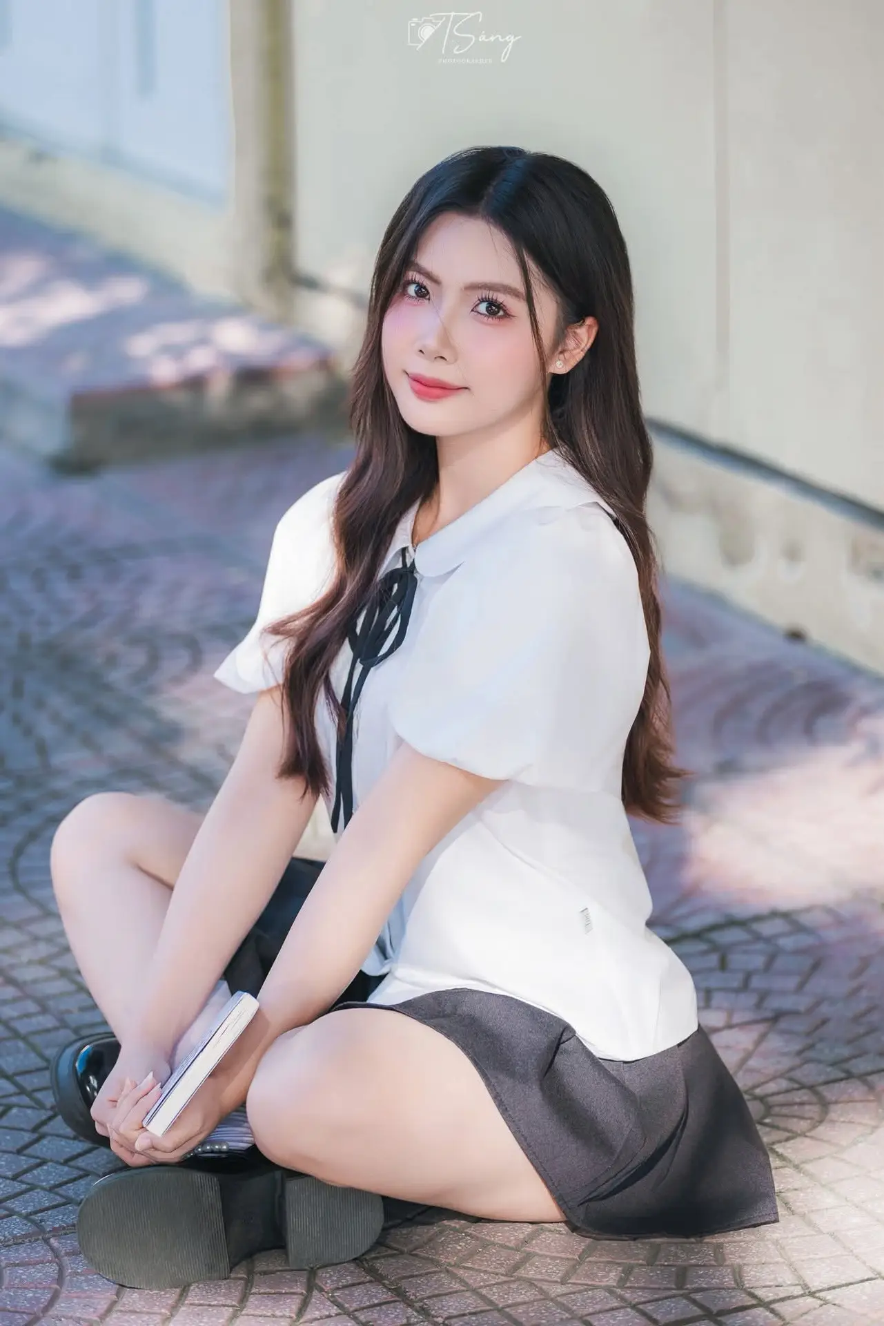 This captivating image beautifully captures a schoolgirl's graceful moment, featuring a gentle smile and innocent eyes. She radiates fresh, youthful charm in her classic school uniform. The white collared shirt with its delicate bows, paired with a pleated black skirt and white knee-high socks, creates a look that is both timeless and chic. This portrayal not only highlights the elegance of the attire but also evokes cherished memories of student life. The harmonious blend of her outfit and serene expression beautifully celebrates the gentle beauty of youth.#schoolgirl #uniform #youthfulbeauty #studentlife #asiangirl