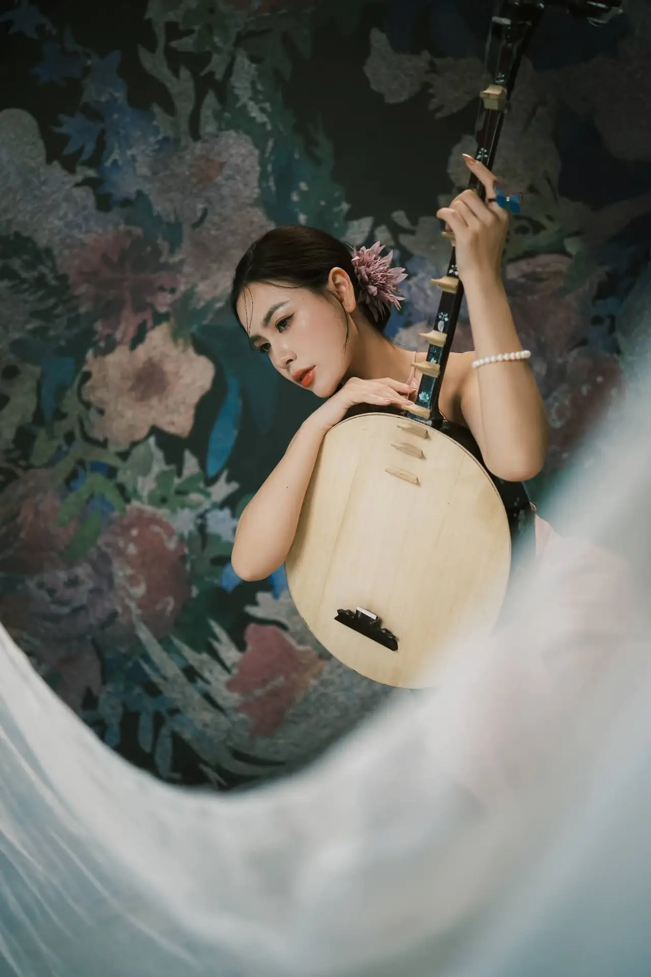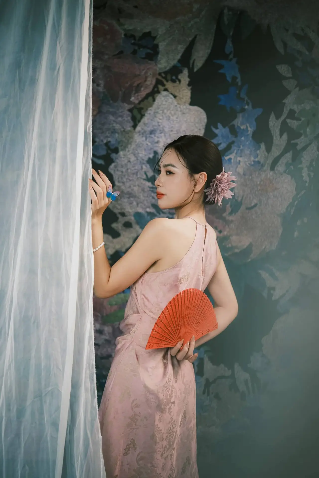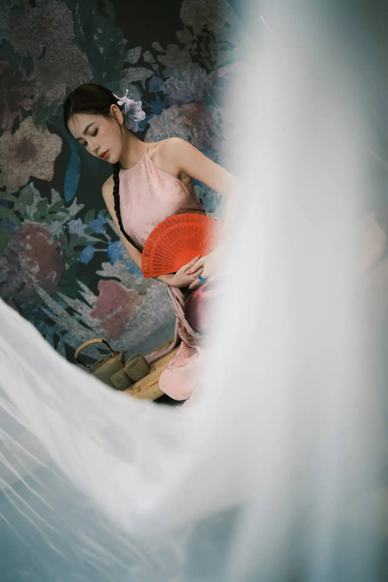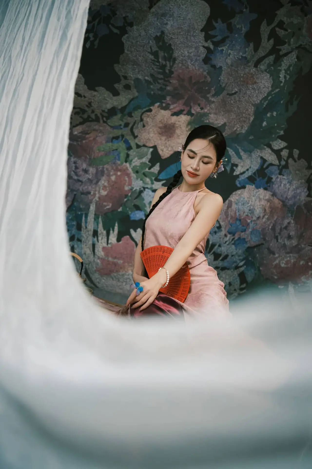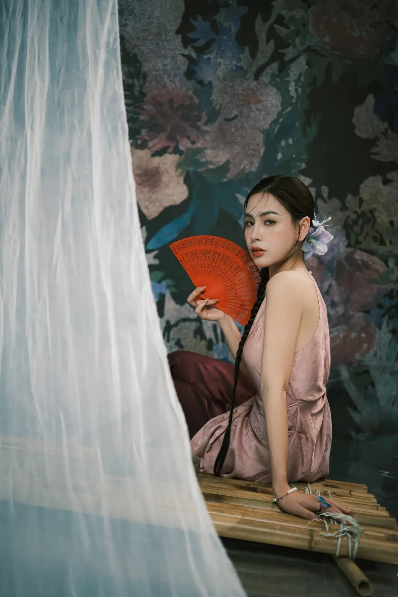 This exquisite photograph beautifully captures a Vietnamese girl embodying gentle grace and timeless elegance, sure to captivate any viewer. Dressed in a delicate pink Ao Yem, her neatly braided hair adorned with a subtle flower, she emanates a captivating traditional charm. The girl sits in a dreamy pose, eyes downcast, gently holding a vibrant red fan that serves as a striking focal point amidst the serene setting. Behind her, a rich floral tapestry provides a classic backdrop, further enhancing her ethereal East Asian beauty. This artistic moment is imbued with emotion, perfectly encapsulating the tranquility and profound cultural heritage of Vietnam, inviting viewers to appreciate its nostalgic allure.#VietnameseBeauty #AoYem #TraditionalArt #VietnameseCulture #Graceful