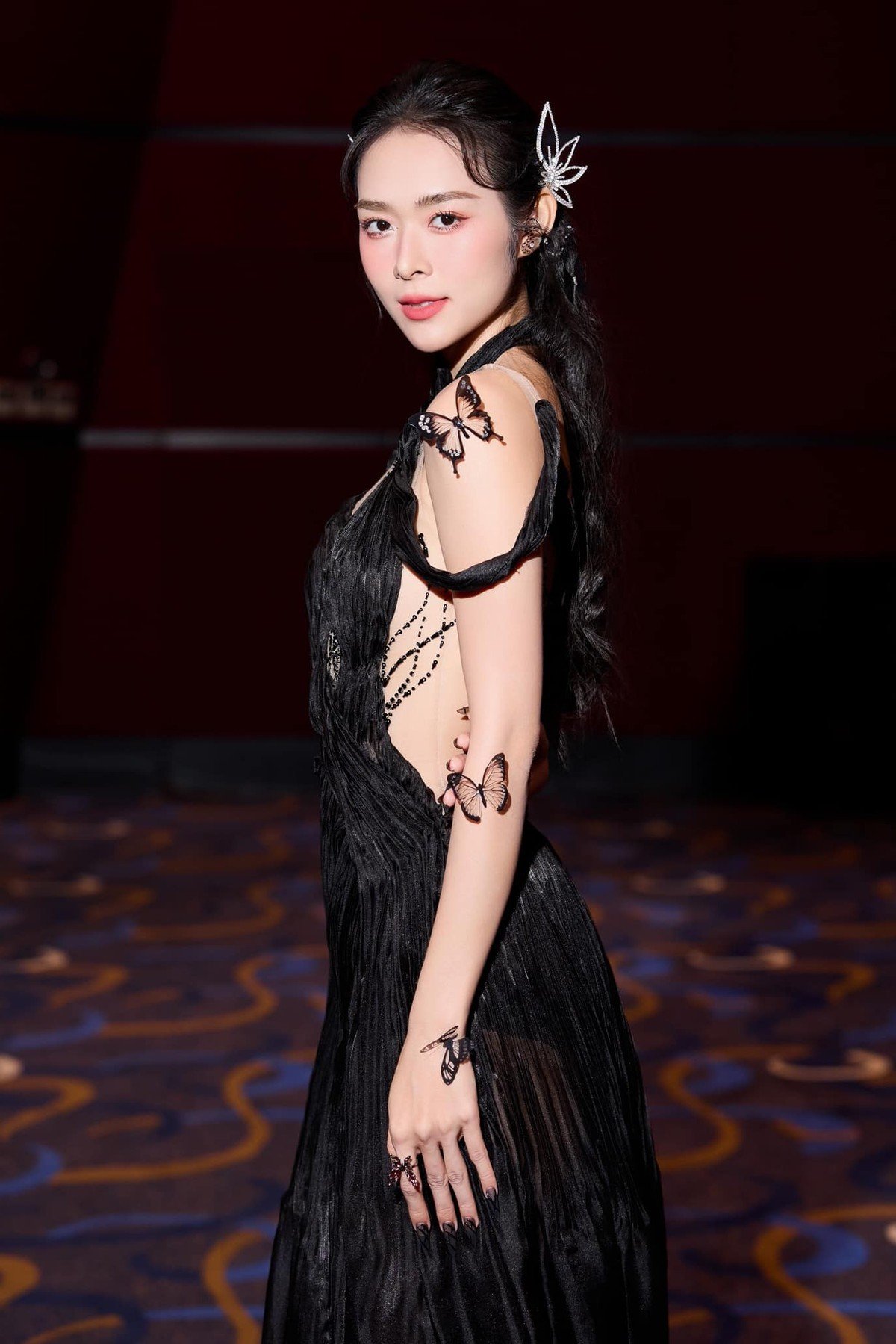 This photograph captures a captivating moment of actress Diep Bao Ngoc radiating elegant and alluring beauty. She wears a sophisticated black strapless dress that accentuates her graceful figure and fair skin. The vibrant red lipstick and neatly styled updo highlight the harmonious features of her face. Diep Bao Ngoc showcases her regal charm with sparkling pearl jewelry and a confident luxurious demeanor. This image not only reflects her sophisticated fashion style but also affirms the timeless beauty of the actress. Her graceful poise and professional presence in every gesture help her always shine and attract every gaze.Stories