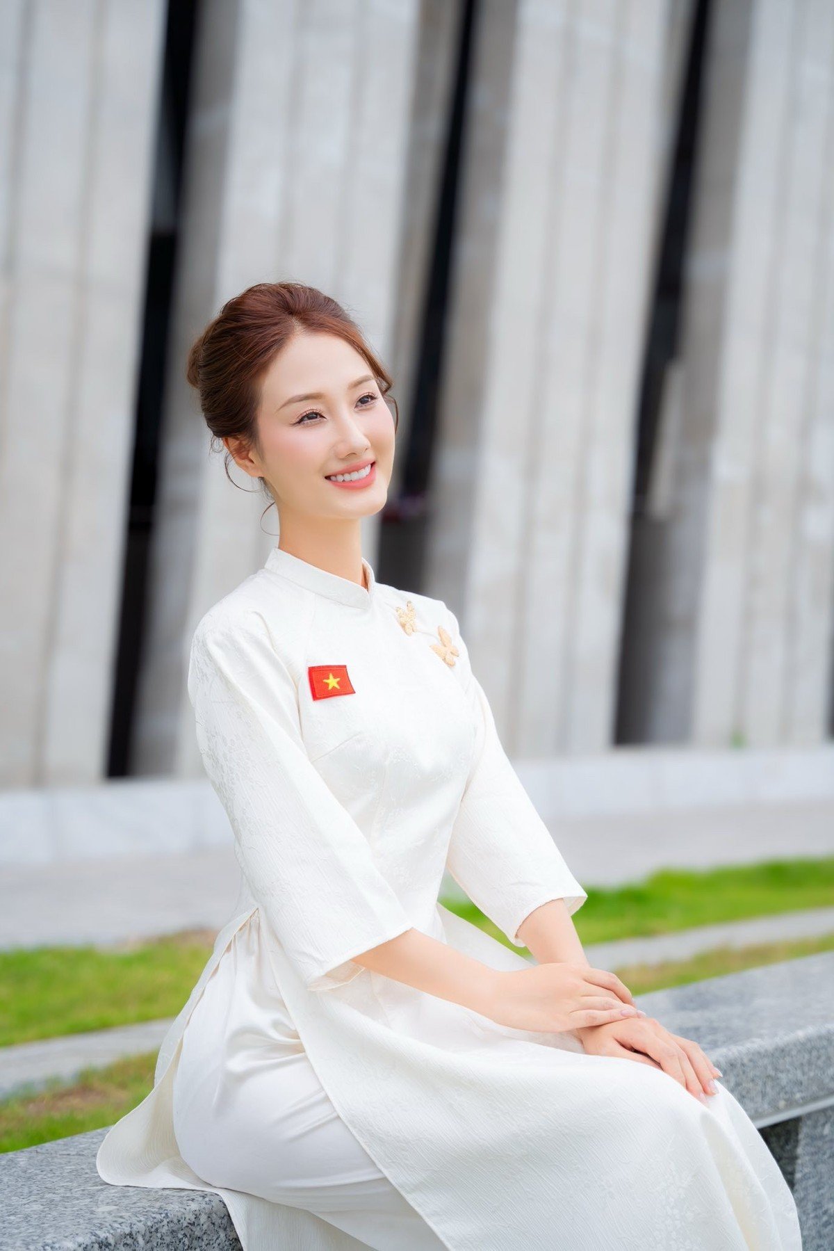 Actress Hoang Khanh Ly, known as the 'hot girl at the boarding house', shines with pure Vietnamese beauty in a pristine white Ao Dai. Her radiant smile and gentle grace serve as a meaningful welcome to National Day 2/9. This photo collection not only honors the traditional beauty of Vietnamese women but also expresses national pride through the small flag detail on her dress. Khanh Ly truly captivates fans with her elegant and refined image, evoking deep cultural values and patriotic spirit. She embodies a harmonious blend of modernity and tradition.