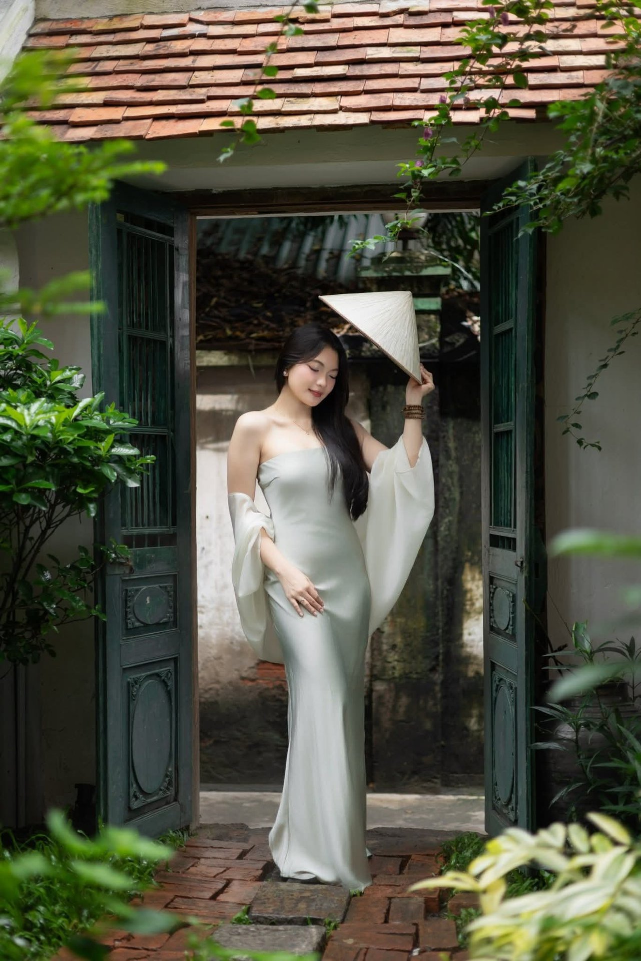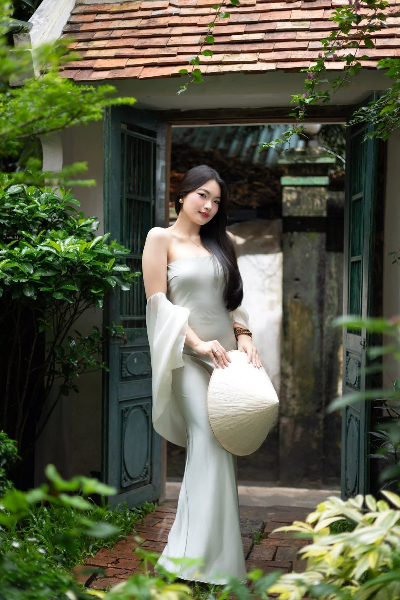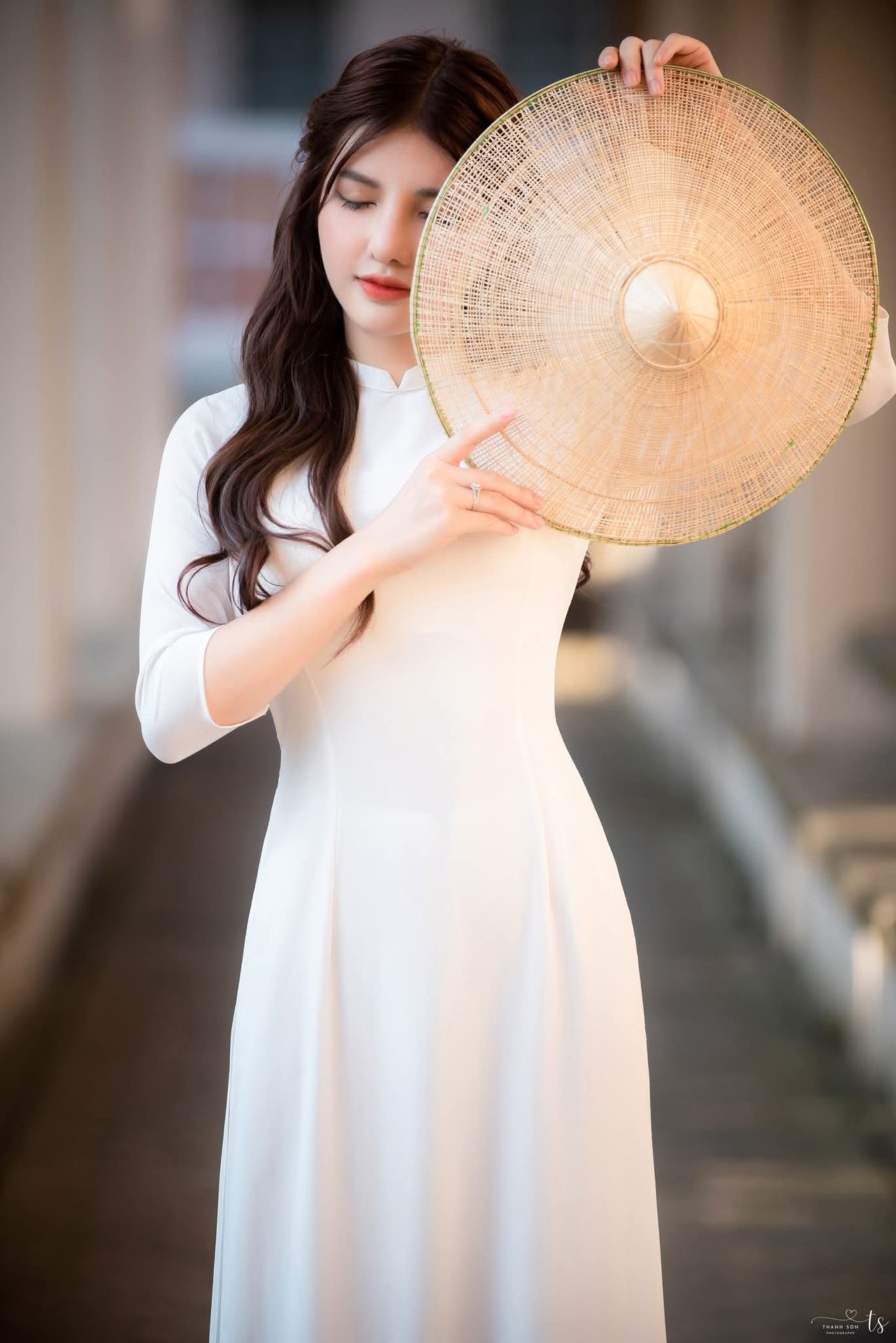 This captivating image beautifully portrays the graceful and elegant beauty of a Vietnamese girl adorned in a delicate traditional outfit. Her gentle smile and modest gaze beneath the brim of the conical hat evoke a strong sense of Asian charm, reminiscent of Vietnam's profound cultural heritage. The pristine white off-shoulder dress, showcasing her slender shoulders, perfectly complements the rustic conical hat, highlighting her refined and elegant demeanor. The ancient architecture in the background further enhances the timeless beauty of the Vietnamese woman. This photograph is not just a beautiful moment but also a tribute to traditional aesthetics, conveying a feeling of peace and nostalgia.