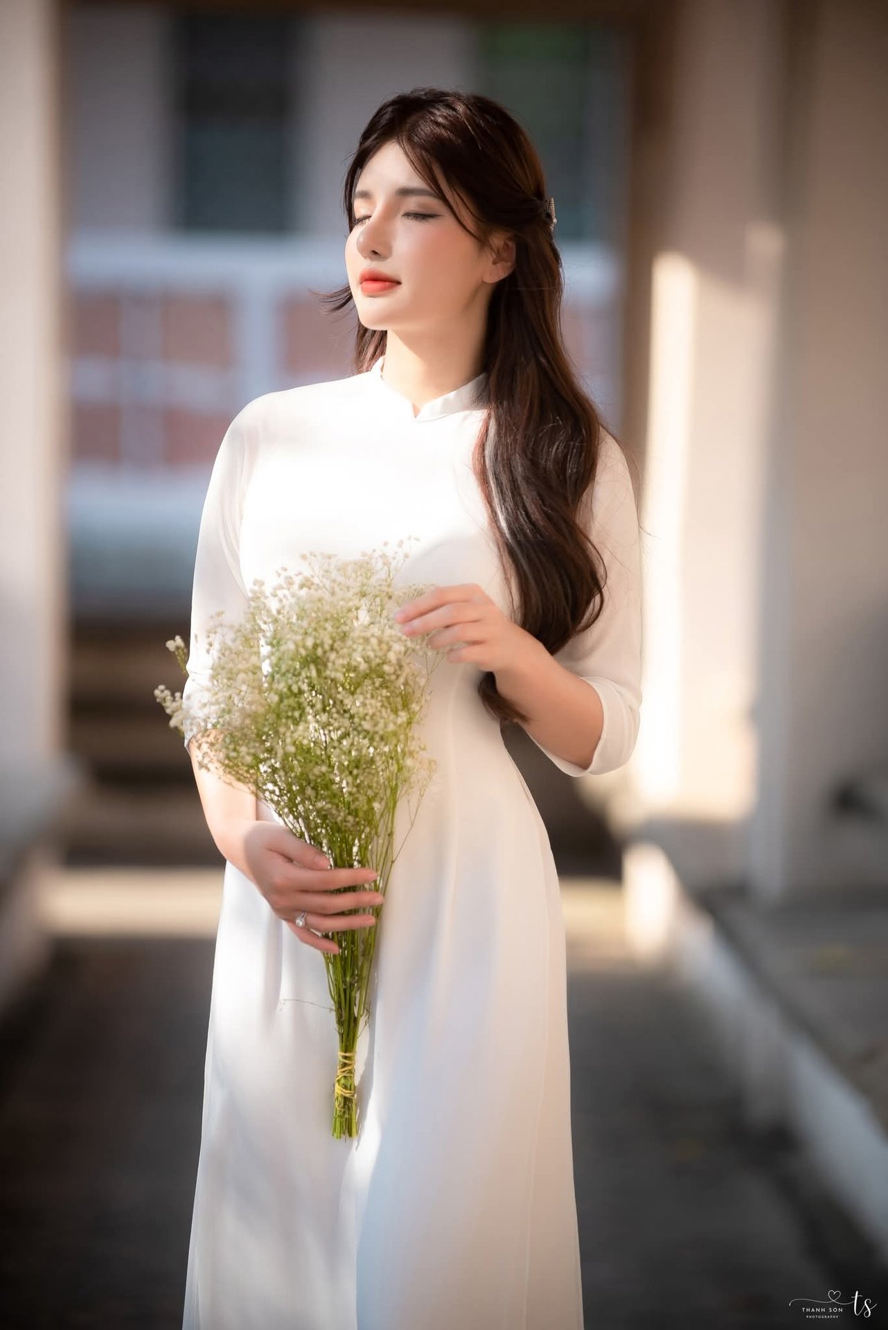 This image captures a serene and emotional moment of a graceful Vietnamese girl in a pristine white Ao Dai. She exudes gentle, elegant beauty with her flowing long hair and soft smile, captivating every gaze. The traditional Ao Dai, flowing gracefully, accentuates her slender, delicate figure, affirming the beauty of Vietnamese culture. In her hands, she holds a bouquet of pure white baby's breath flowers, symbolizing purity and innocent love, further highlighting her fresh, natural youthful charm. The corridor setting with soft golden sunlight adds to the romantic ambiance, creating a harmonious picture rich in Asian aesthetics. This image represents the timeless beauty of Vietnamese women, a perfect blend of tradition and freshness.