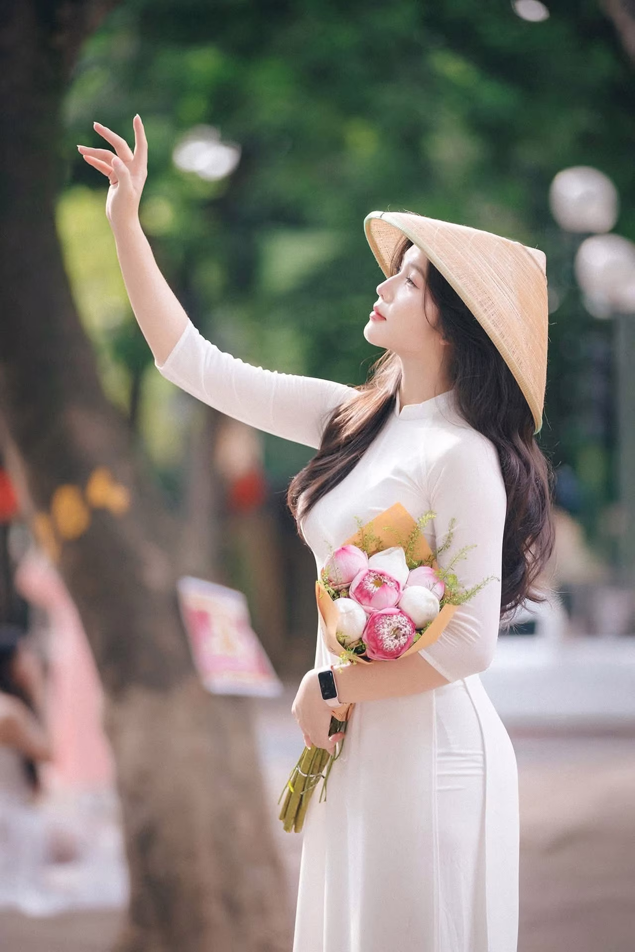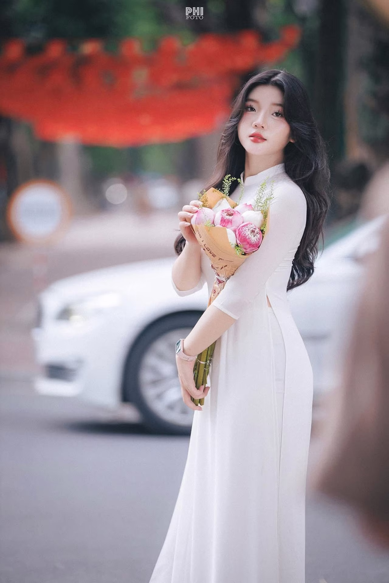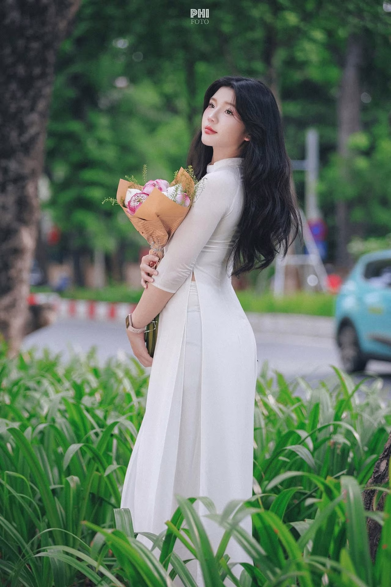 This stunning photograph captures the gentle grace of a Vietnamese girl adorned in a pristine white Ao Dai. With her long flowing dark hair and poised posture, she embodies an elegant and charming beauty. The young woman delicately holds a vibrant bouquet of fresh flowers, her gaze softly distant, creating a poetic and serene scene. The traditional Ao Dai beautifully accentuates her soft and flowing silhouette. Lush green foliage in the foreground provides a natural, refreshing backdrop, highlighting the purity of her attire and her radiant youthful charm. This image not only celebrates Vietnamese cultural beauty but also evokes feelings of tranquility and innocence. It is a harmonious blend of traditional aesthetics and a touch of modern allure.