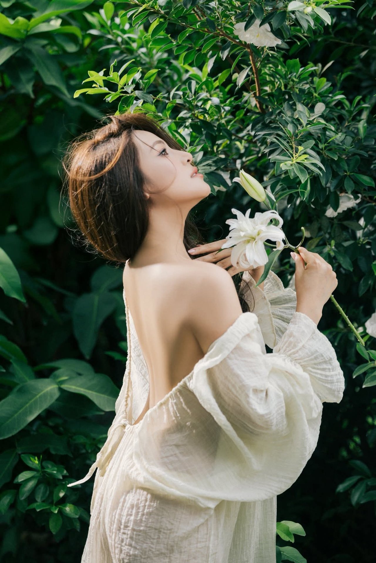 This image 1000019760.jpg is a mesmerizing artistic portrait beautifully capturing the pure elegance of a woman amidst a lush green natural setting. She sits gracefully in a pristine white dress blending seamlessly with the vibrant grass and dense foliage creating a scene reminiscent of a fairytale. Her dreamy gaze coupled with the delicate white lily in her hand accentuates her gentle elegant and subtly mysterious charm. More than just a simple portrait this piece perfectly harmonizes human beauty with the grandeur of nature offering a sense of tranquility and an irresistible allure.Captivating Beauty: Model in Pure White Lingerie, Alluring and Irresistible 1000019766