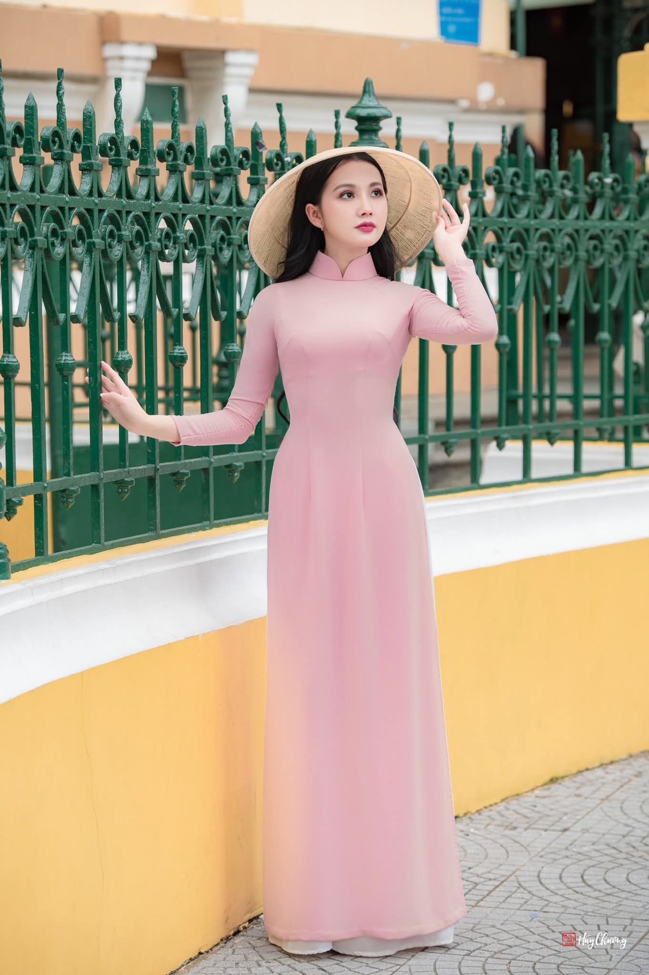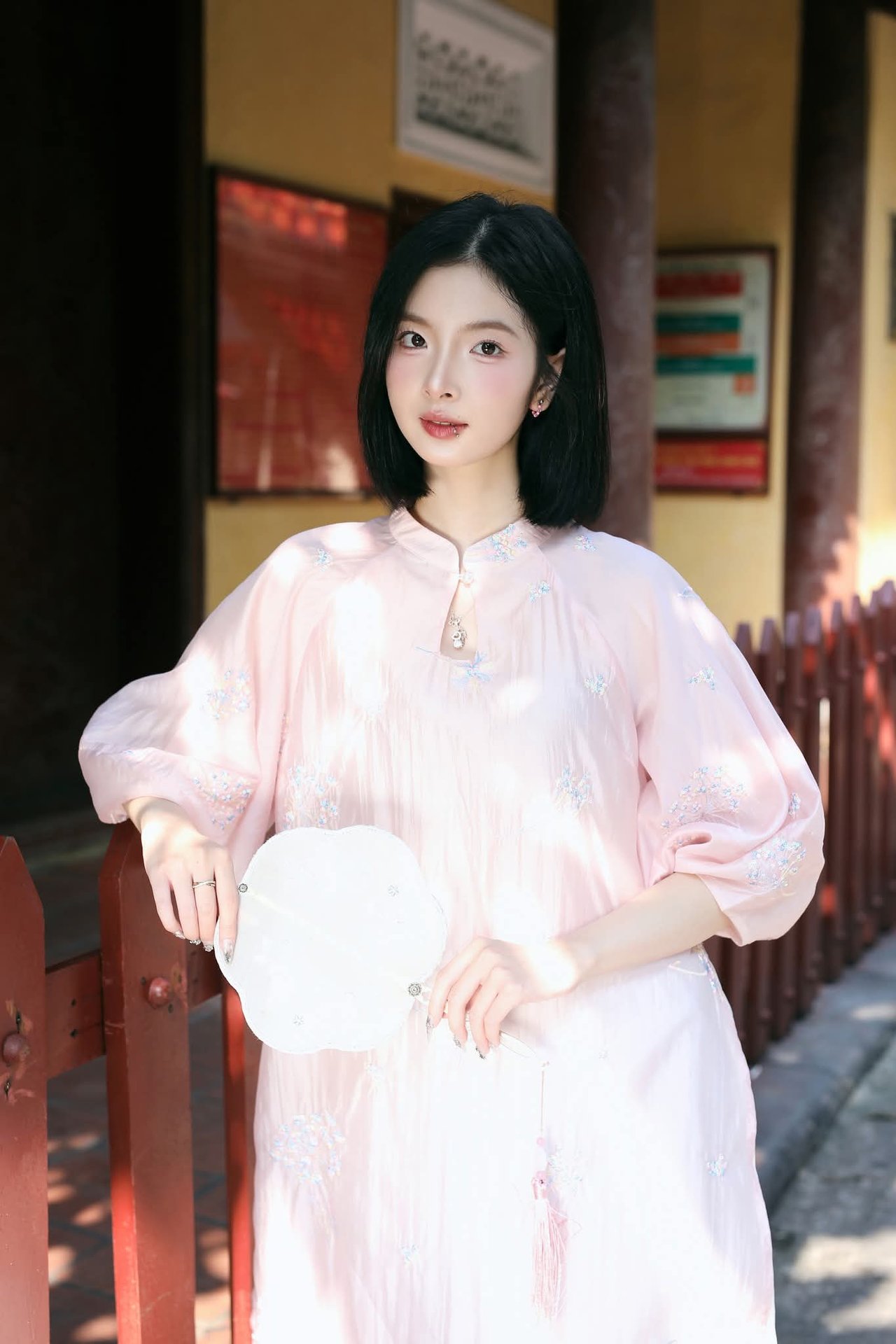 This captivating portrait features a young woman radiating serene beauty and delicate grace. Her long dark hair frames a pristine face, while her expressive eyes gaze directly at the viewer, drawing them into the moment. She is elegantly adorned in a pastel pink off-shoulder dress, its gentle ruffles and corset-style bodice accentuating her feminine silhouette with refined charm. Seated gracefully on a stone ledge, she holds a small pink flower, adding a touch of innocence and romance to the scene. Bathed in soft, natural light, the image highlights her flawless complexion and the ethereal quality of her presence. It evokes a feeling of peace, poetic beauty, and timeless elegance, making this more than just a photograph—it is an artistic portrayal of feminine allure.Graceful Vietnamese Woman in Pink Ao Dai: A Stunning Portrayal of Traditional Asian Beauty 1000019457