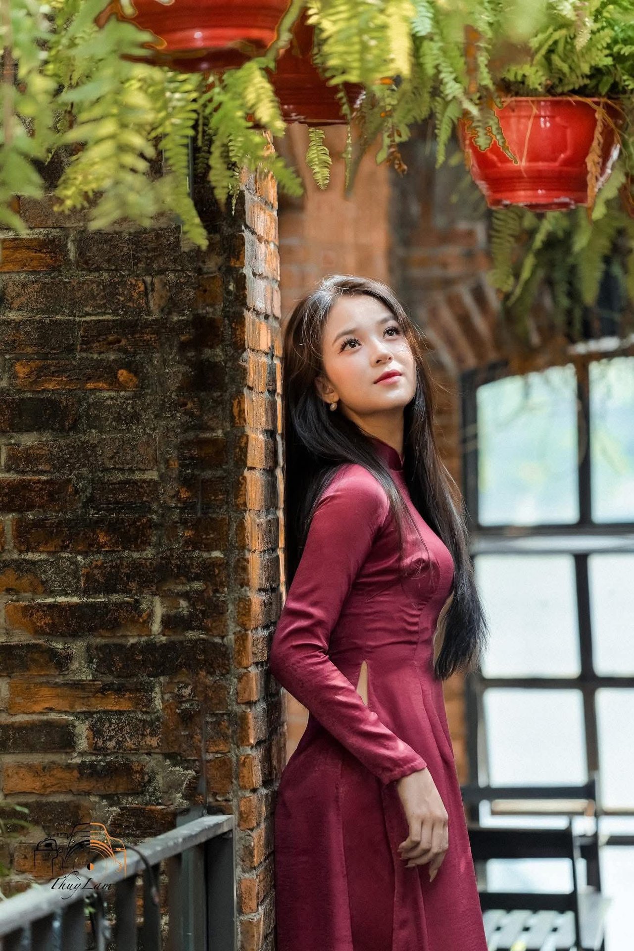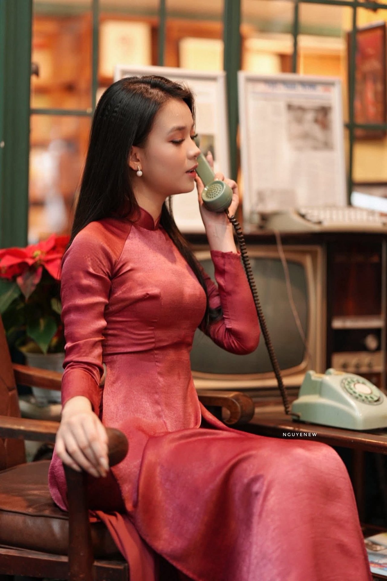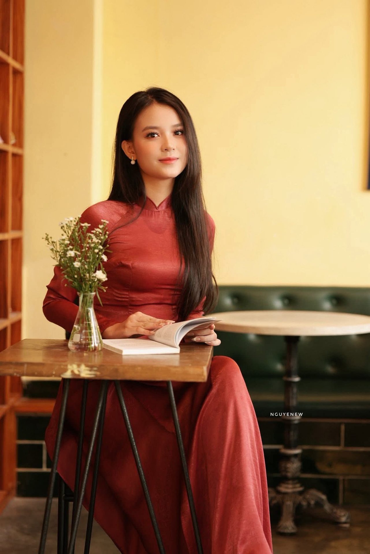 This photo captures a beautiful young Vietnamese woman dressed in a traditional earthy red Ao Dai, radiating elegance and grace. She is seated at a wooden table in the cozy ambiance of a cafe, holding an open book, her gaze gentle and forward. The soft Ao Dai fabric gracefully accentuates her figure, highlighting the unique charm of Vietnamese women. The harmonious blend of traditional attire and a modern setting creates a captivating image, reflecting a refined lifestyle and cultural appreciation. This portrayal not only symbolizes the essence of Asian beauty but also evokes a sense of peace and tranquility, inviting viewers to admire the timeless allure of the Ao Dai and the elegant demeanor of a Vietnamese girl.Captivating Asian Beauty in an Elegant Black Velvet Cheongsam