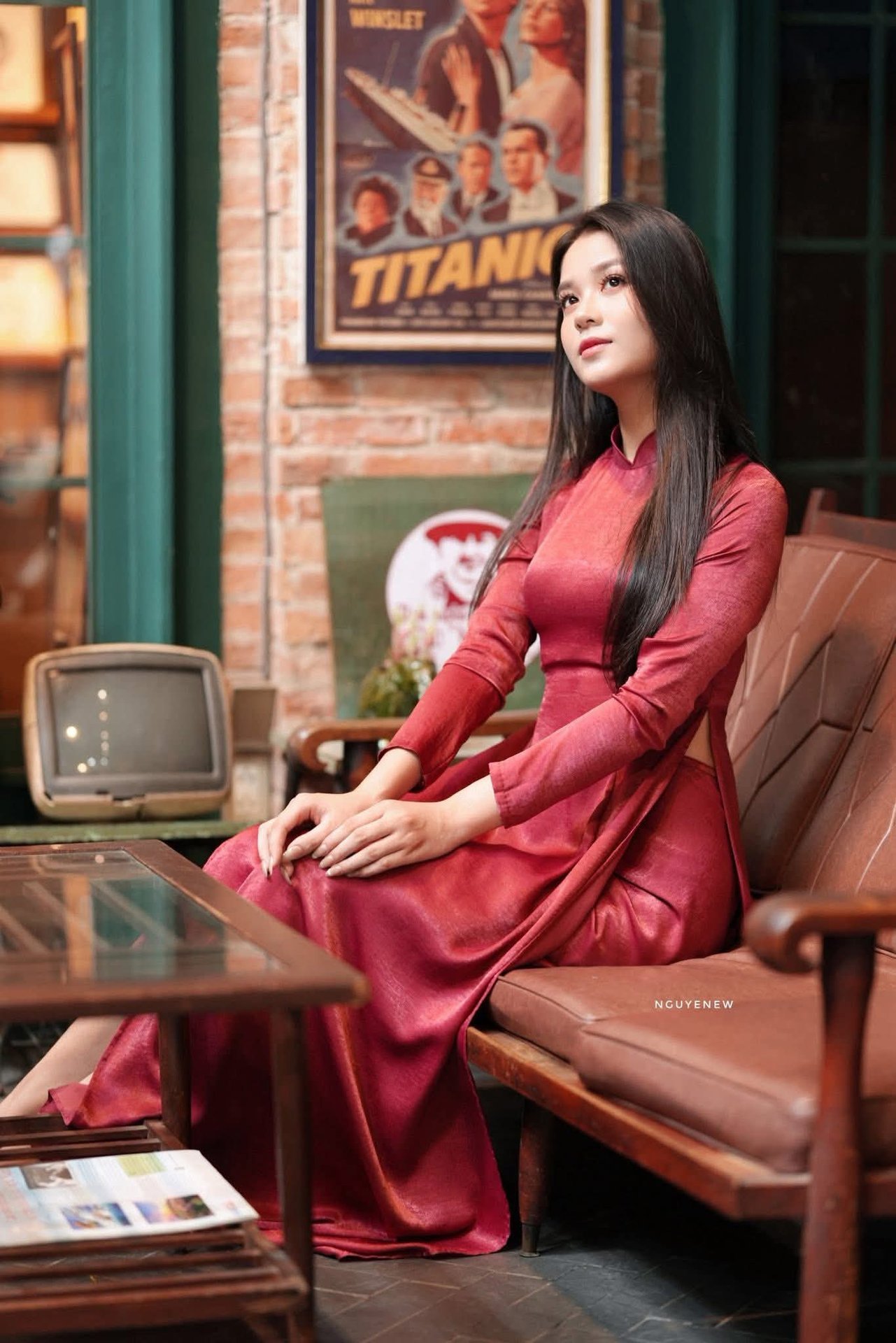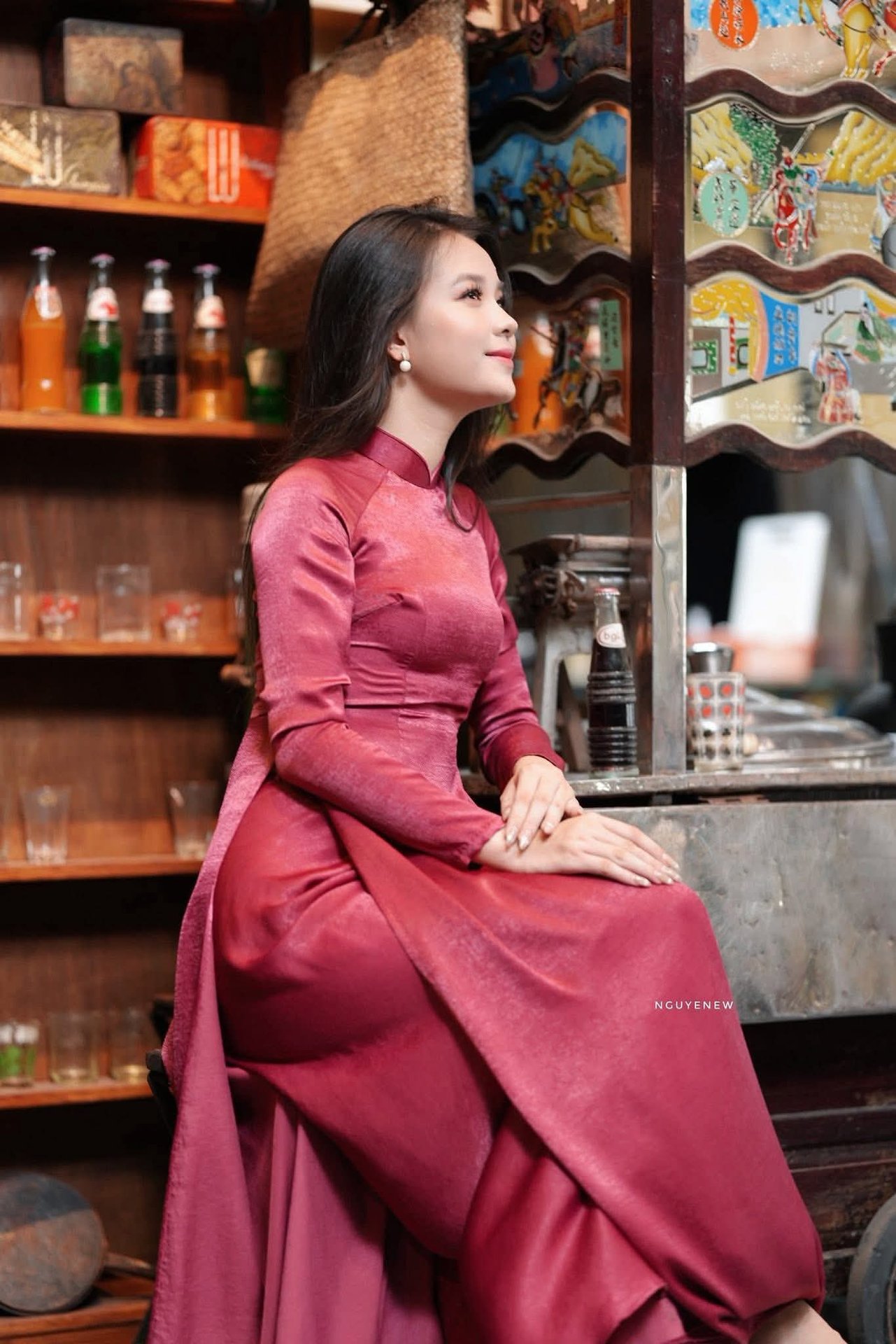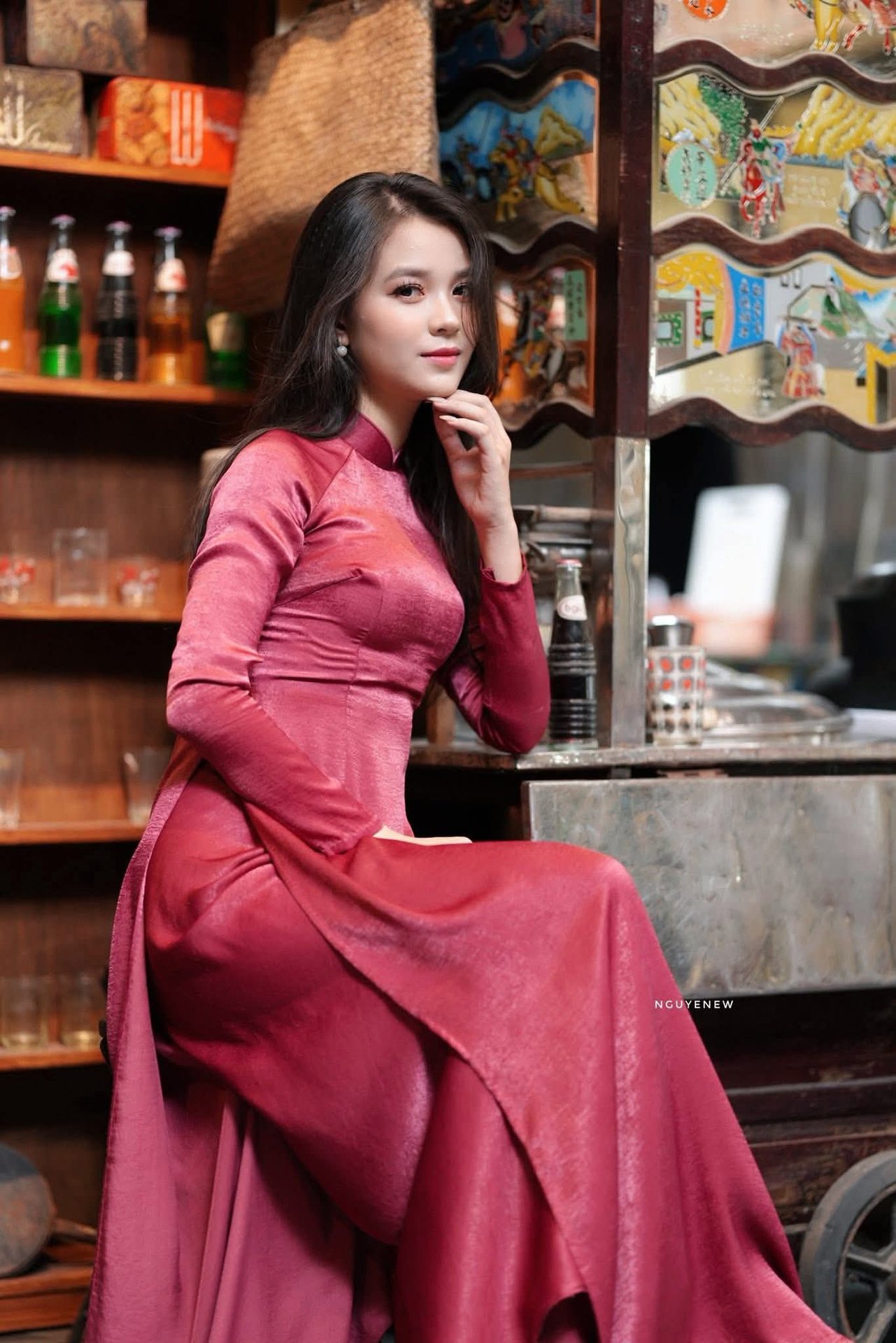 This photo captures a beautiful young Vietnamese woman dressed in a traditional earthy red Ao Dai, radiating elegance and grace. She is seated at a wooden table in the cozy ambiance of a cafe, holding an open book, her gaze gentle and forward. The soft Ao Dai fabric gracefully accentuates her figure, highlighting the unique charm of Vietnamese women. The harmonious blend of traditional attire and a modern setting creates a captivating image, reflecting a refined lifestyle and cultural appreciation. This portrayal not only symbolizes the essence of Asian beauty but also evokes a sense of peace and tranquility, inviting viewers to admire the timeless allure of the Ao Dai and the elegant demeanor of a Vietnamese girl.Captivating Asian Beauty in an Elegant Black Velvet Cheongsam