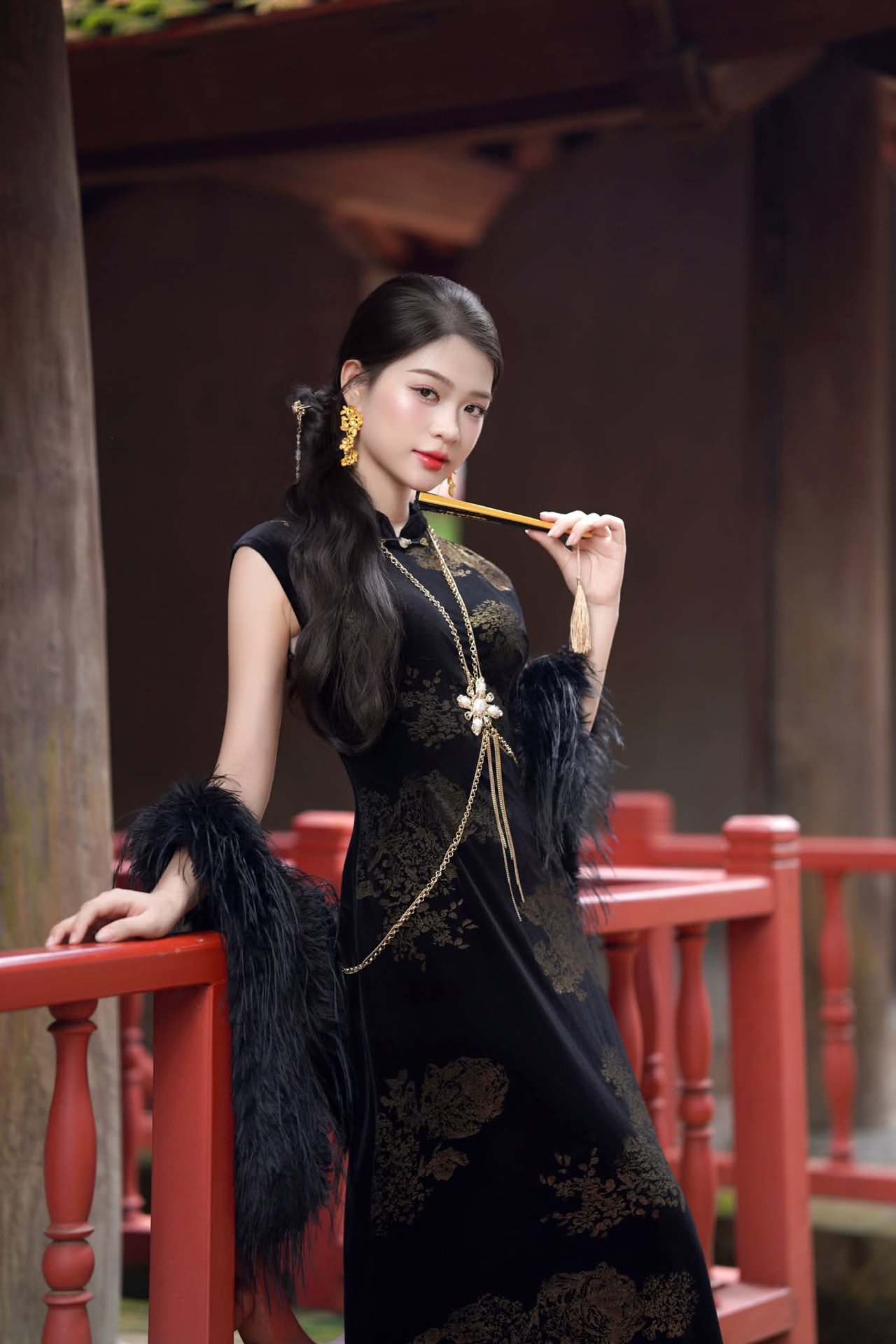 This captivating image features a graceful Asian woman adorned in a luxurious black velvet Cheongsam Qipao. The exquisite gold embroidery on the soft velvet fabric creates a stunning visual, evoking a sense of classic elegance and sophistication. Her serene expression long dark hair and the delicate fan she holds perfectly embody timeless Asian beauty and traditional charm. Posed against a backdrop of traditional architecture she represents a harmonious blend of cultural heritage and contemporary style. Every detail from her radiant gold earrings to the soft feather accents on her sleeves enhances her allure. This portrait is a celebration of enduring beauty and unique fashion inspiring admiration for both tradition and modernity.