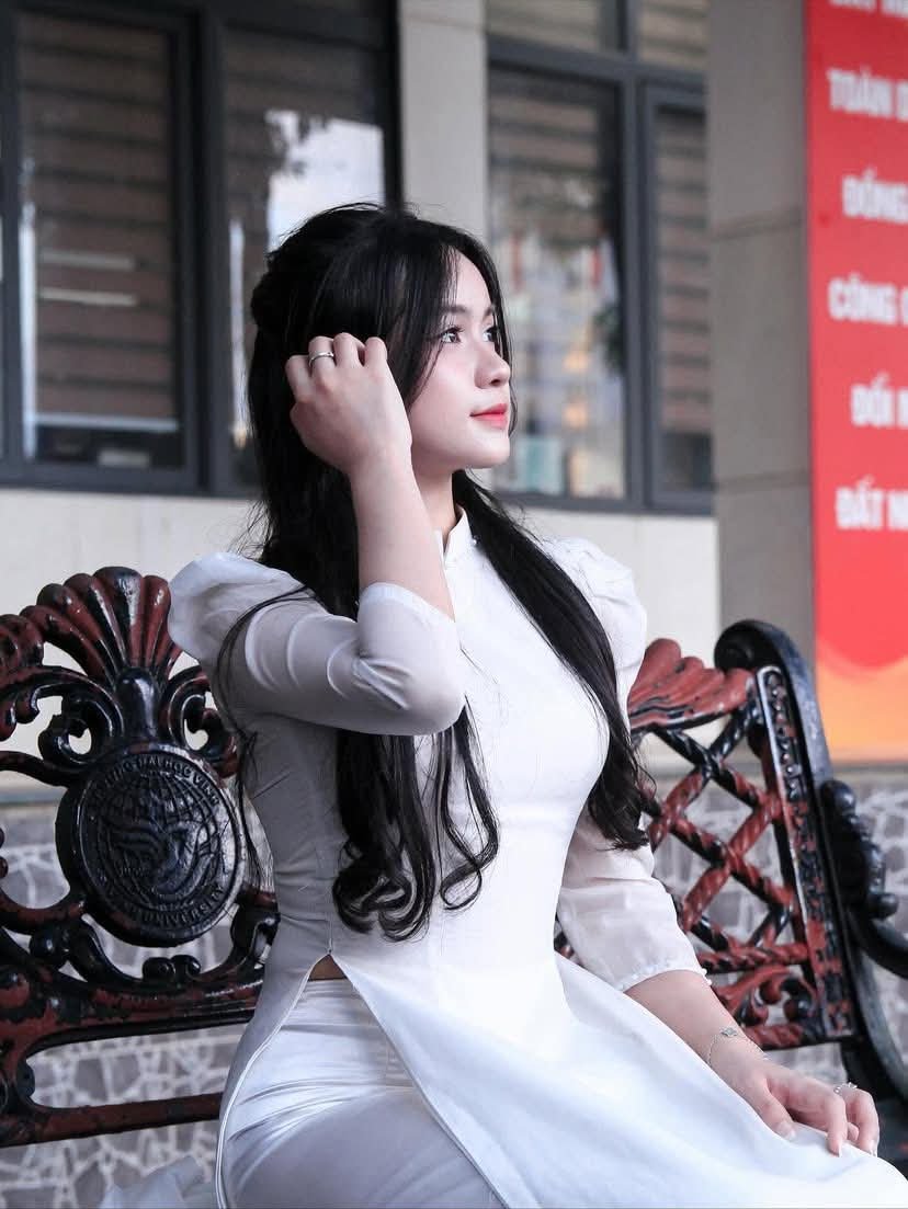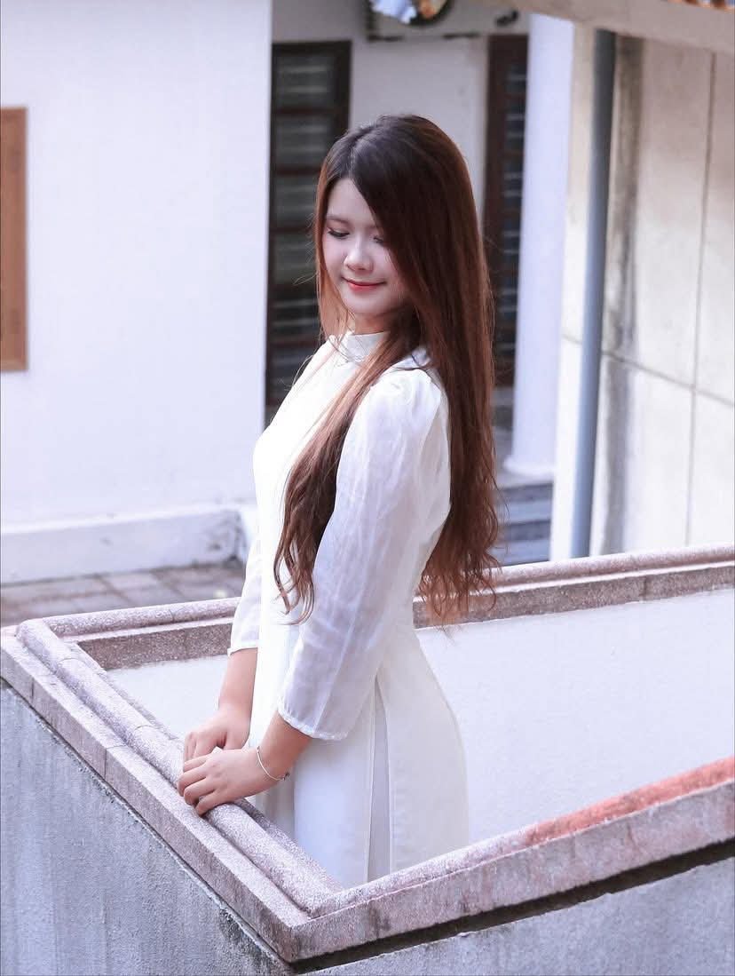 This photograph captures a gentle moment of a Vietnamese girl in a traditional Ao Dai. The light cream-colored Ao Dai gracefully embraces her slender figure, highlighting the elegant and charming beauty characteristic of Vietnamese women. With long flowing hair and a gentle smile, the girl exudes serenity and sophistication. The Ao Dai attire is not only a cultural symbol but also an embodiment of timeless beauty, combining modesty with subtle allure. This image is not just a portrait but also a story of national pride and Asian beauty preserved through generations. It evokes nostalgia and appreciation for traditional values.Artistic Portrait: Serene Beauty of a Woman 1000019799