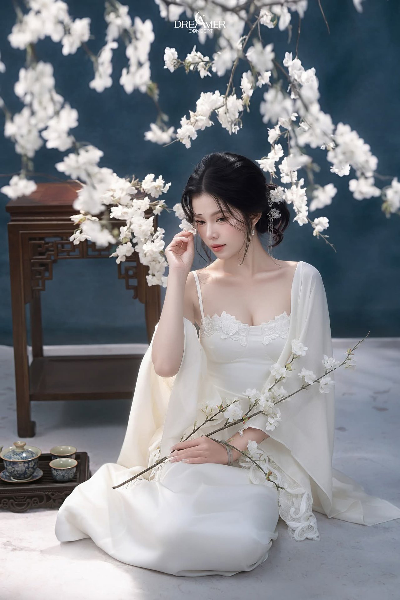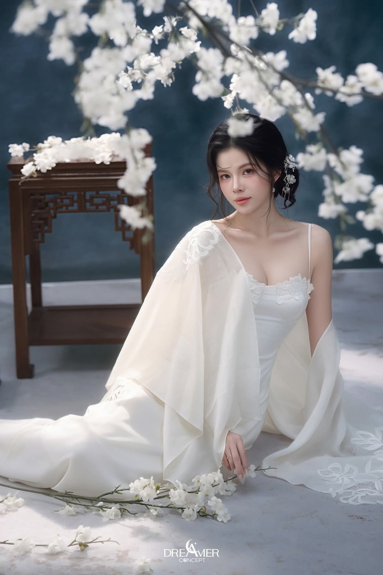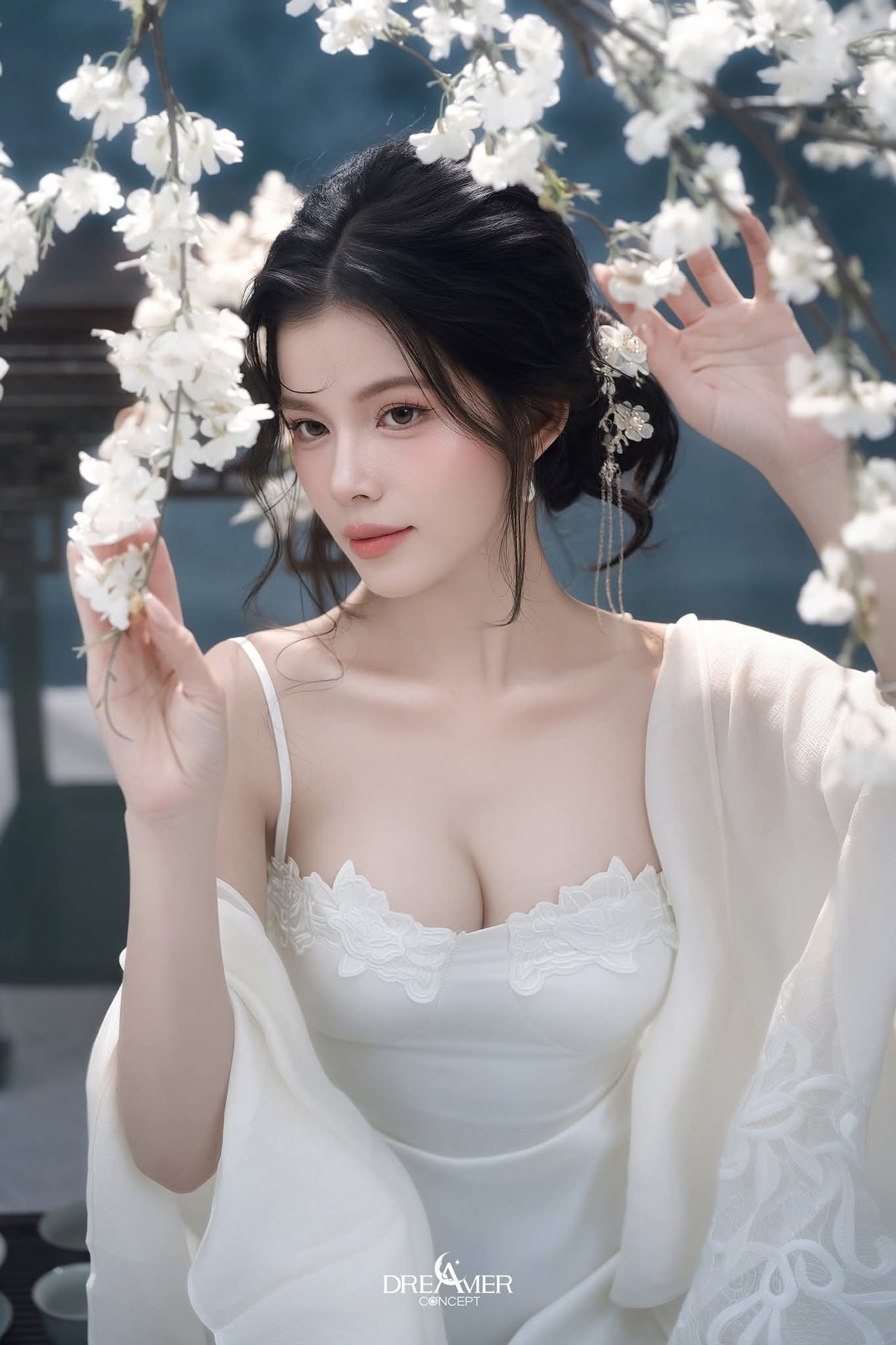 This exquisite photograph is a delicate work of art, celebrating the ethereal and pristine beauty of an Asian maiden. Dressed in a pure white gown, its soft fabric and classic design create a graceful, almost otherworldly presence. Surrounding her are branches adorned with pristine white blossoms, resembling falling snow, which craft a magical and romantic tableau. The maiden's serene gaze and gentle demeanor seamlessly blend with the setting, exuding a dreamy elegance and profound sense of peace. More than just a portrait, this image tells a story of innocence, timeless beauty, and the captivating allure of traditional Asian aesthetics, destined to enchant every viewer.Elegant Vietnamese Girl on Red Lantern Street: Captivating Style & Cultural Charm