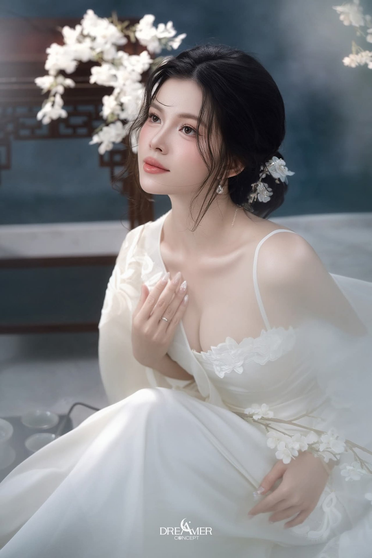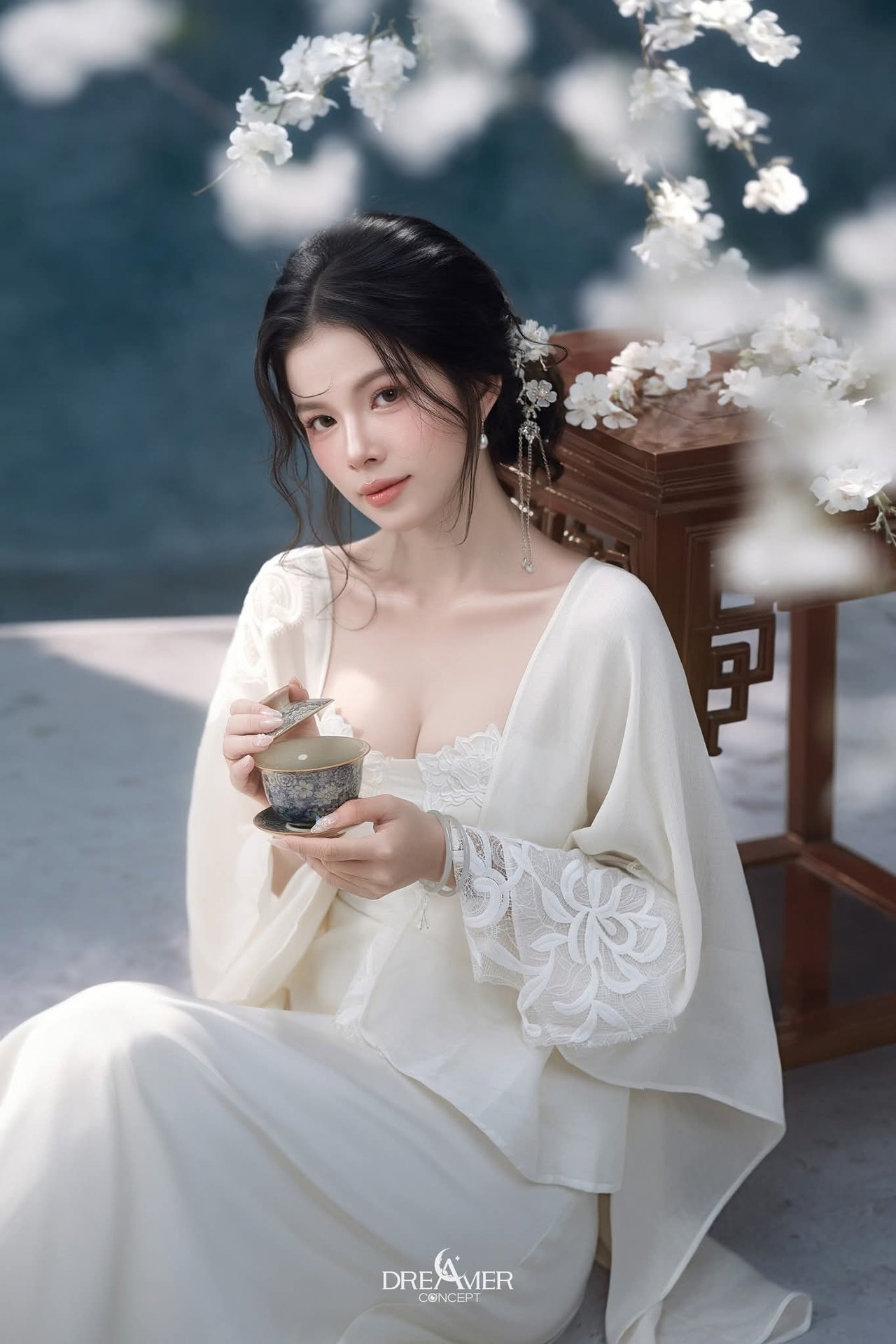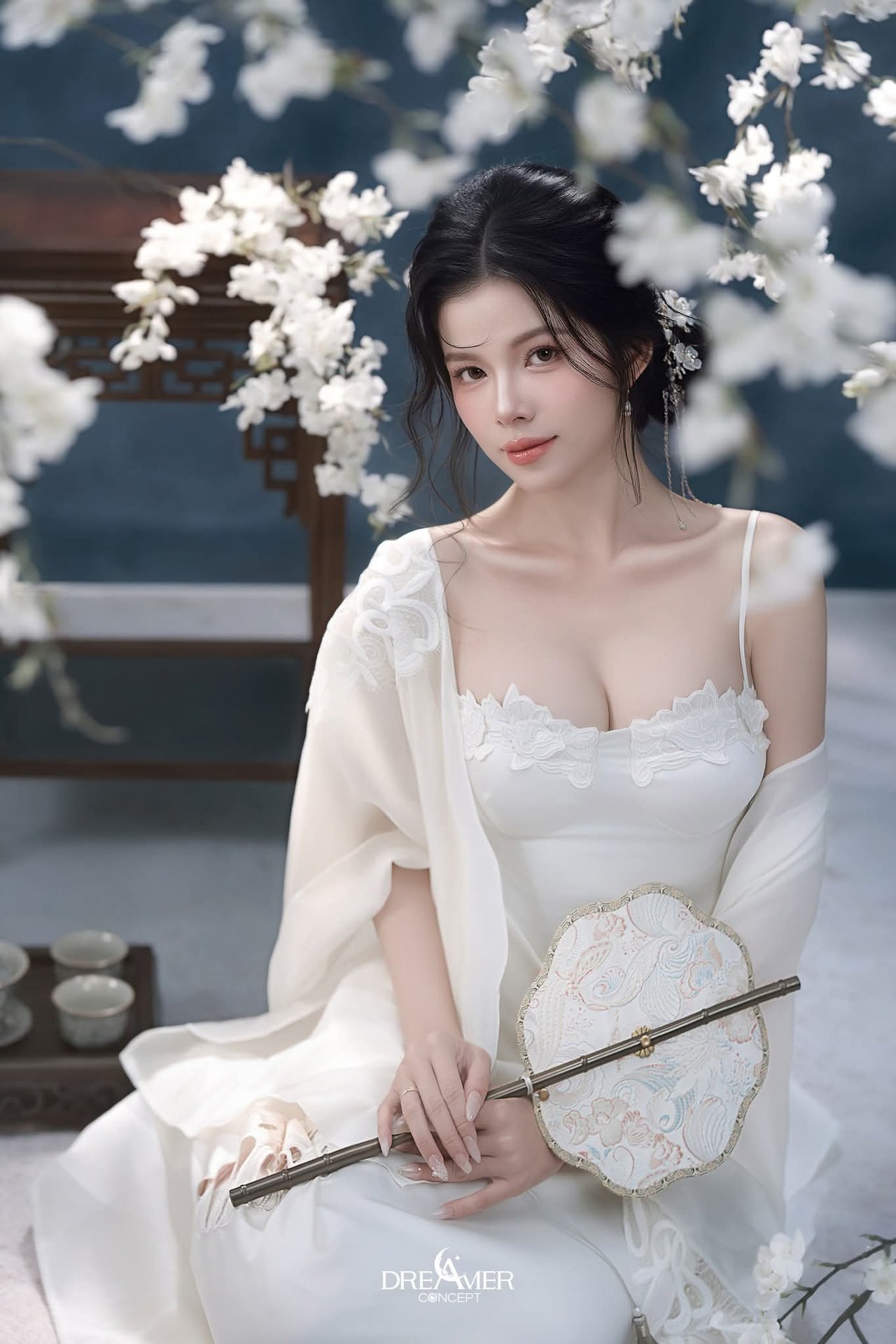This exquisite photograph is a delicate work of art, celebrating the ethereal and pristine beauty of an Asian maiden. Dressed in a pure white gown, its soft fabric and classic design create a graceful, almost otherworldly presence. Surrounding her are branches adorned with pristine white blossoms, resembling falling snow, which craft a magical and romantic tableau. The maiden's serene gaze and gentle demeanor seamlessly blend with the setting, exuding a dreamy elegance and profound sense of peace. More than just a portrait, this image tells a story of innocence, timeless beauty, and the captivating allure of traditional Asian aesthetics, destined to enchant every viewer.Elegant Vietnamese Girl on Red Lantern Street: Captivating Style & Cultural Charm