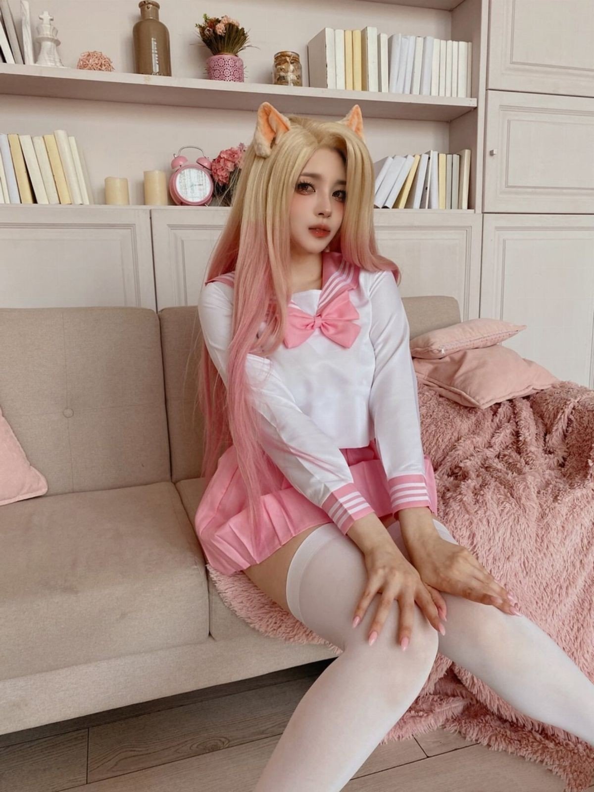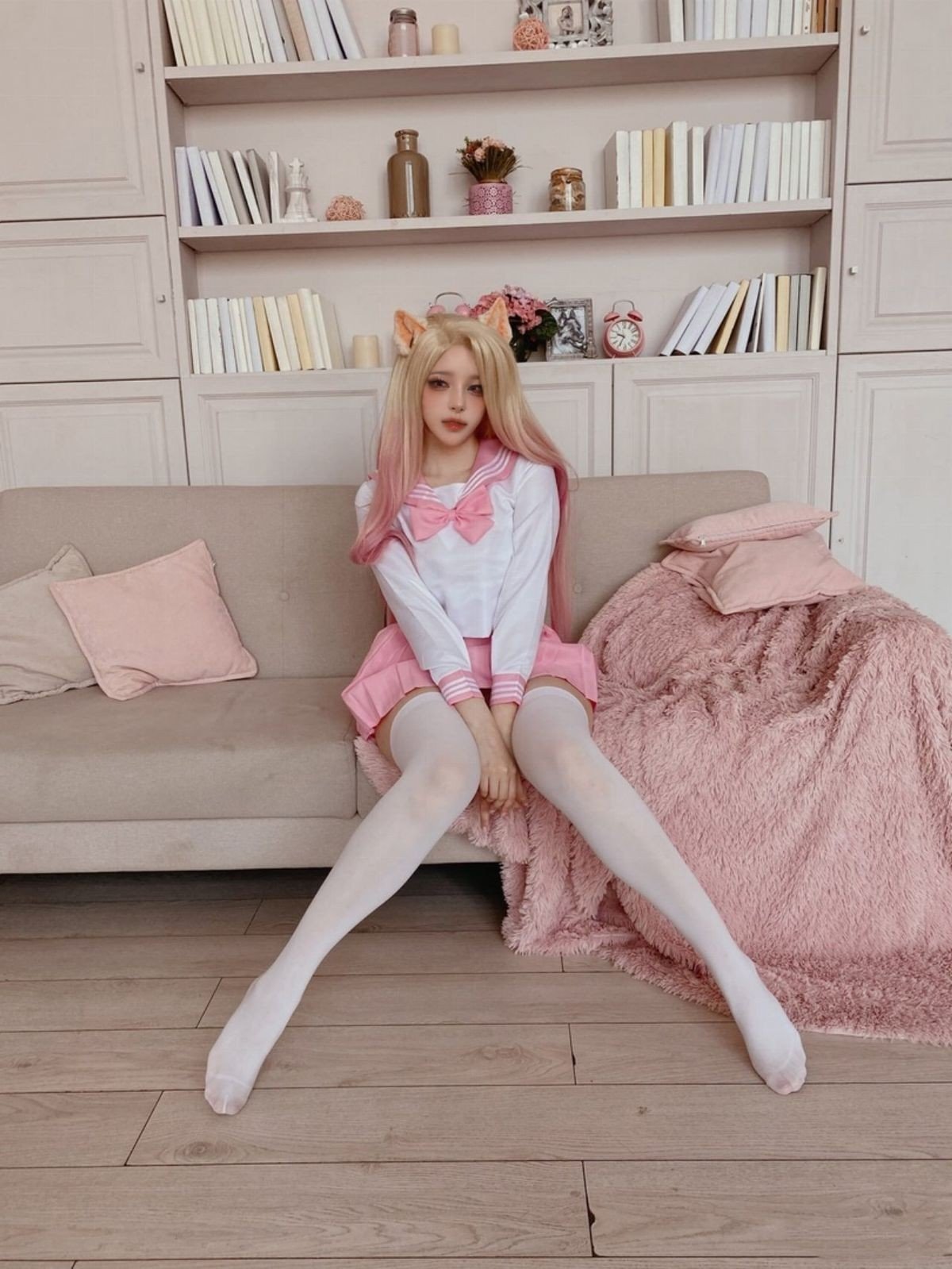 Discover the enchanting charm of Coser Bao Zou Li Yu Wang in her 12月合集 Part09 collection She embodies a delightful schoolgirl persona adorned in a sweet pink and pristine white sailor uniform The meticulously designed outfit features an adorable bow and playful cat ears enhancing her captivating cuteness Elegant white thigh-high stockings further accentuate her graceful silhouette and signature kawaii style Set against a cozy living room backdrop with a bookshelf this scene perfectly complements Bao Zou Li Yu Wangs vibrant and youthful allure This photoshoot beautifully captures her exquisite costume choice and graceful expressive ability offering viewers a delightful and emotionally resonant visual experience