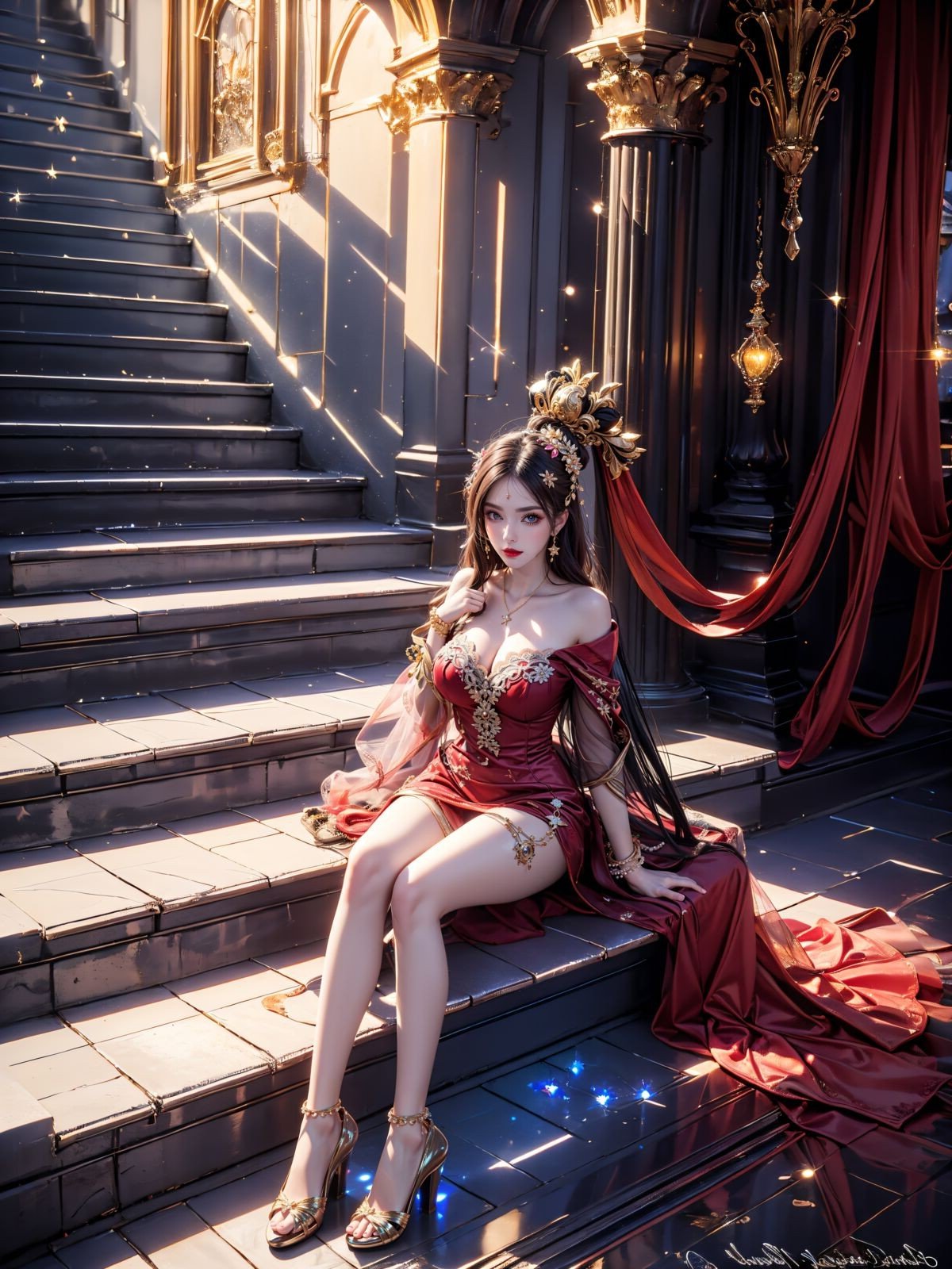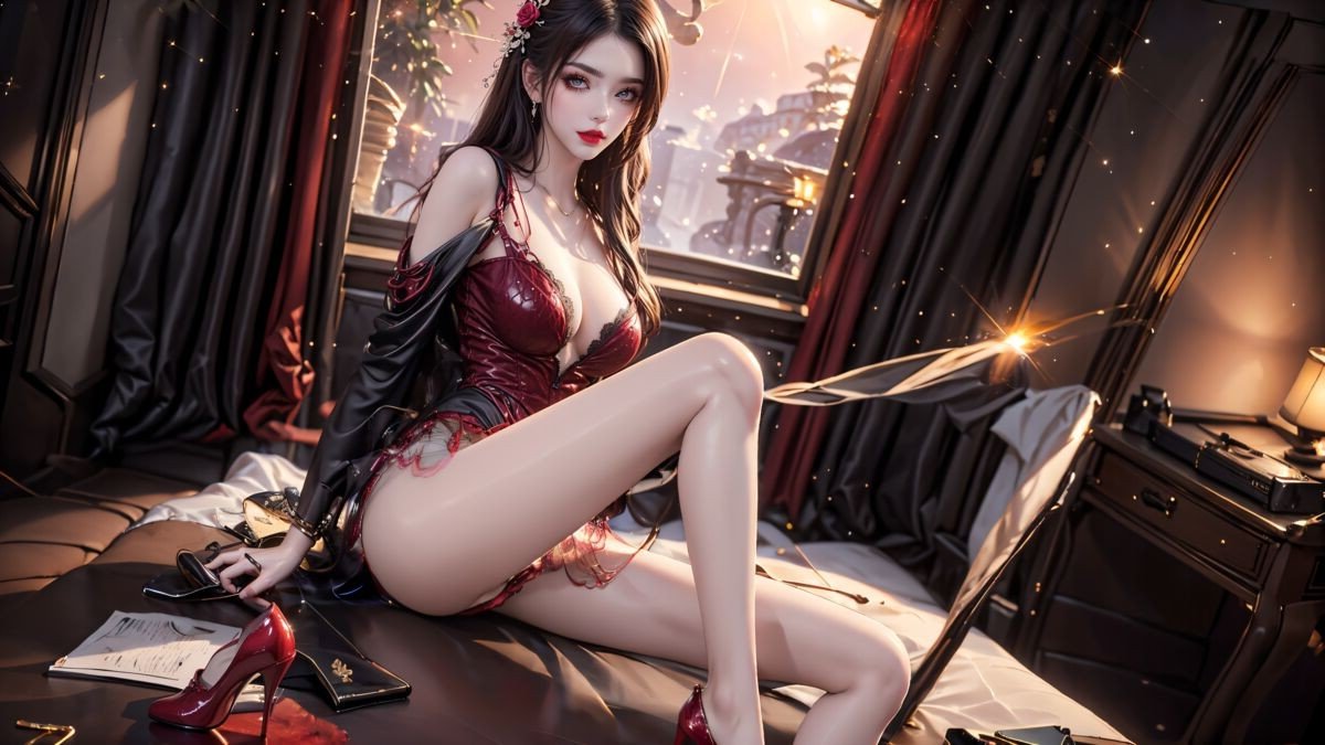 This stunning AI Generated image portrays the character Ye Weiyang from the Throne of Seal series within a magical moonlit setting She wears a vibrant traditional red attire adorned with exquisite gold patterns and a sparkling gem Ye Weiyang's gentle yet alluring East Asian beauty shines brightly amidst the ancient oriental architecture and serene water The full moon casts its radiant glow creating a romantic and captivating atmosphere This artwork perfectly blends AI technology with traditional art presenting a Ye Weiyang who is both familiar and refreshingly new full of charm and allure