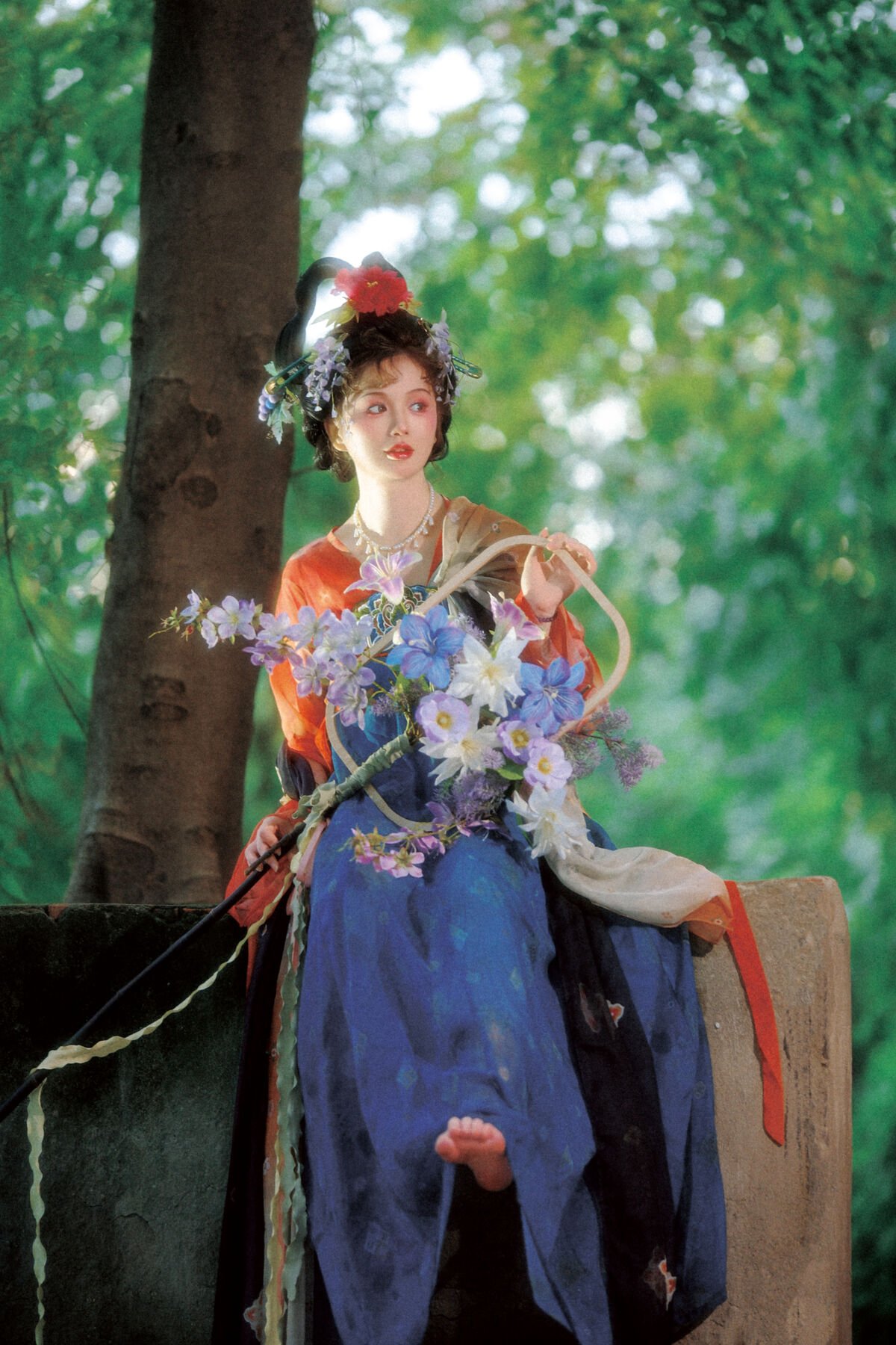 This exquisite photograph captures the muse 童毅 Tong Yi in a sophisticated traditional Chinese costume. She radiates a serene and gentle beauty with her elaborate high bun adorned with vibrant flowers and a subtle smile. Every detail from the orange and blue garments to the bouquet she holds is harmoniously coordinated creating an artistic masterpiece. More than just a typical cosplay image this is a vivid recreation of classical aesthetics offering a sense of tranquility and allure. The blend of the lush green natural backdrop and traditional attire highlights Tong Yi's graceful and romantic charm. This piece from the YiTuYu艺图语 Vol.8305 series showcases meticulous dedication to photographic art and costume design providing an impressive visual experience.