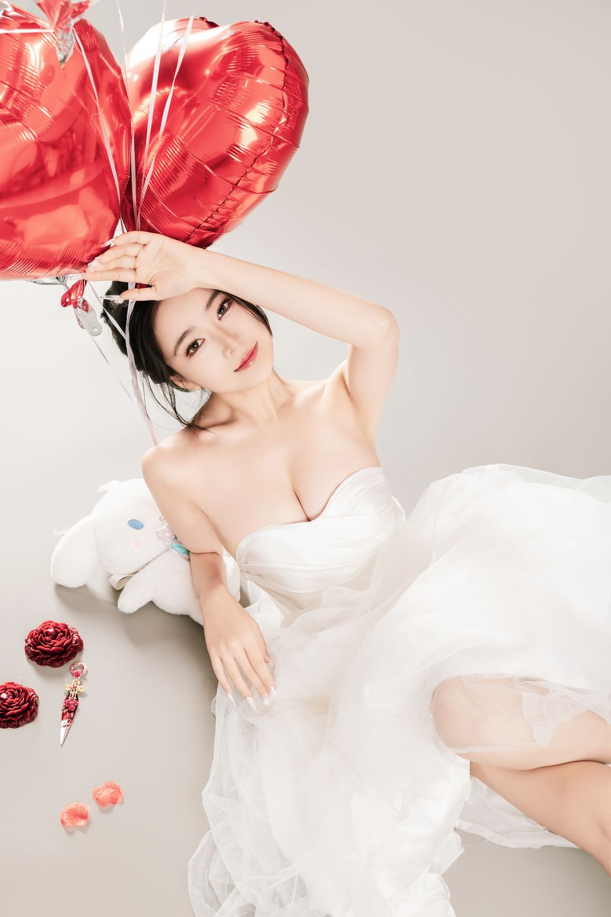 Coser Nnian's special Valentine's Day photoshoot unveils a captivating and elegant beauty Dressed in a pristine white flowing gown paired with unique patterned socks she exudes irresistible charm and sophistication Clusters of vibrant red and shimmering silver heart balloons symbolize passionate and romantic love adding a sweet touch to the composition Her gentle gaze and graceful pose full of expression make Nnian the undeniable focal point Every detail from the lighting to the artistic arrangement is meticulously crafted creating a photographic masterpiece that captures tender and emotional moments centered around the theme of love Explore the enchanting allure of Nnian in this exclusive photo series