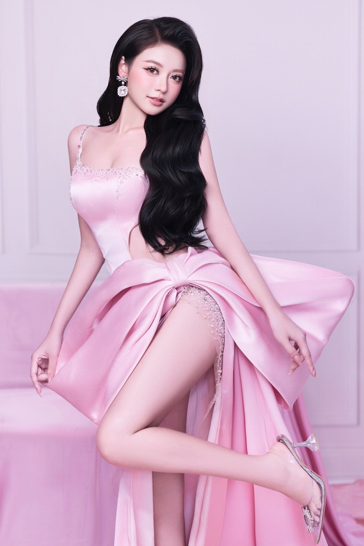 Celebrating her special birthday, the stunning hot girl Thu Trang radiates with a captivating and sweet photoshoot. She exudes elegant and seductive beauty, gracefully adorned in a delicate pink satin dress. Every frame perfectly captures her gentle yet undeniably alluring charm. Her remarkably long legs are a striking focal point, creating an irresistible allure that commands attention. This beautiful imagery serves not just as a birthday greeting, but also as a powerful statement of timeless style and enchanting beauty. The harmonious blend of the pastel pink setting and her exquisite attire crafts a dreamy and luxurious aesthetic, truly captivating all who behold it. This collection marks a memorable milestone in her glamorous journey.