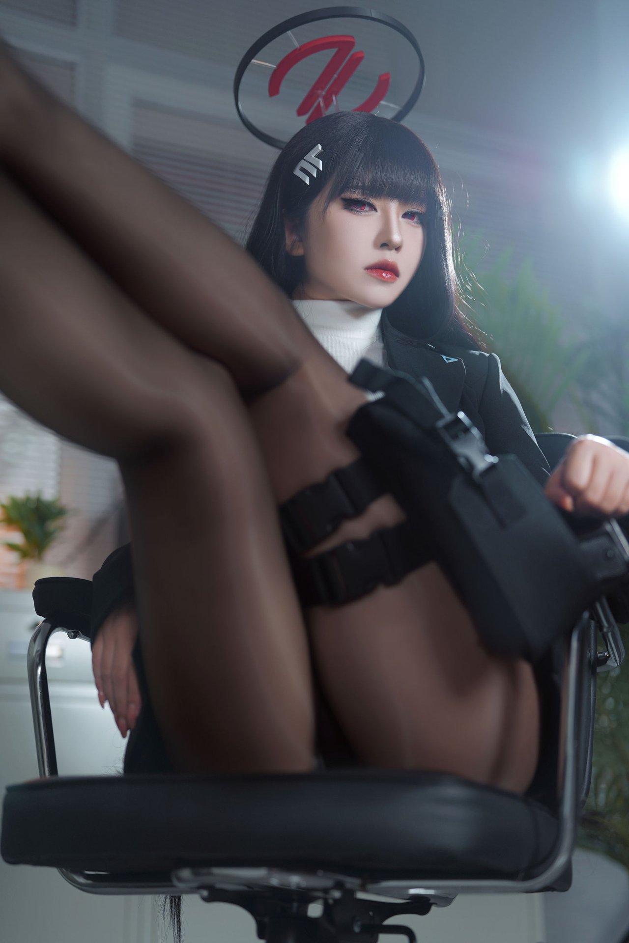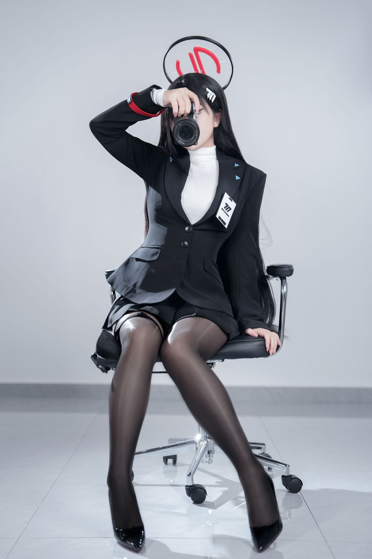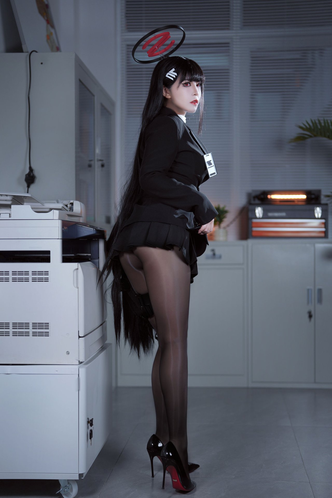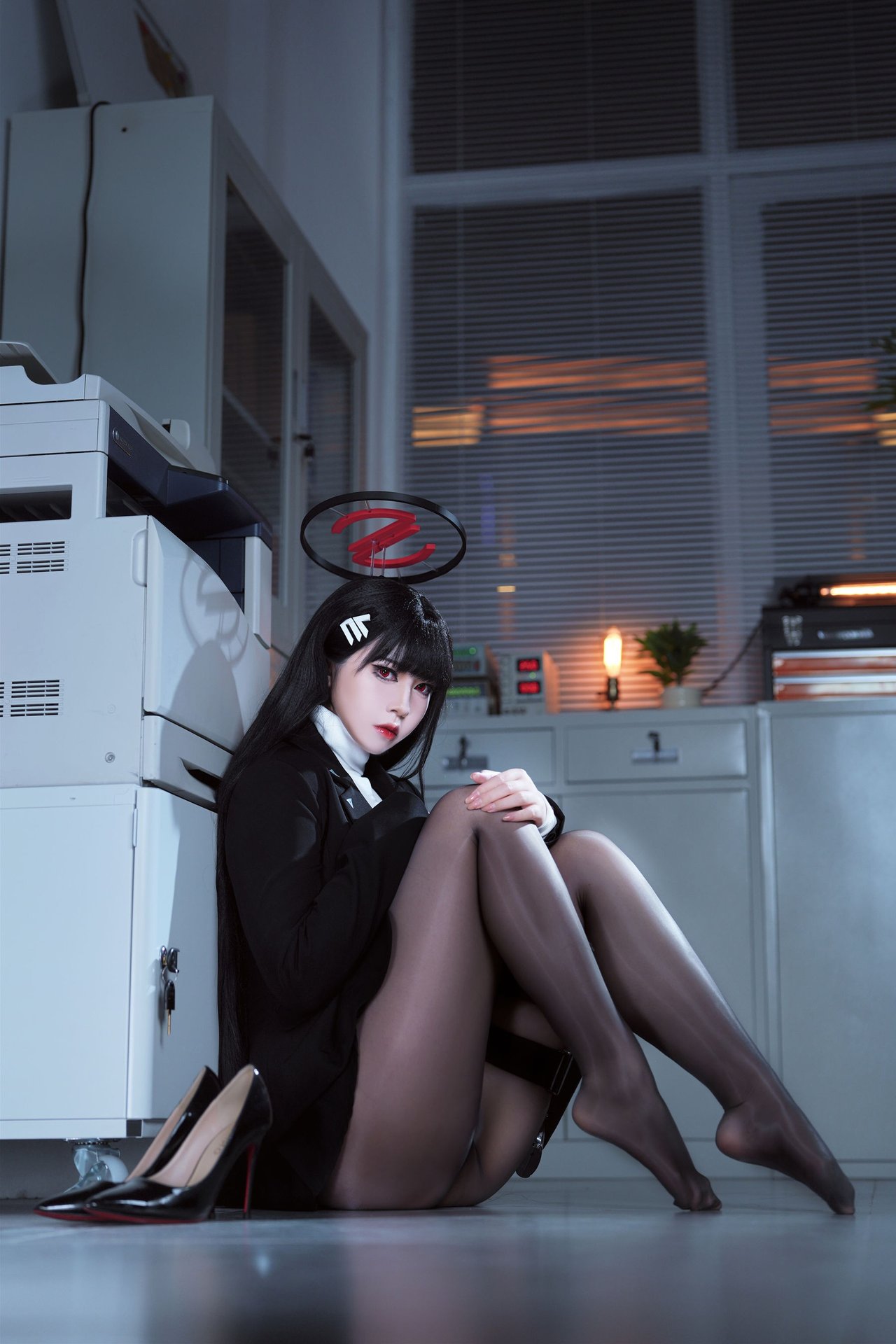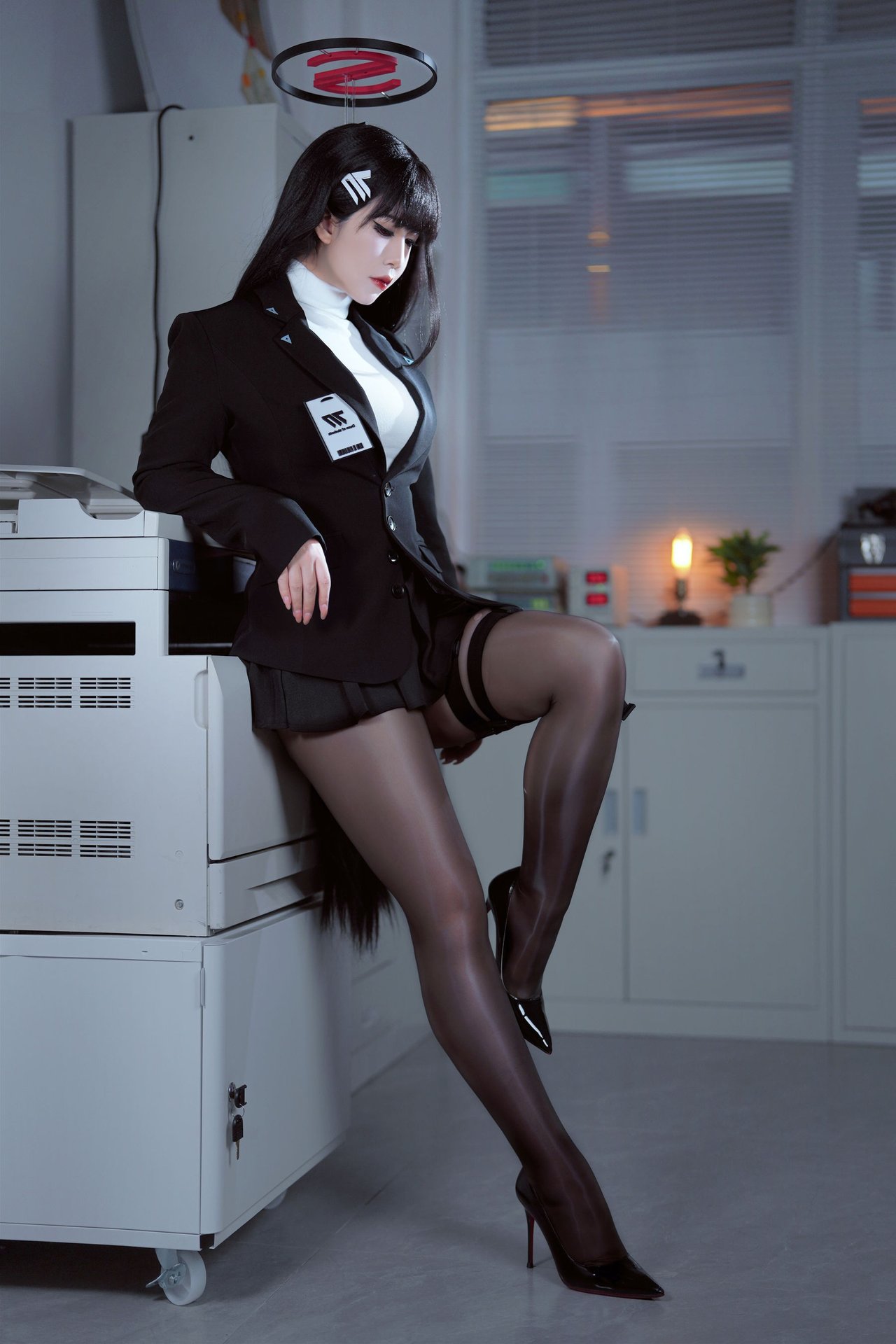 Immerse yourself in the world of Blue Archive with this outstanding cosplay of Tsukigami Rion by cosplayer Banbanzi. The image offers a captivating view of the character in an elegant black office uniform, paired with a pristine white shirt. Prominently featured are the mysterious black stockings, embracing her legs, creating a look that is both professional and alluring. With a confident demeanor and sharp gaze, Banbanzi's Tsukigami Rion sits in a familiar office setting next to a photocopier, forming a scene rich in depth and emotion. This impressive cosplay showcases meticulous attention to detail in both costume and character portrayal.