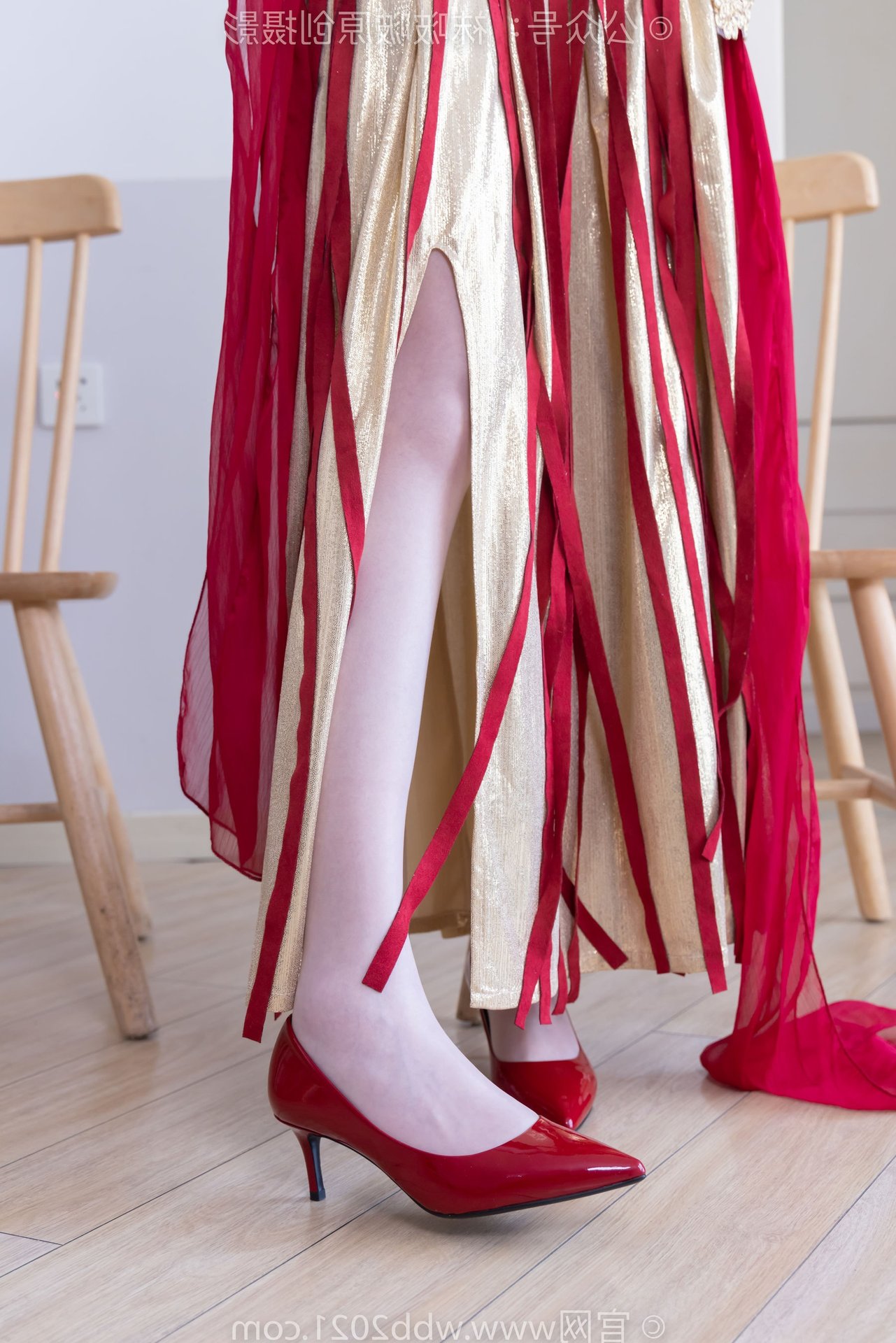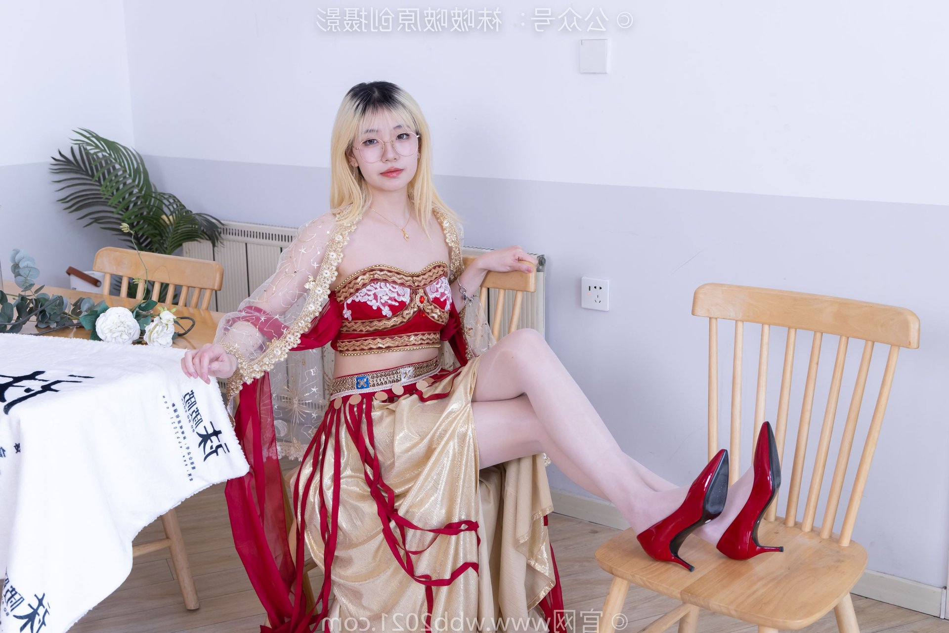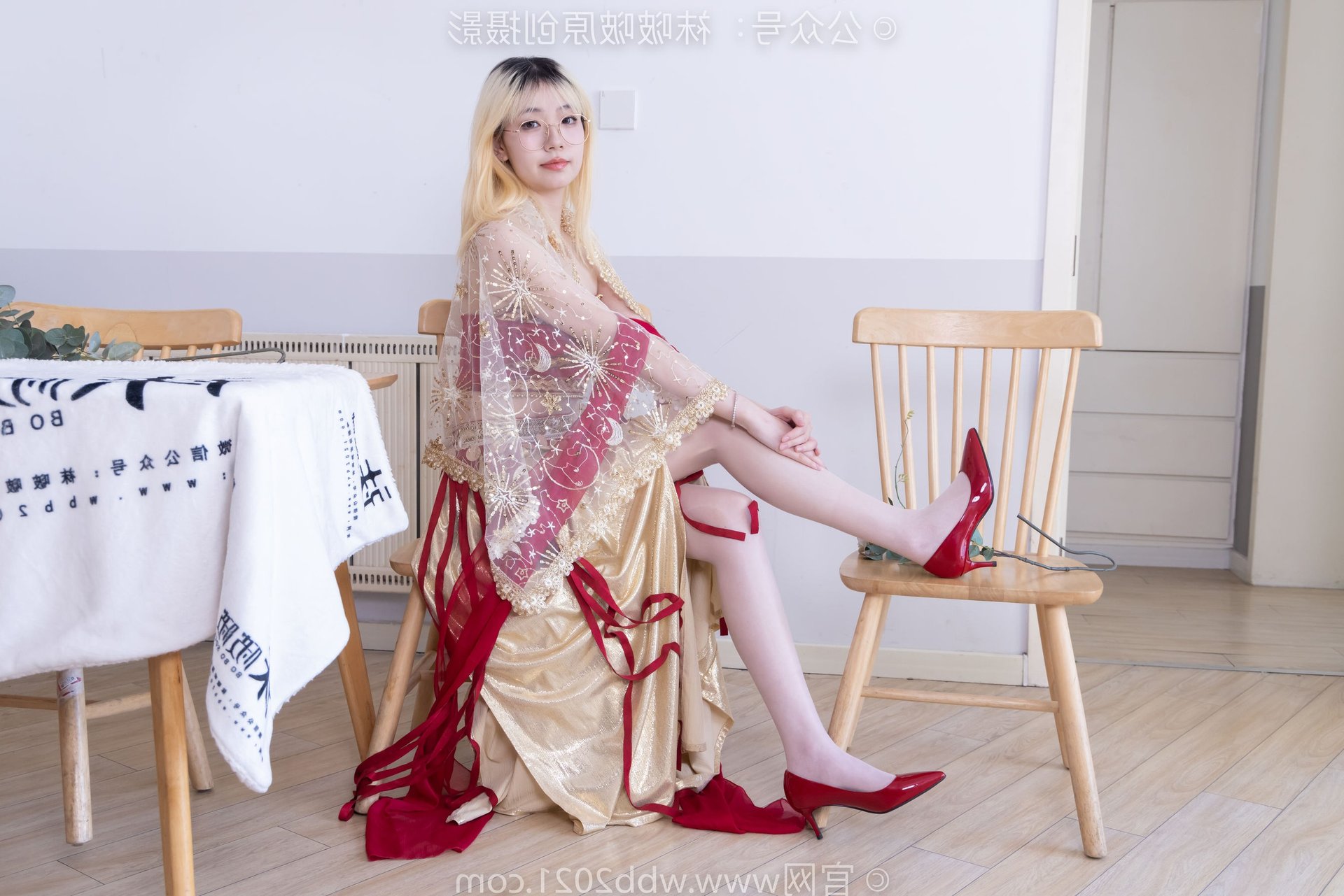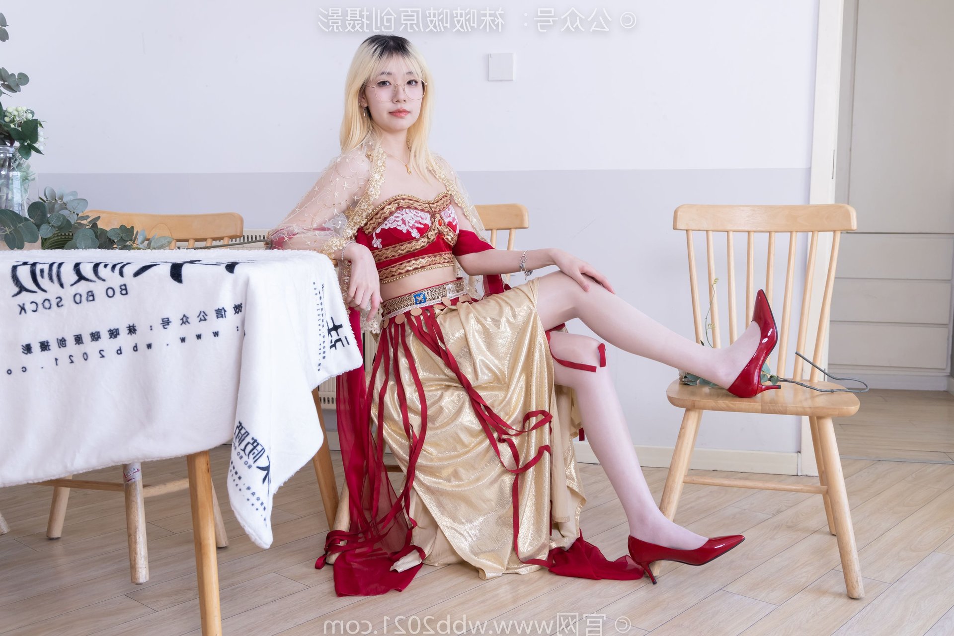 Admire the captivating beauty of BoBoSock Model No.540, a stylish East Asian fashion icon. In this photo, she shines in a splendid outfit, a delicate combination of vibrant red and shimmering gold, evoking traditional cultural elements yet remaining very modern. Her striking blonde hair and confident, alluring demeanor while posing on the wooden chair, with bright red high heels further enhancing her prominence. The minimalist background completely highlights her beauty and elegant style. This is not just a fashion photo but also an expression of confidence and unique personality.Stories