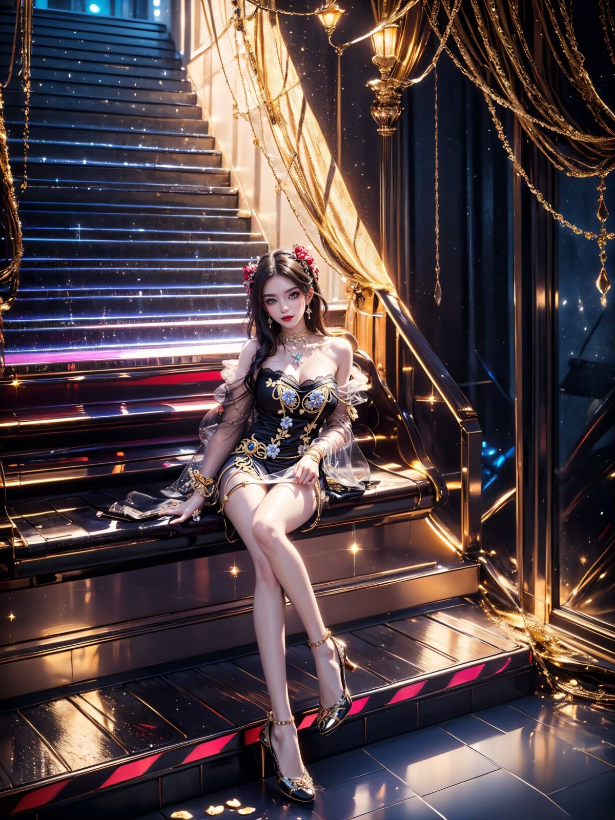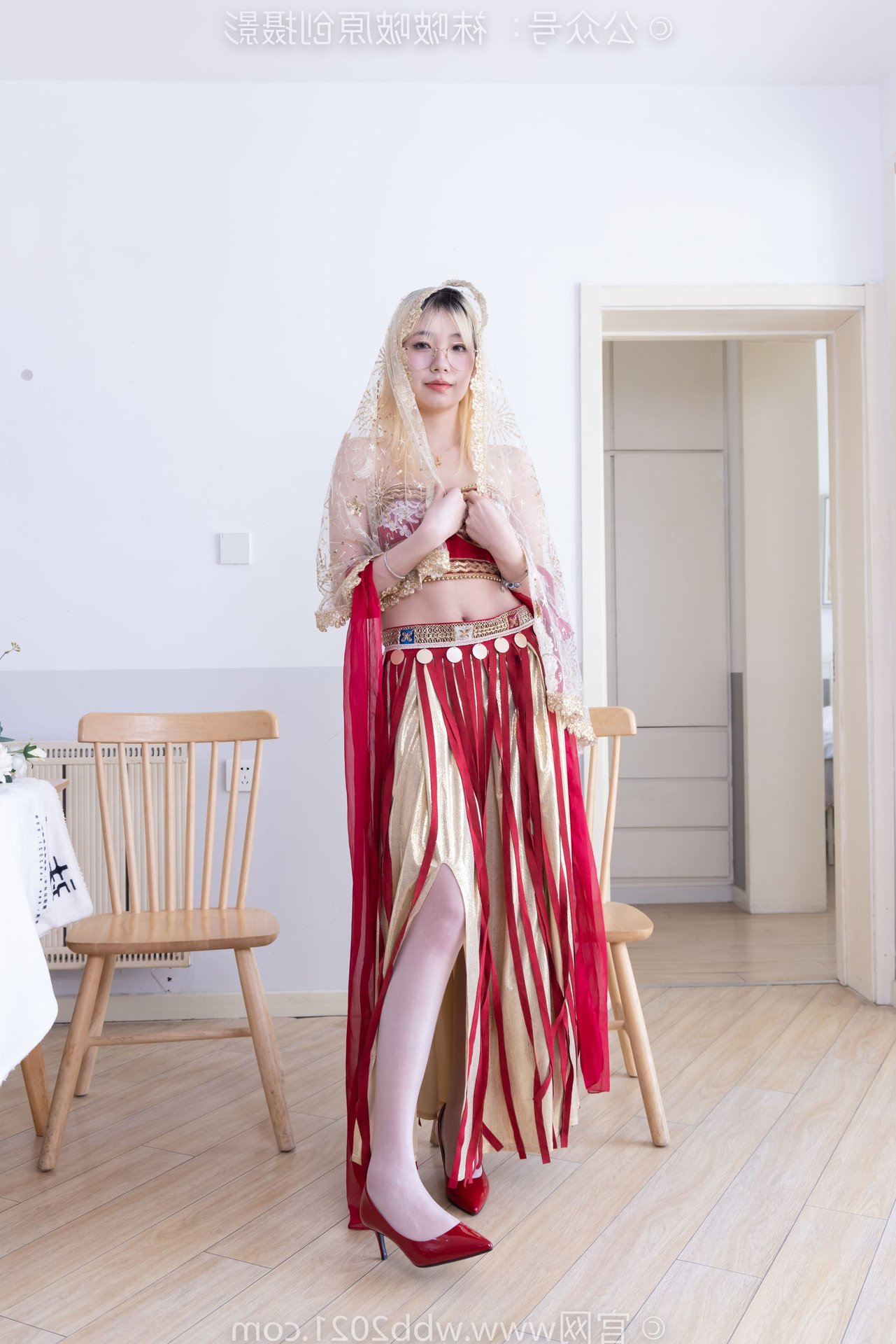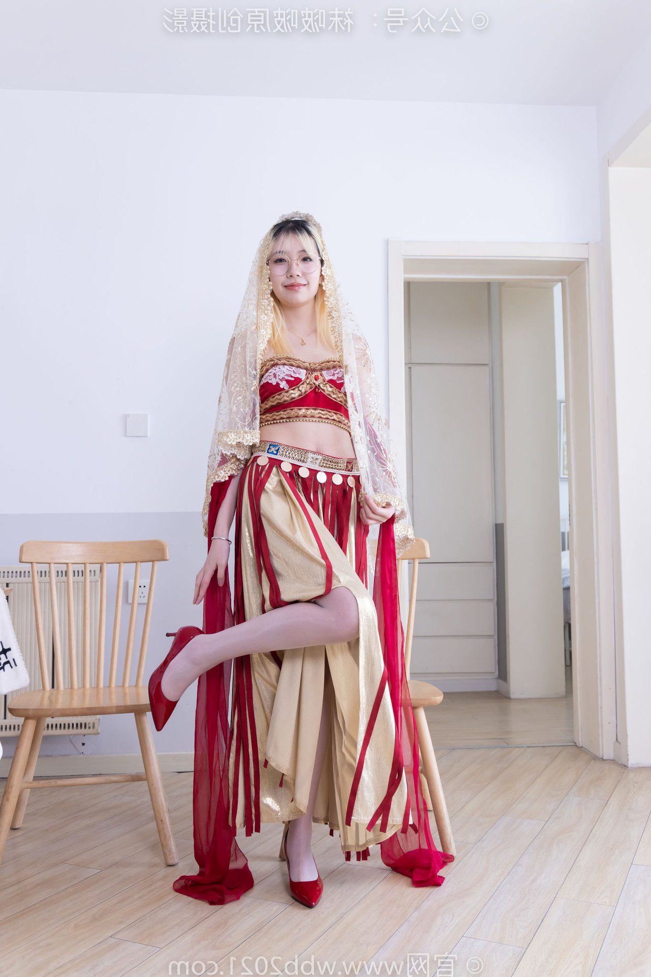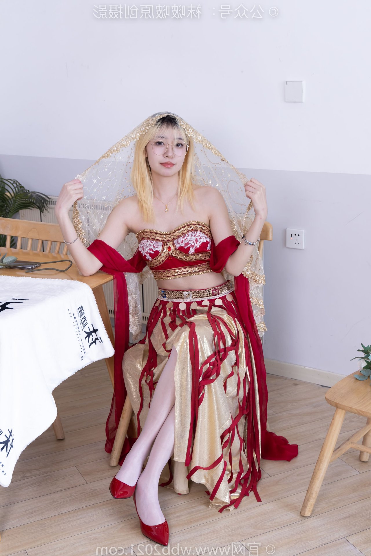 Admire the captivating beauty of BoBoSock Model No.540, a stylish East Asian fashion icon. In this photo, she shines in a splendid outfit, a delicate combination of vibrant red and shimmering gold, evoking traditional cultural elements yet remaining very modern. Her striking blonde hair and confident, alluring demeanor while posing on the wooden chair, with bright red high heels further enhancing her prominence. The minimalist background completely highlights her beauty and elegant style. This is not just a fashion photo but also an expression of confidence and unique personality.Stories