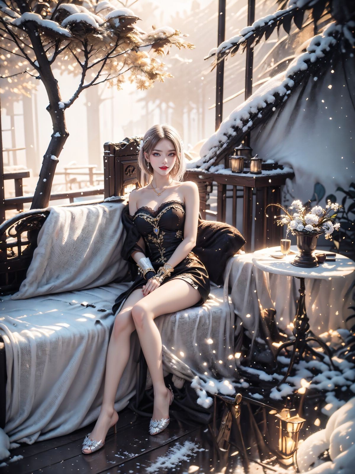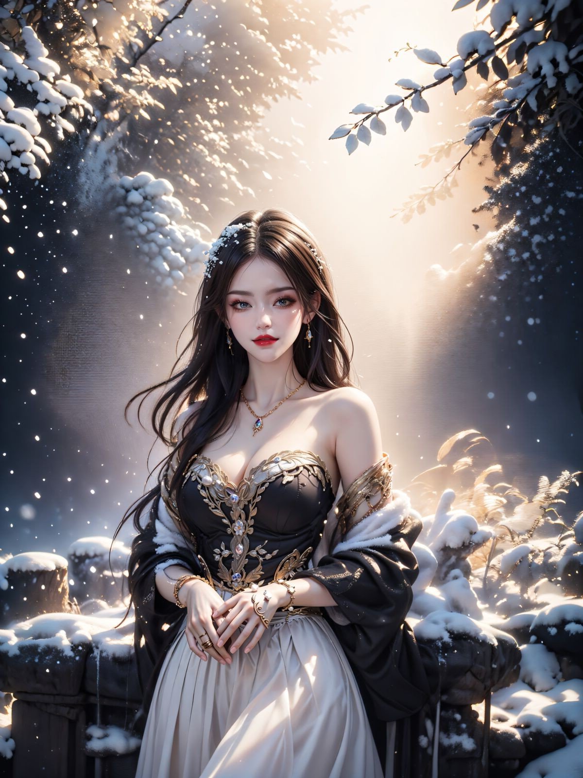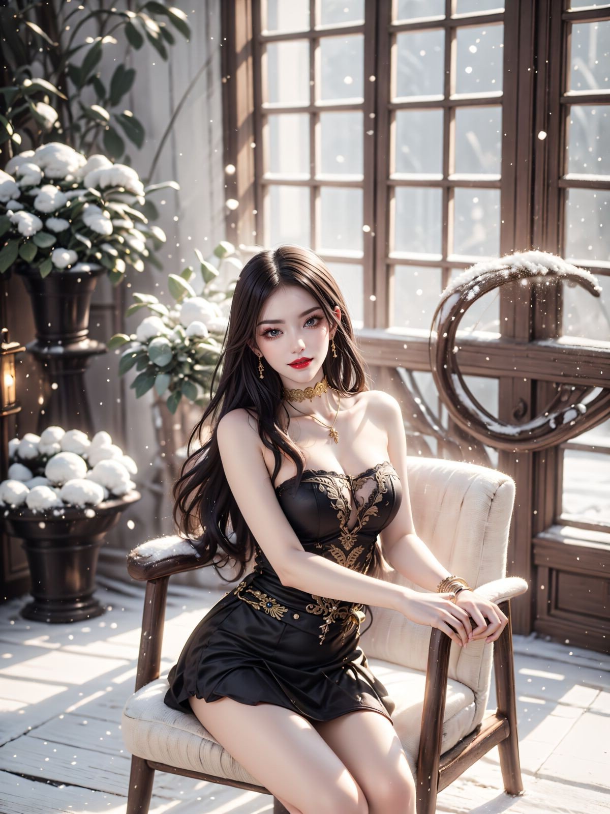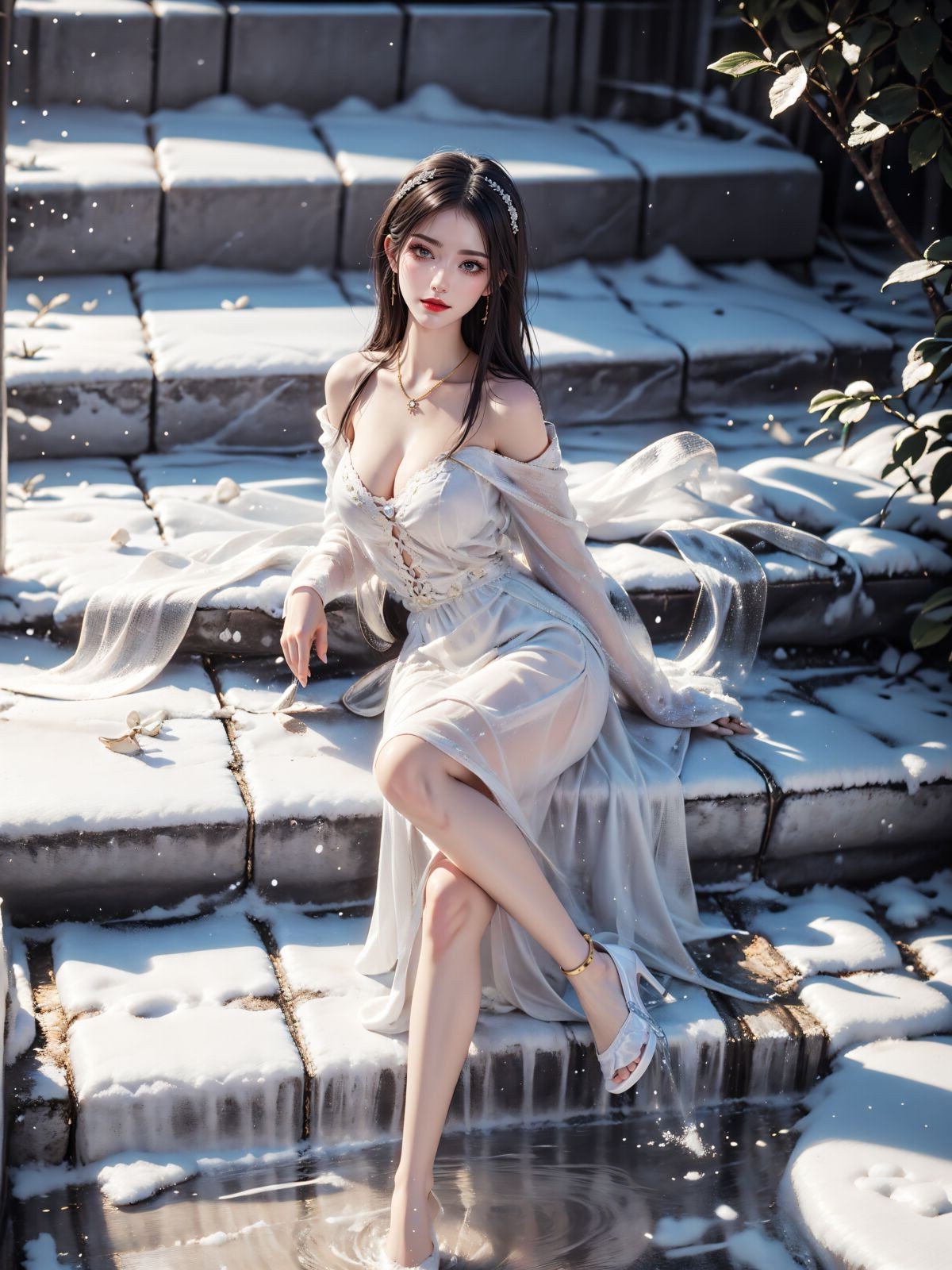 This stunning AI generated artwork features the captivating Medusa from Battle Through the Heavens. She is portrayed with an alluring and enchanting beauty sitting gracefully on snow covered stone steps. Her pristine white dress elegantly drapes her slender figure enhancing her ethereal and mystical charm. Long dark flowing hair and deep expressive eyes convey the mystery and power of the serpent queen. Despite the icy and cold surroundings Medusa maintains a serene demeanor exuding an undeniable allure. This is a masterful piece of AI art bringing the character vividly to life as if stepping directly from a fantasy realm. Medusas beauty amidst the winter landscape creates a striking contrast that captures every gaze.