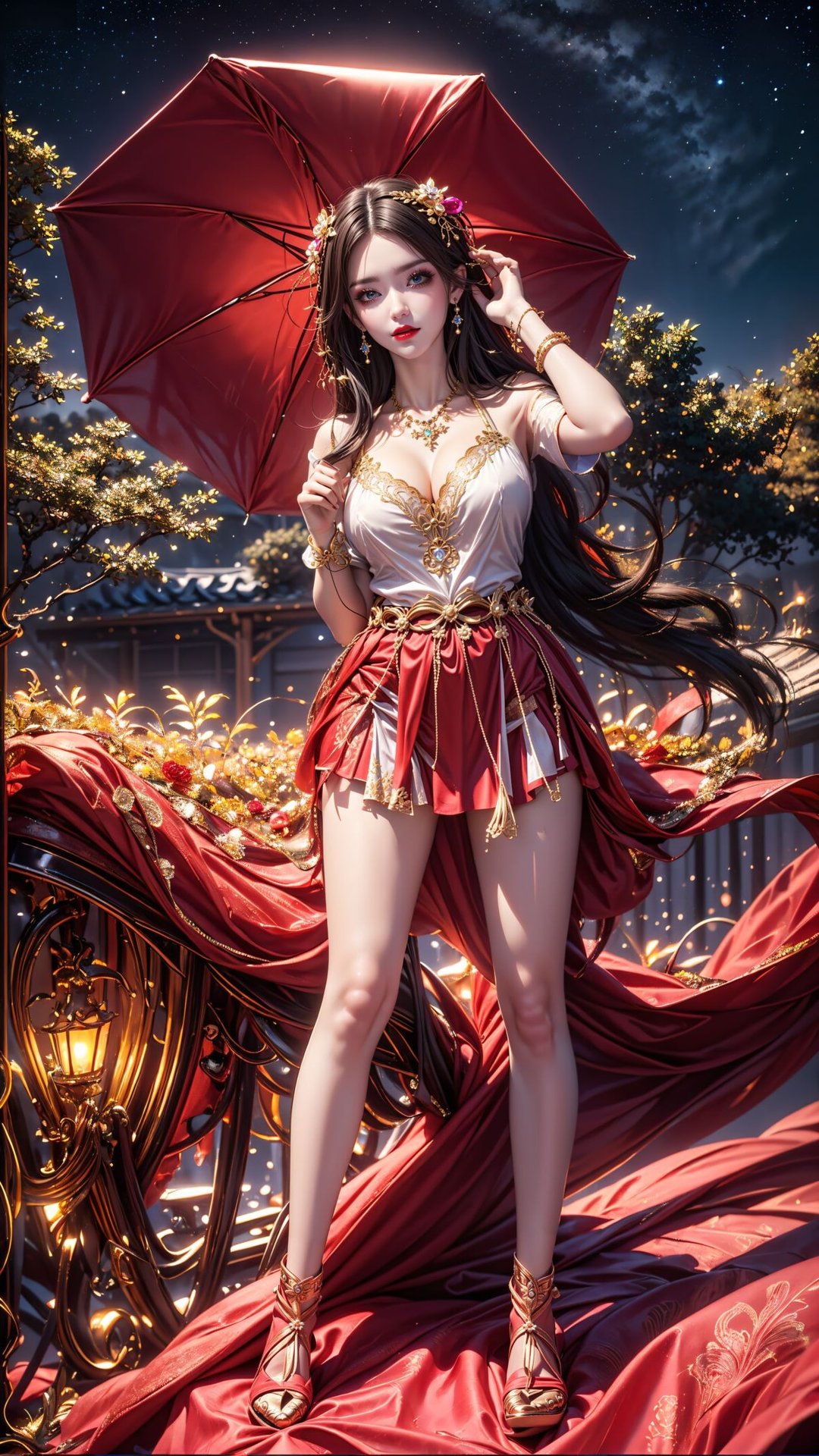 This stunning AI Generated image portrays the character Ye Weiyang from the Throne of Seal series within a magical moonlit setting She wears a vibrant traditional red attire adorned with exquisite gold patterns and a sparkling gem Ye Weiyang's gentle yet alluring East Asian beauty shines brightly amidst the ancient oriental architecture and serene water The full moon casts its radiant glow creating a romantic and captivating atmosphere This artwork perfectly blends AI technology with traditional art presenting a Ye Weiyang who is both familiar and refreshingly new full of charm and allure