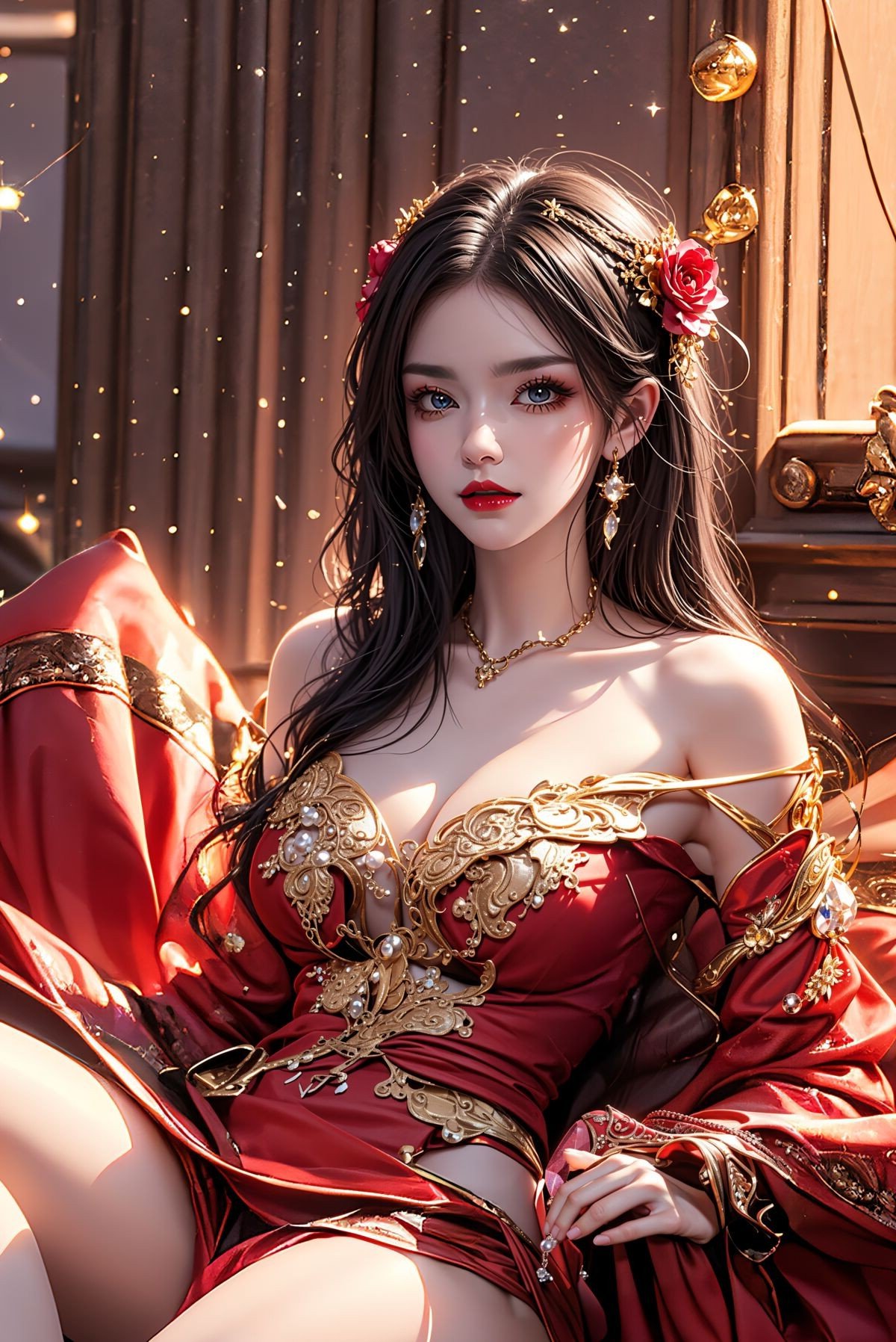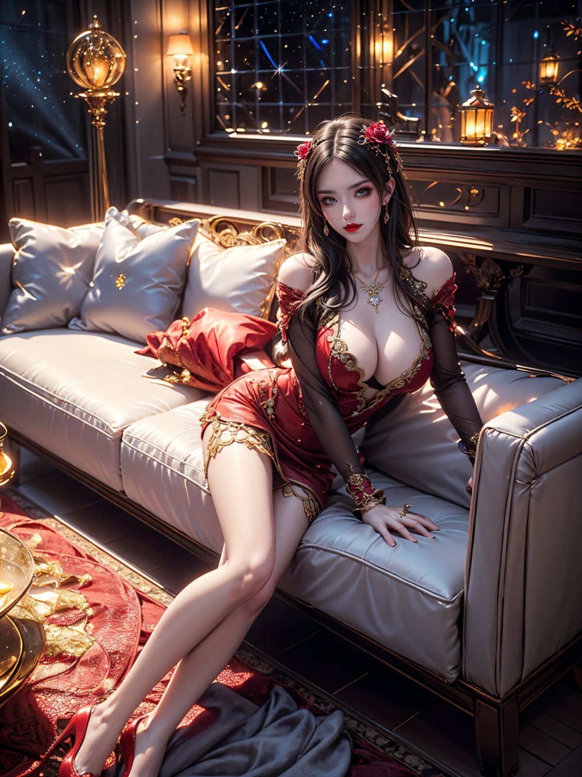 This stunning image captures an alluring goddess with exquisite beauty and elegance. The woman stands out in a form-fitting red bodysuit, accentuating her captivating curves and confident demeanor. The vibrant red hue of her attire not only makes her prominent but also exudes an irresistible charm. With mesmerizing eyes and a delicate gesture, she emanates the aura of a powerful and enchanting woman. This emotional frame perfectly combines gracefulness, boldness, and physical beauty. The red bodysuit is not just an outfit but a symbol of her confidence and strong personality. A true visual masterpiece, attracting every gaze.