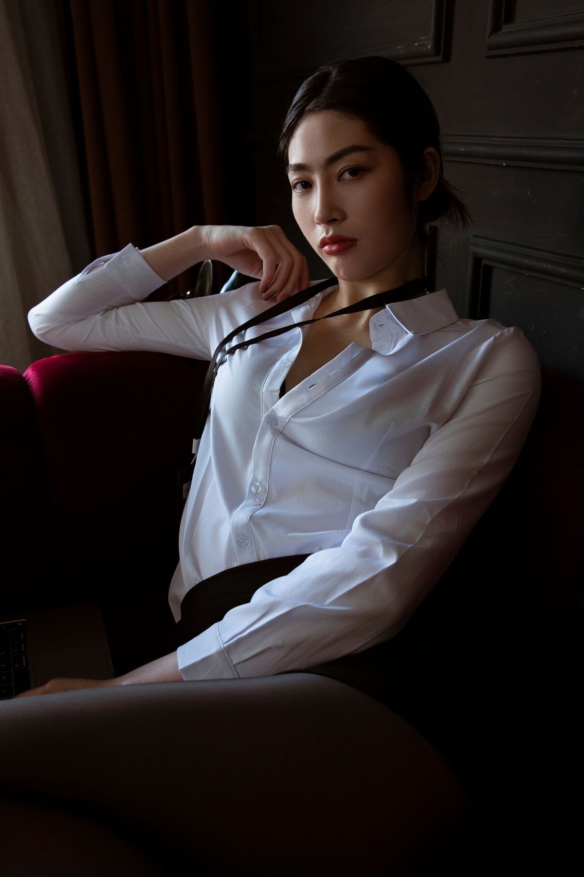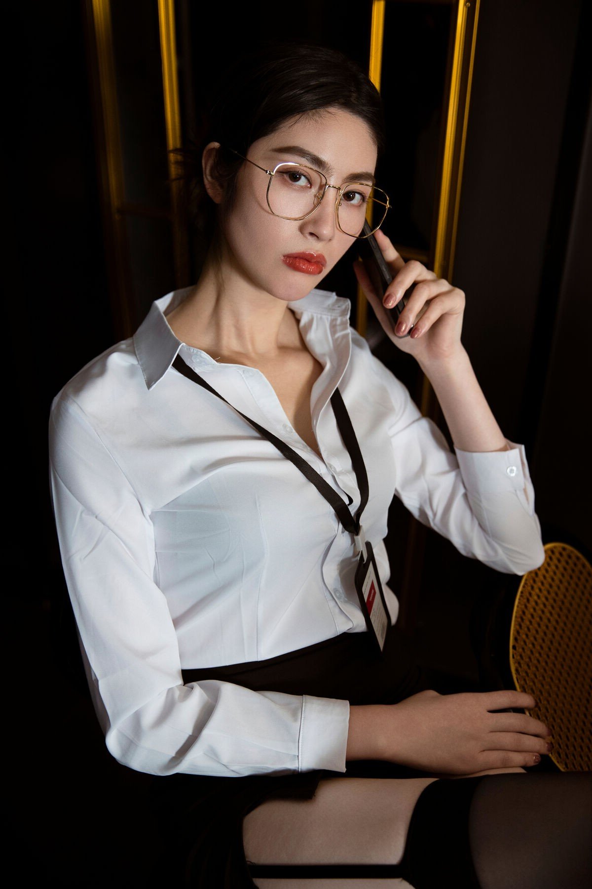 This image features office girl Sang Ni in an elegant and professional business attire She wears a pristine white shirt paired with a dark skirt exuding a refined and confident beauty Her fashionable eyeglasses and neat hairstyle further highlight her captivating aura and intelligence Office lady Sang Ni stands leaning against the wall with a direct gaze full of strength and determination This portrayal not only showcases modern office fashion but also conveys the confidence and assertiveness of women in the workplace The girl emanates an alluring beauty while maintaining the necessary seriousness and professionalism