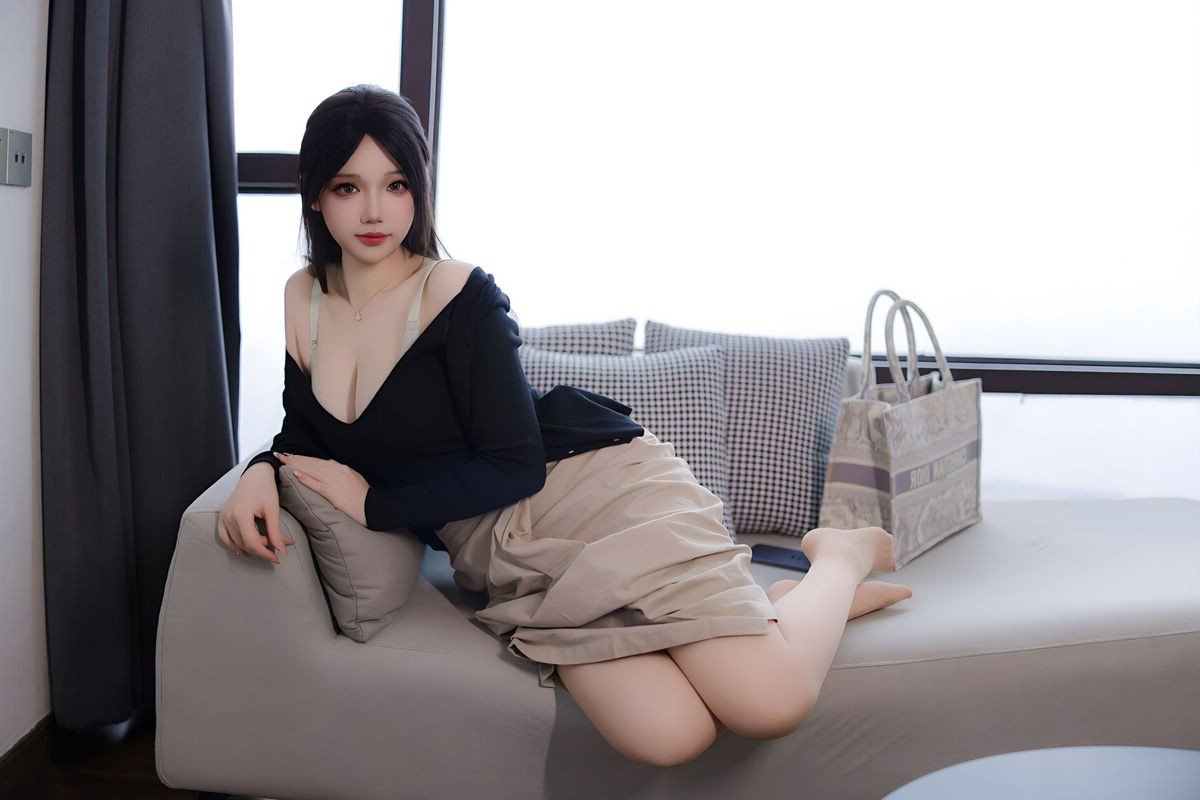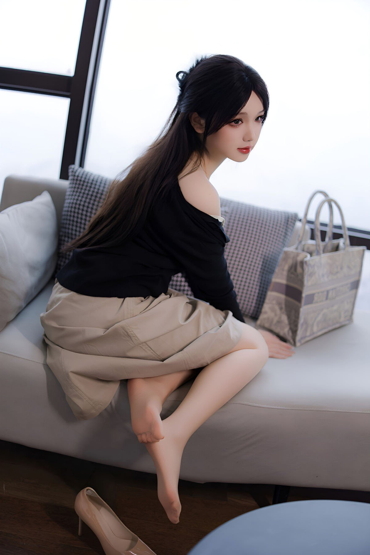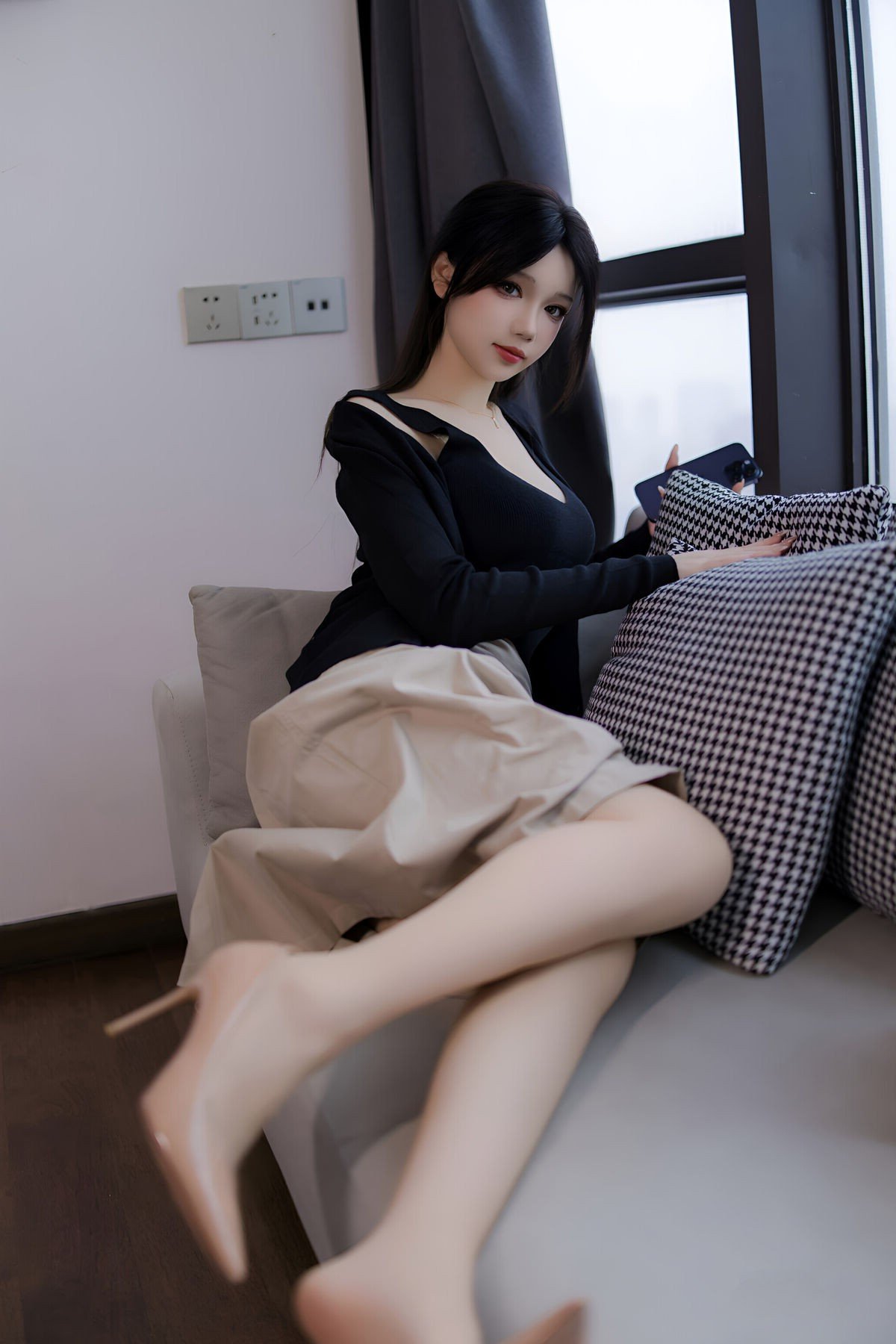 In this captivating photograph Coser Xueqing Astra embodies the alluring and sophisticated Ol Big Sister persona. She is elegantly dressed in a stylish black off-shoulder top paired with a chic beige skirt exuding both professionalism and subtle charm. Her relaxed posture on the sofa with gracefully crossed legs and an engaging gaze towards the camera creates an aura of confident power blended with gentle allure. This image beautifully showcases not only her impeccable fashion sense but also her self-assured and charismatic presence. Xueqing Astra presents the modern independent woman radiating attractiveness in every moment. It is a stunning piece of photography that celebrates the beauty of a woman in contemporary office lady attire.