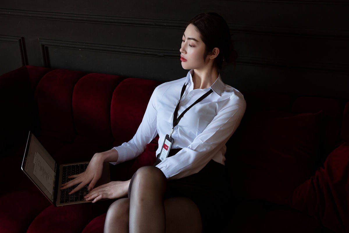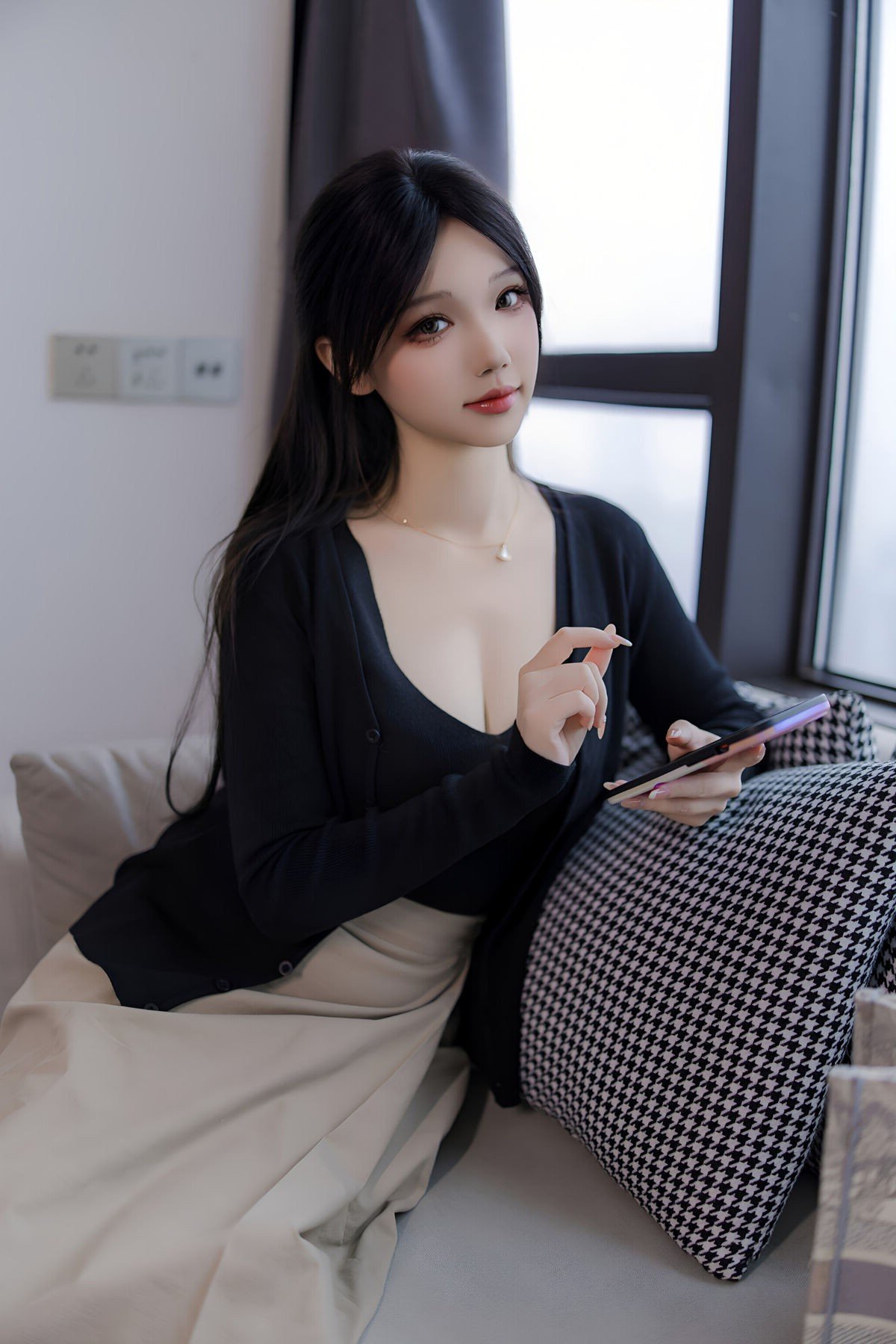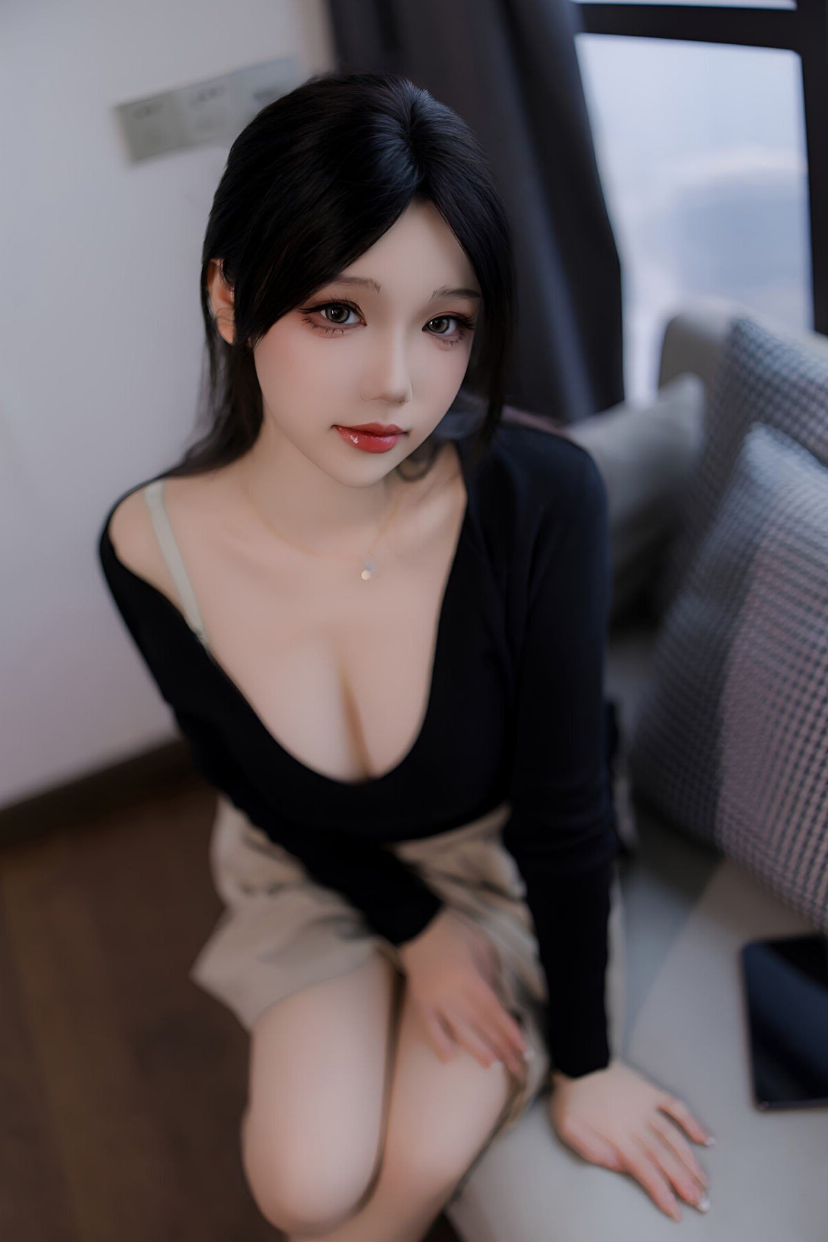 In this captivating photograph Coser Xueqing Astra embodies the alluring and sophisticated Ol Big Sister persona. She is elegantly dressed in a stylish black off-shoulder top paired with a chic beige skirt exuding both professionalism and subtle charm. Her relaxed posture on the sofa with gracefully crossed legs and an engaging gaze towards the camera creates an aura of confident power blended with gentle allure. This image beautifully showcases not only her impeccable fashion sense but also her self-assured and charismatic presence. Xueqing Astra presents the modern independent woman radiating attractiveness in every moment. It is a stunning piece of photography that celebrates the beauty of a woman in contemporary office lady attire.