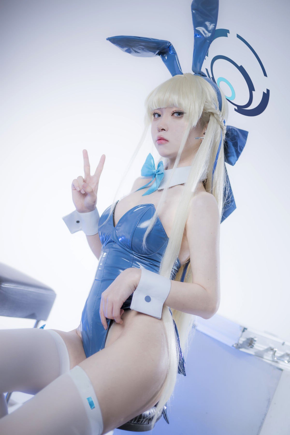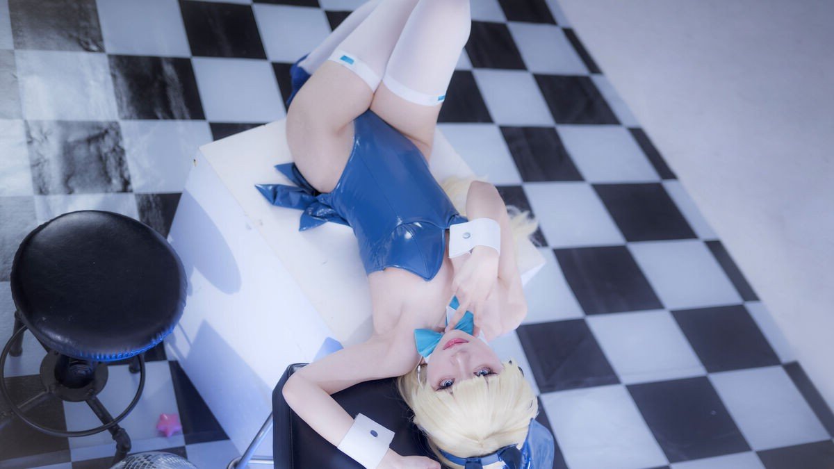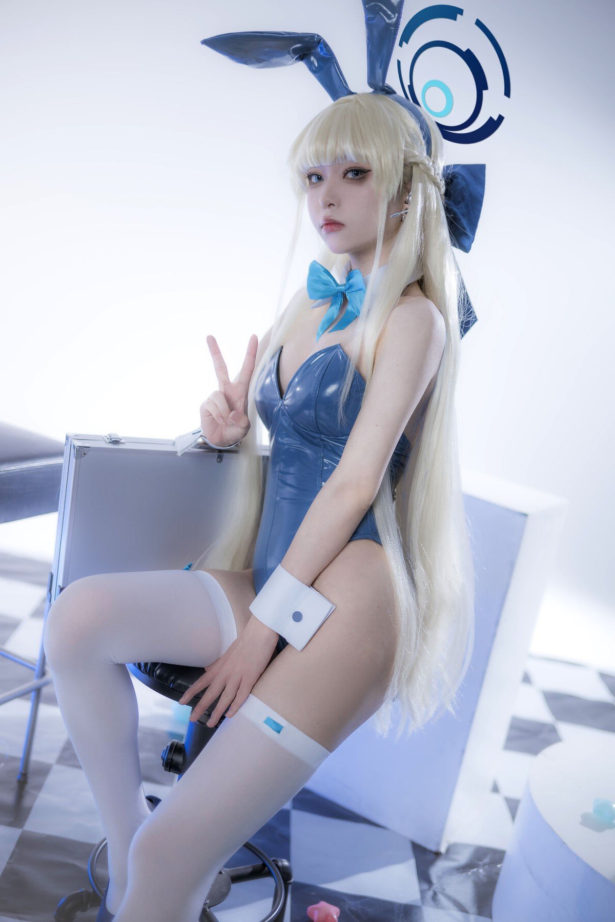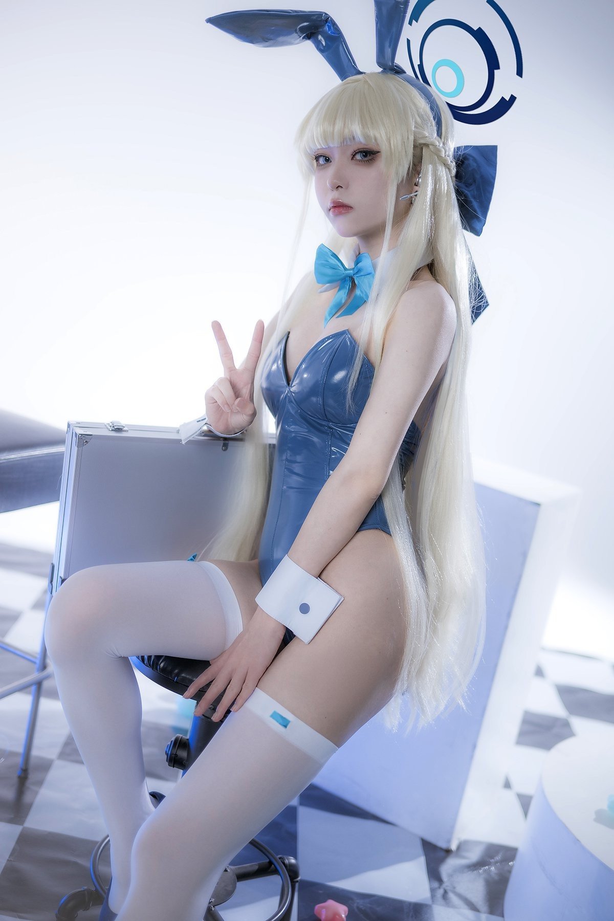 This image features Coser 矢量鱼 in a stunning and captivating 時兔女郎 outfit. She wears a tight-fitting blue bodysuit, paired with white thigh-high stockings and characteristic bunny ears, creating a look that is both alluring and powerful. With her flowing blonde hair, confident expression, and sharp gaze, 矢量鱼 perfectly embodies the spirit of the 時兔女郎 character. Her dynamic pose against a minimalist, futuristic background further highlights the beauty and unique style of this cosplay. This is not just an excellent transformation but also a perfect blend of cosplay art and creativity.