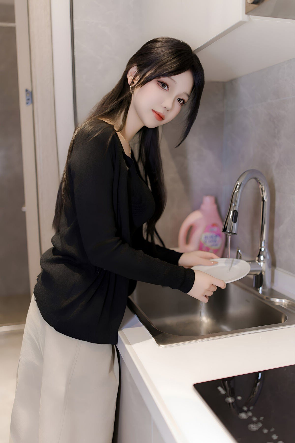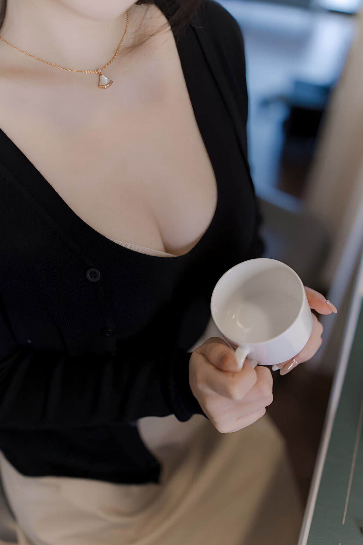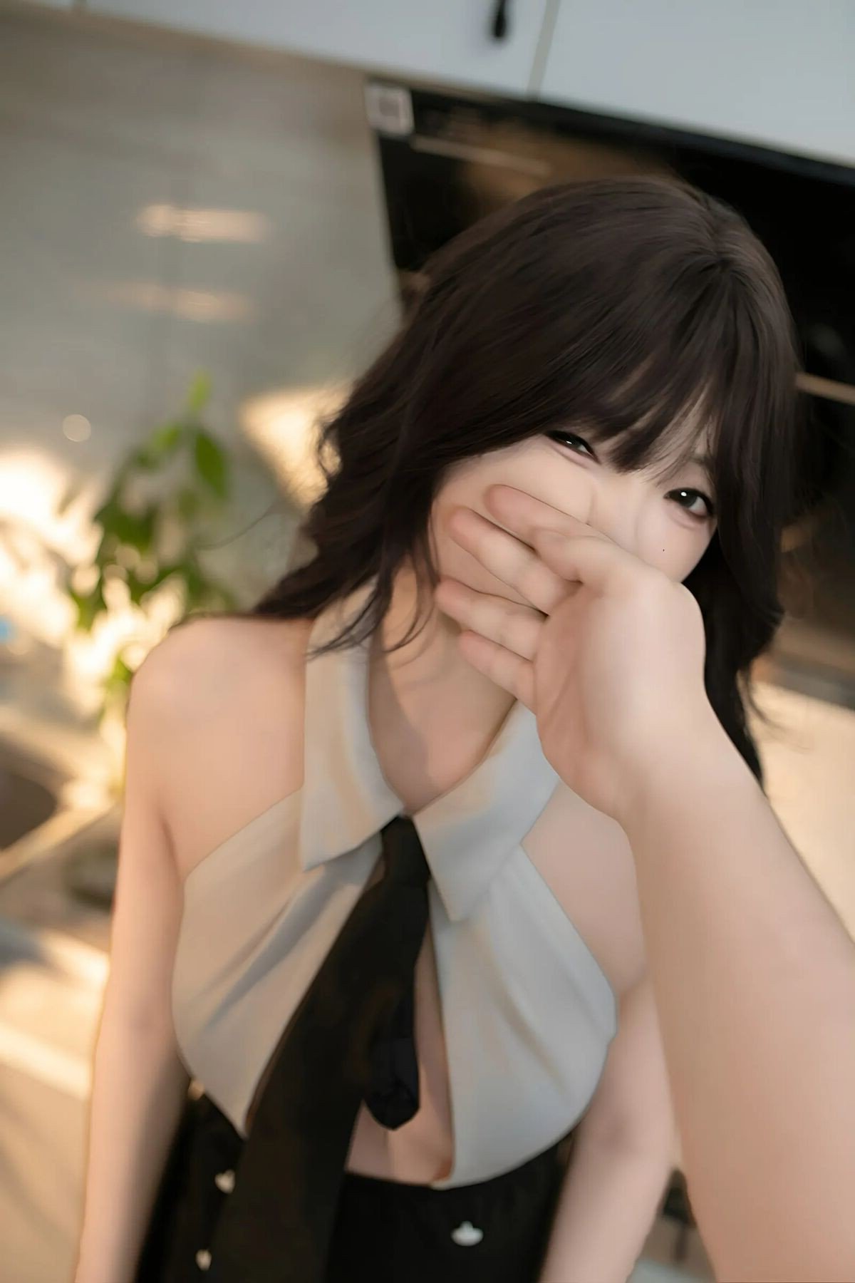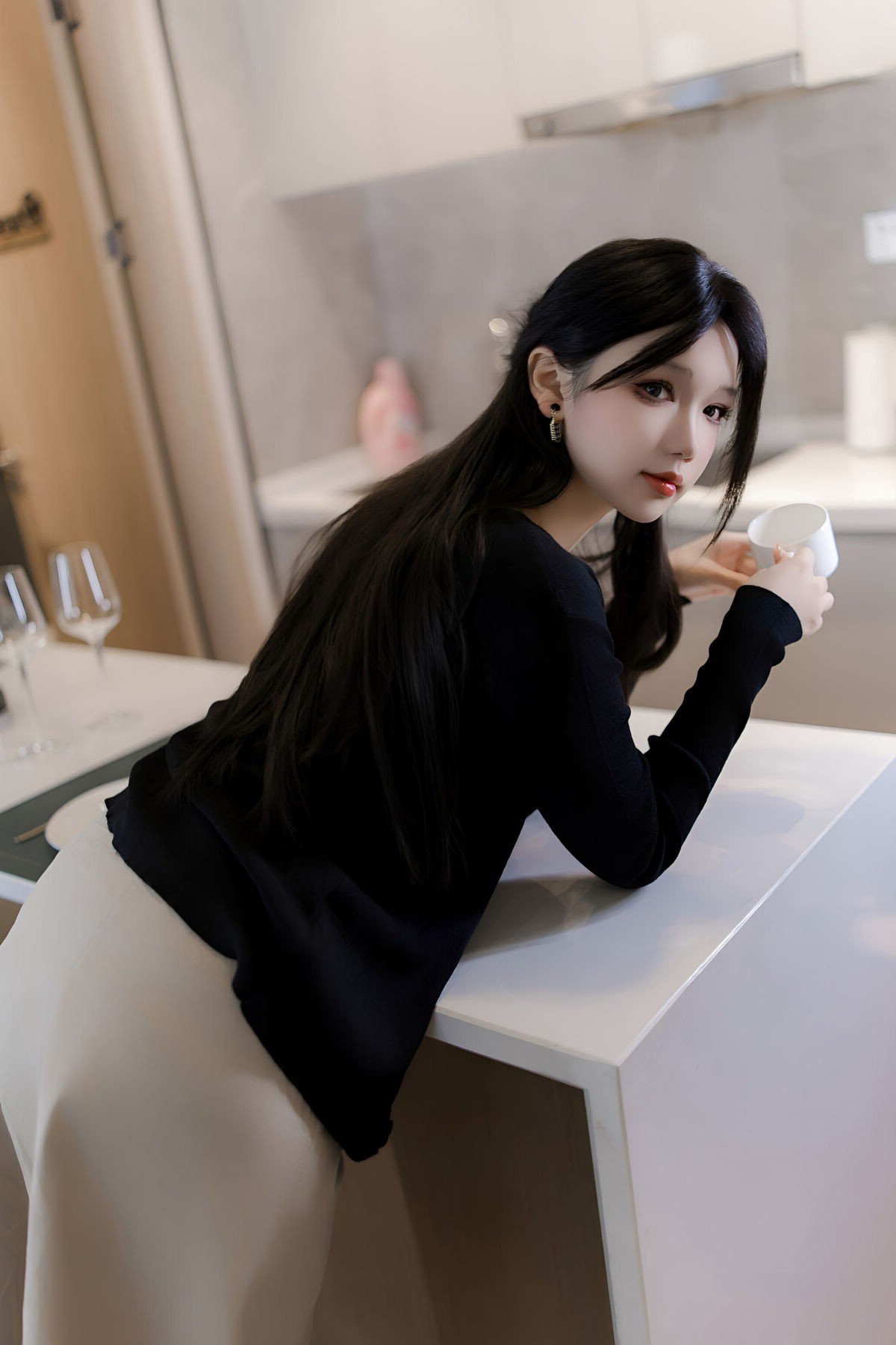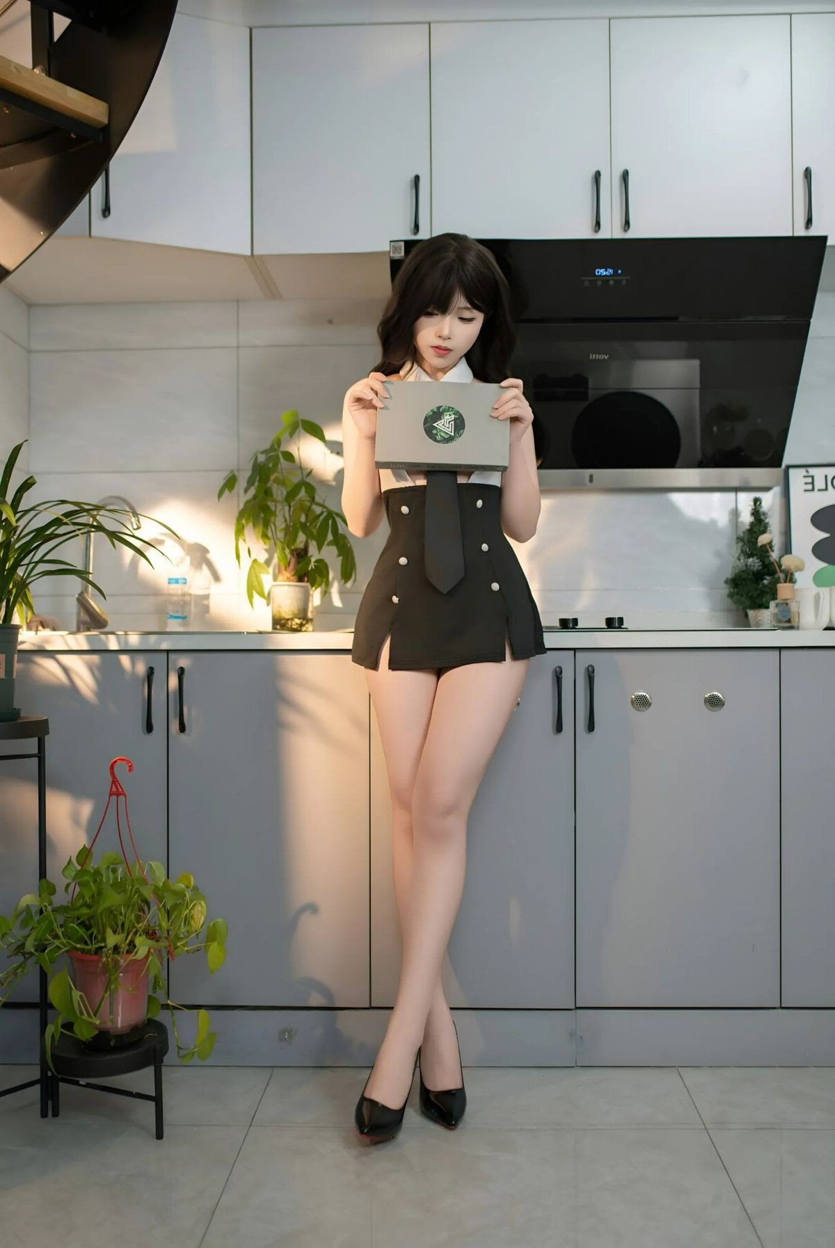 In this captivating image Coser Bangni邦尼 embodies an alluring office lady She stands out with her flowing long dark hair and slender figure showcasing elegant yet subtly sensual beauty in a white top and a short black skirt Her gentle bending pose holding a cup creates an everyday moment that exudes grace and professionalism The surrounding space adorned with small green potted plants adds a modern and fresh touch perfectly complementing the image of an energetic career woman This cosplay photoshoot by Bangni邦尼 successfully portrays an office lady who is both chic and a little mysterious effortlessly drawing all eyes