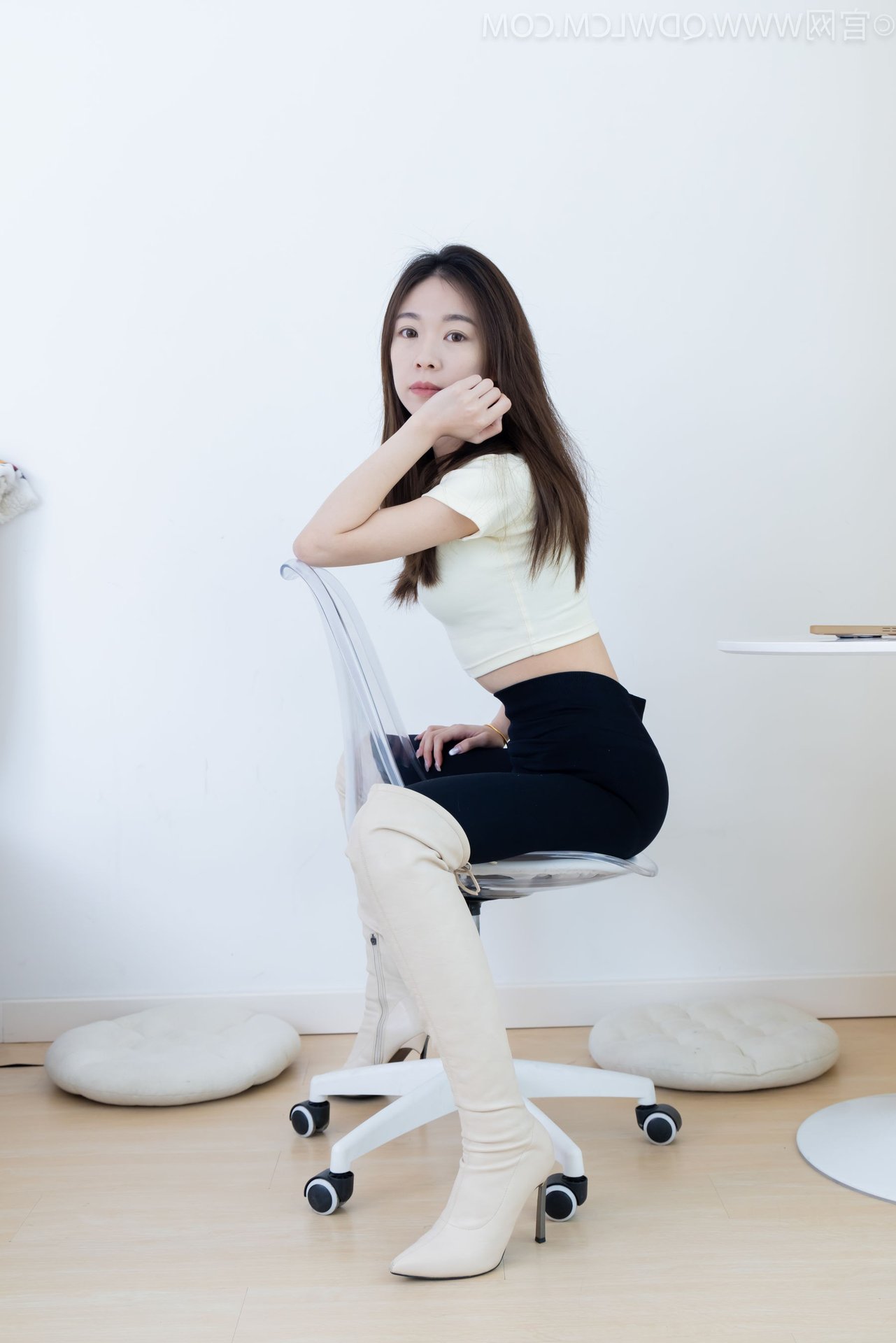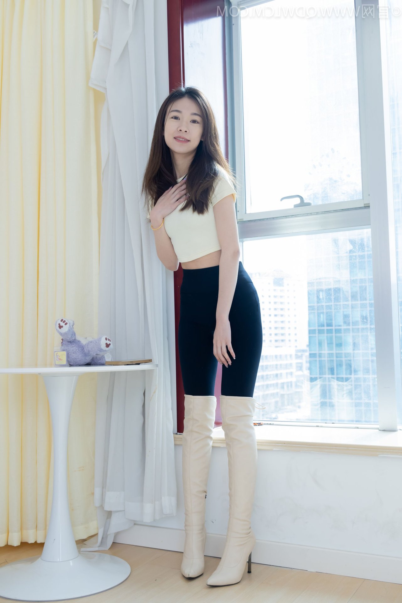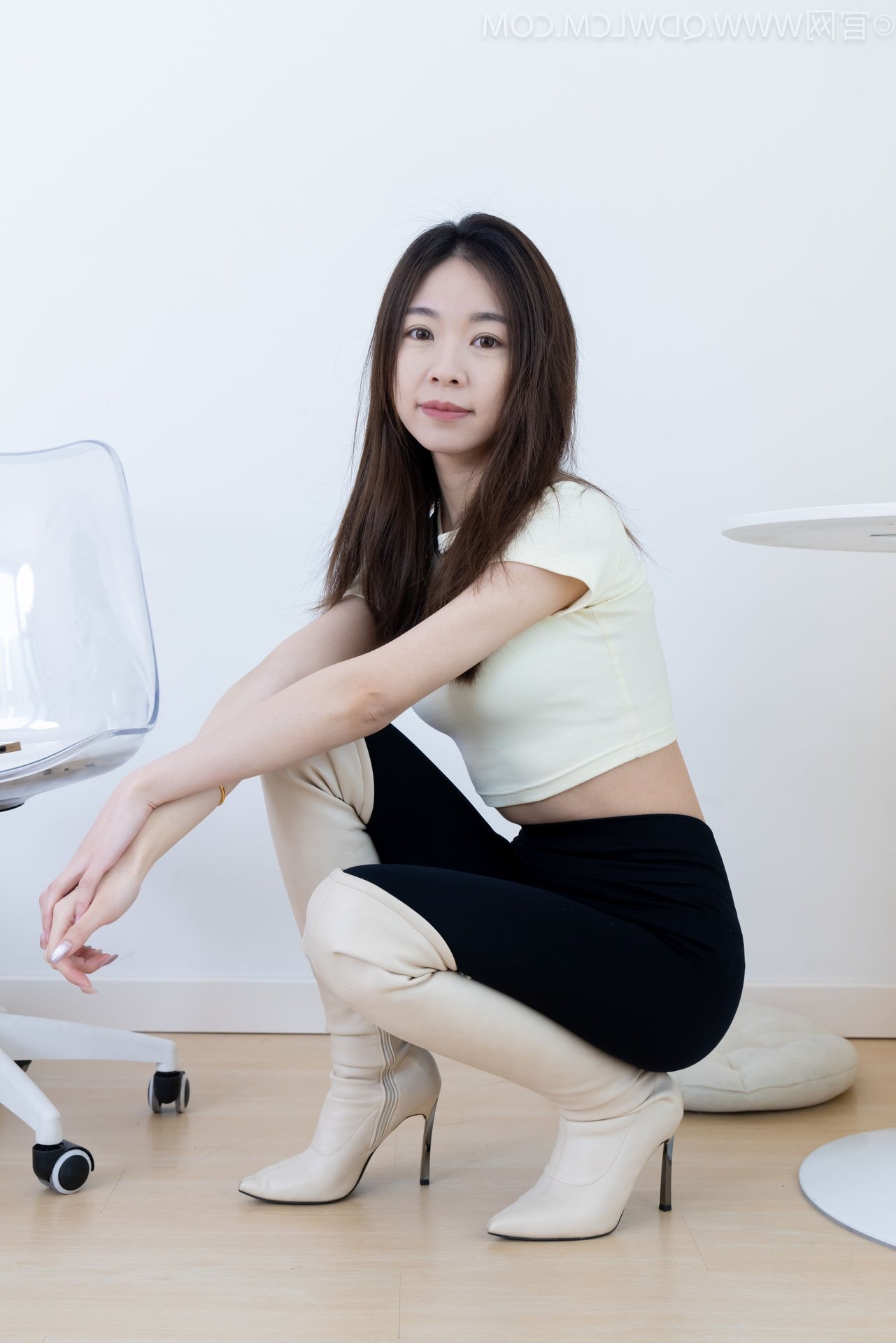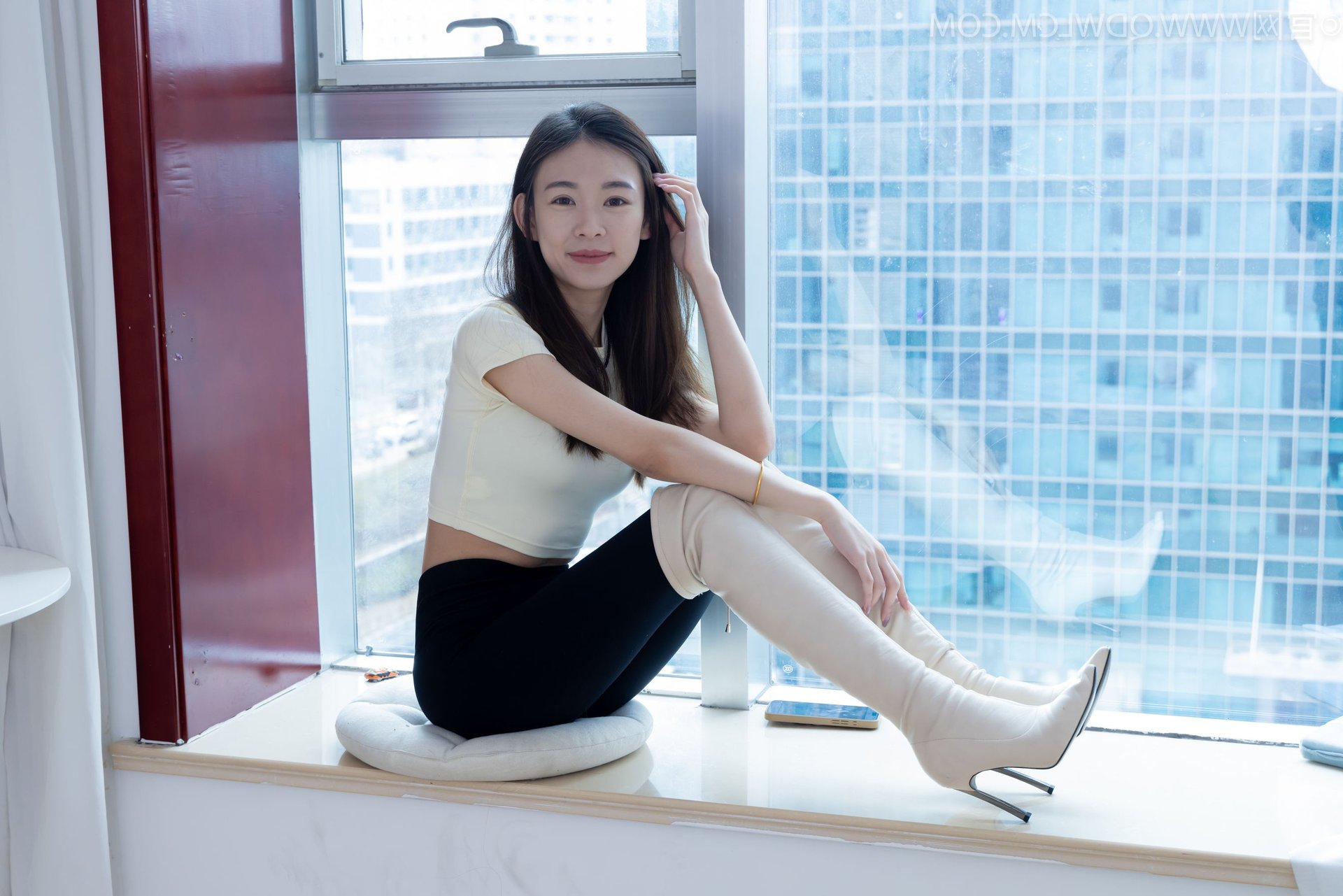 This stunning photograph captures Chinese Model Tingting No.2339 in a graceful and confident pose. She is impeccably styled in a simple crop top sleek black pants and notably a pair of fashionable cream-colored over-the-knee boots that accentuate her slender figure and modern aesthetic. With captivating eyes and a gentle smile Tingting exudes an elegant and alluring charm. The minimalist white background highlights the sophistication of her outfit and her poised demeanor creating a harmonious and striking image. This photo offers wonderful inspiration for fashion enthusiasts and those seeking unique personal style.