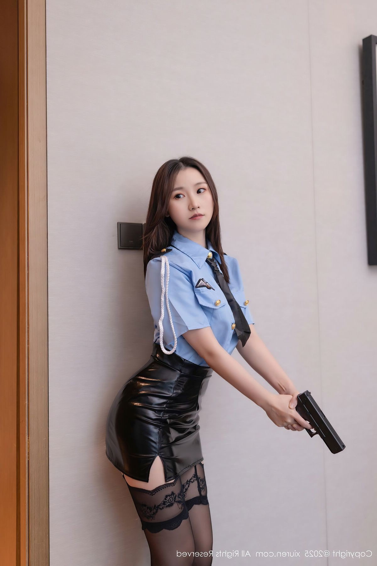 This captivating image showcases model Xing Ya Da in a seductive mini police uniform, part of the exclusive XiuRen No.10277 collection. She strikes a confident pose, highlighting her long, slender legs in sheer black stockings and a sleek, form-fitting leather skirt. The light blue shirt, combined with the handgun she holds, creates a unique blend of authority and alluring charm. Xing Ya Da's captivating gaze and professional demeanor emphasize her mysterious beauty, drawing every eye. This striking photograph presents a powerful yet graceful aesthetic, offering a mesmerizing visual experience for admirers.
