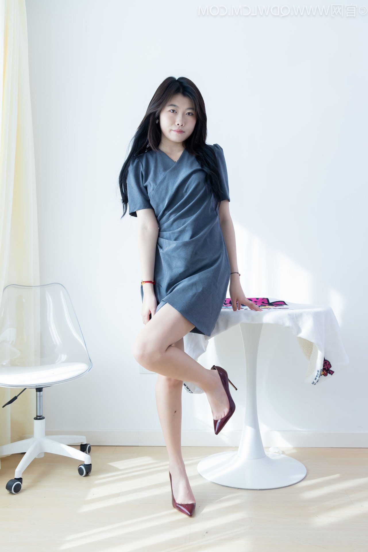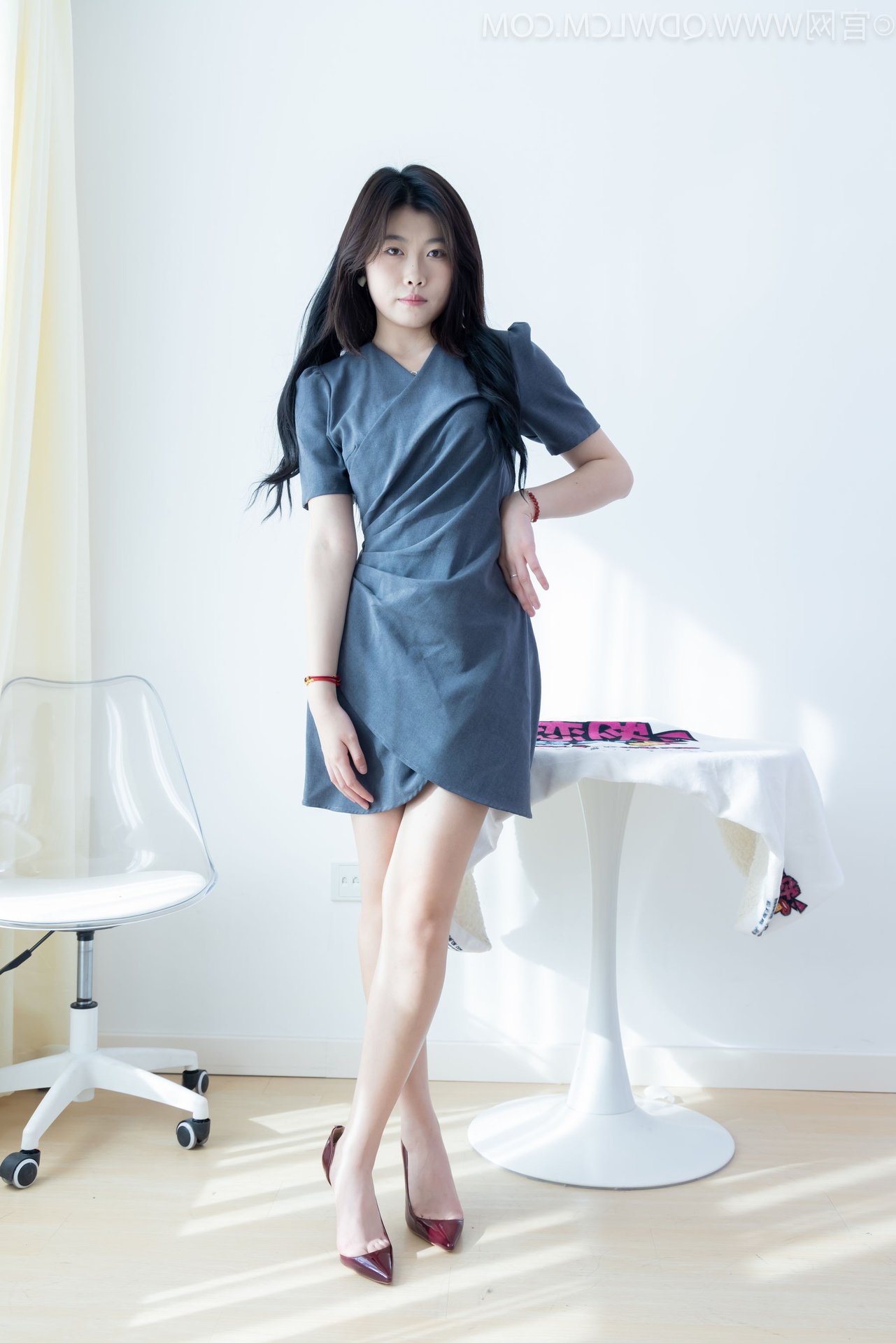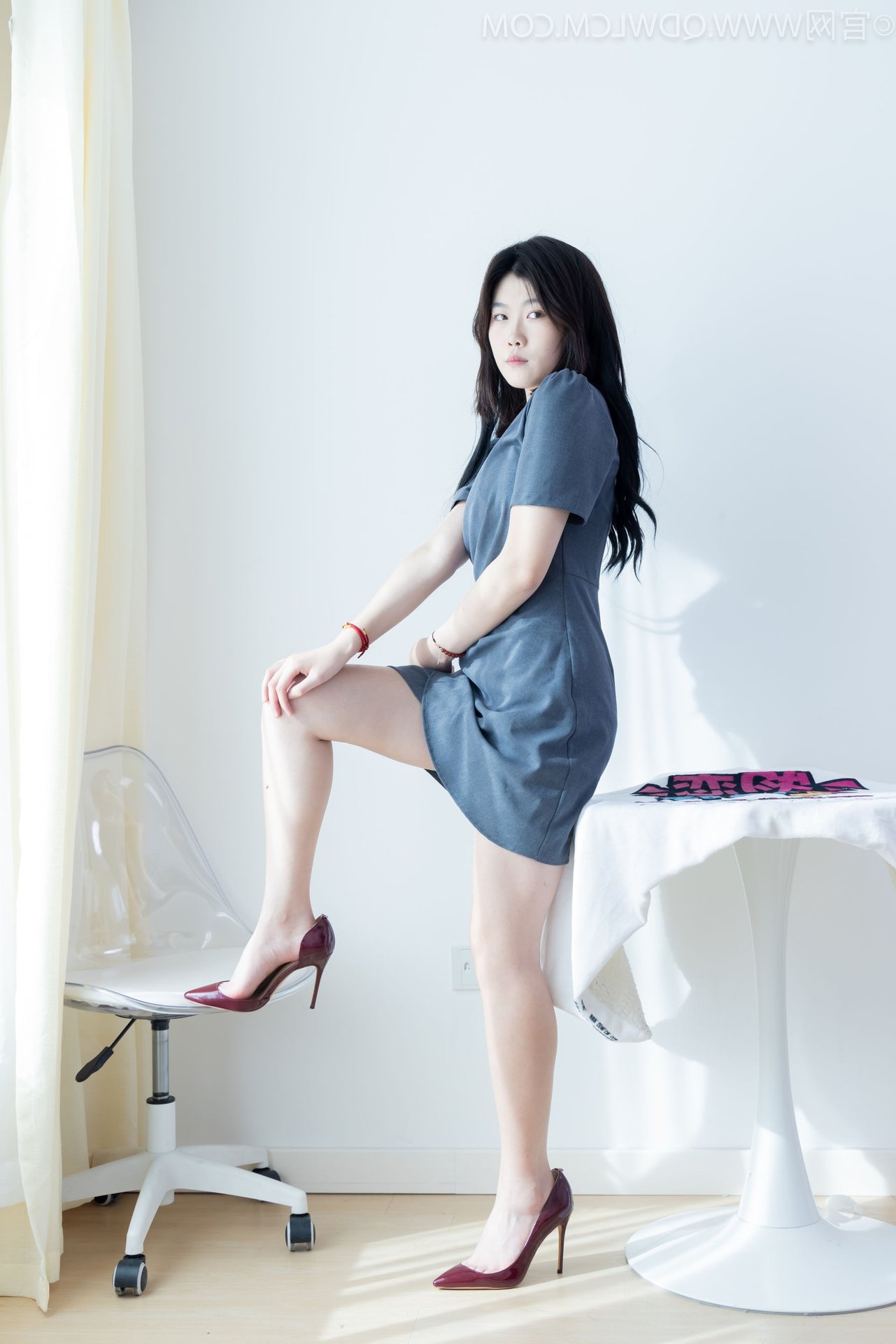 This stunning photograph features Chinese Model No2336 Cherry exuding elegance and charm She poses gracefully on a light blue sofa showcasing her slender legs enhanced by delicate sheer hosiery and sophisticated high heels Her dark gray short dress further accentuates her modern fashion sense With flowing dark hair and captivating eyes Cherry embodies a confident and alluring presence This image is perfect for those who appreciate the blend of high fashion and East Asian beauty highlighting the allure of high heels and sheer hosiery in contemporary style