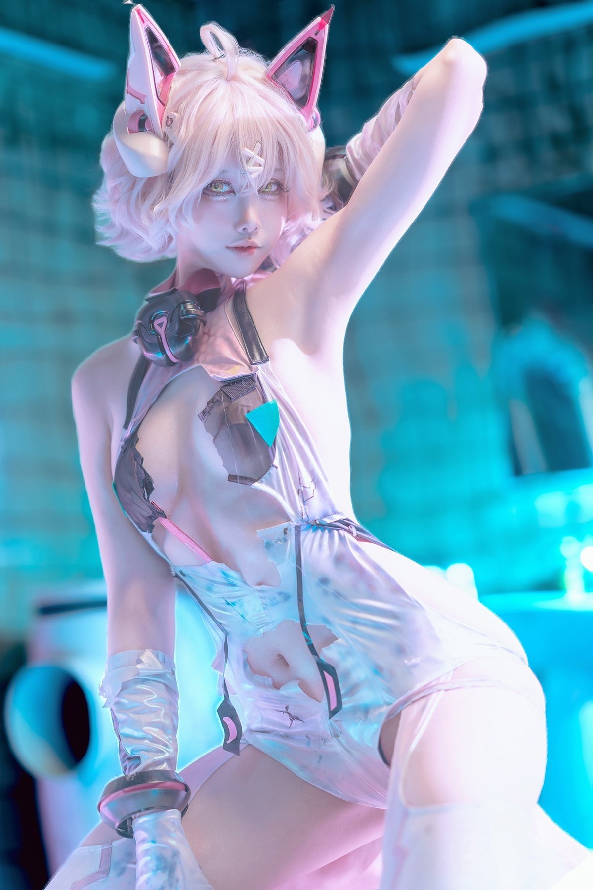 Coser@樱岛嗷一 captivates as the 'Evil Bunny Girl' in a stunning white cosplay ensemble. Her ethereal light blue hair and fluffy bunny ears create an innocent yet alluring contrast. The meticulously designed outfit features bold cutouts and delicate straps highlighting her graceful figure. With a subtle gaze and a hint of mischief 樱岛嗷一 embodies the character's unique blend of charm and edgy allure. This cosplay isnt just a portrayal its an artful interpretation that combines soft elegance with a distinctive unconventional style. The photoshoot leaves a lasting impression showcasing a captivating and memorable performance by Coser@樱岛嗷一.