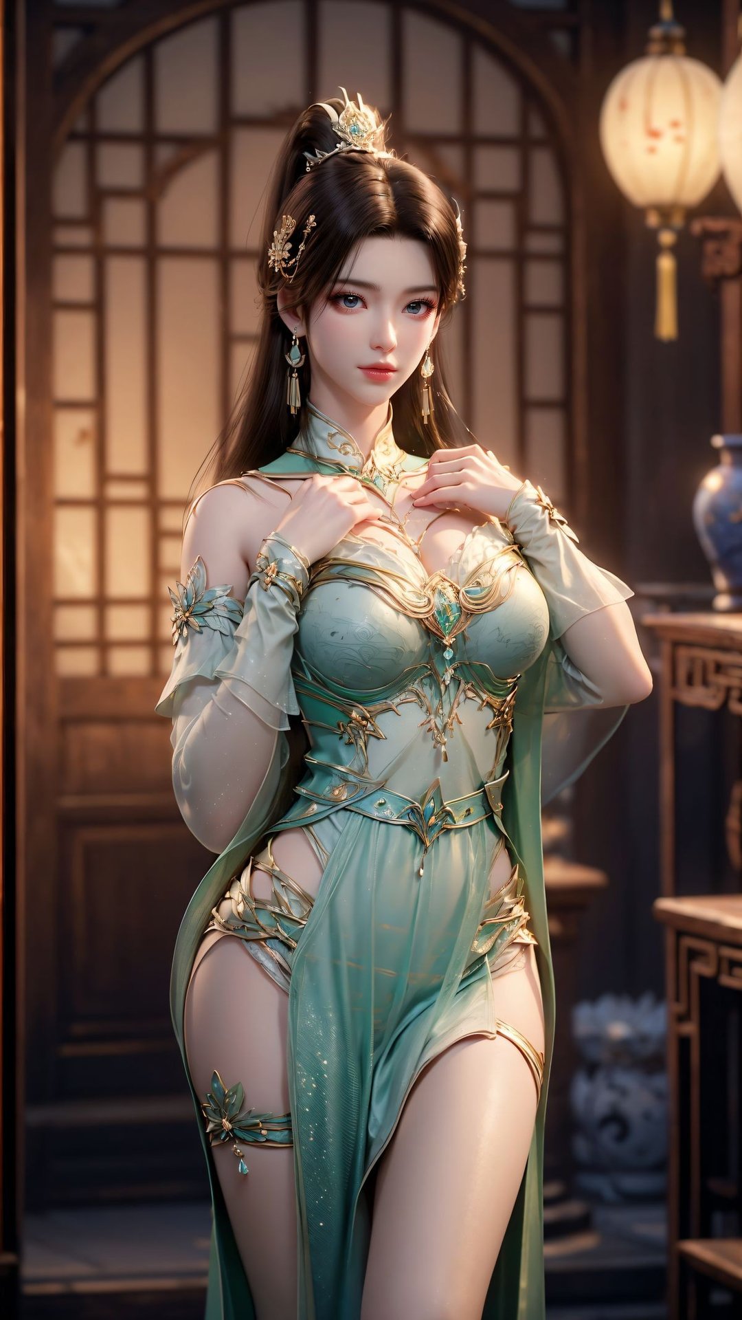 This stunning AI-generated image showcases Xiao Xun'er exuding an aura of elegant and captivating beauty. She is depicted in a graceful pose adorned in an exquisite teal traditional outfit embellished with shimmering gold patterns highlighting her slender figure and noble demeanor. Her long dark hair is styled intricately adding to her sophisticated charm. Her gaze is gentle yet deeply alluring hinting at a mystical narrative. The softly lit background featuring an antique lantern creates a warm and poetic ambiance that perfectly complements her enchanting presence. This high-quality digital artwork masterfully blends traditional East Asian aesthetics with advanced AI technology offering a visually impressive and emotionally resonant experience.