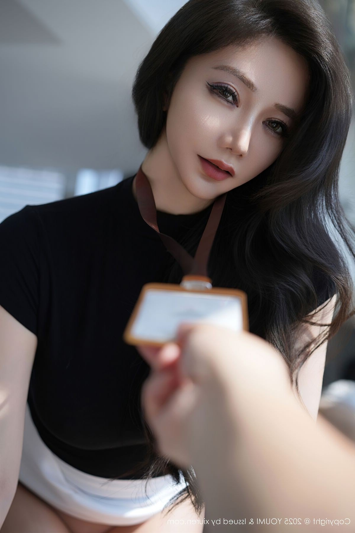 This captivating image showcases the stunning Chinese model Li Yan Xi from the YouMi Vol.1144 collection. She exudes confidence and alluring charm in a sophisticated office-inspired ensemble. Her figure is gracefully highlighted by a form-fitting black top paired with a chic white mini skirt, accentuating her slender physique and long elegant legs. Posing with professional poise, Li Yan Xi embodies modern elegance blended with a subtle sensuality. The backdrop of a large window offering a blurred city view and natural light further enhances her luxurious appeal. Li Yan Xi truly stands out as a charming Chinese model, presenting an irresistibly stylish and high-class fashion statement.