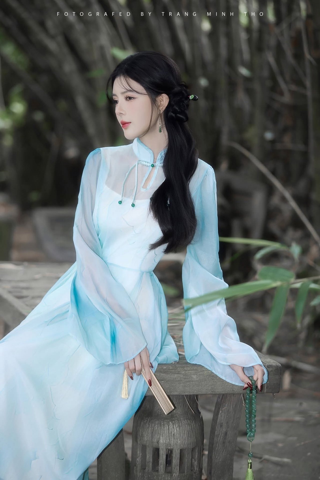 This stunning portrait captures a captivating hot girl with elegant long legs, gracefully seated by a dreamy pond. Dressed in beautiful traditional attire of soft pastel blue, she exudes an alluring and serene charm. The lush natural backdrop combined with classic architectural elements creates a truly aesthetic and poetic atmosphere. The image evokes a sense of peace and romance, subtly showcasing cultural beauty. It's an inspiring photograph for those who appreciate the harmonious blend between human elegance and a tranquil environment.