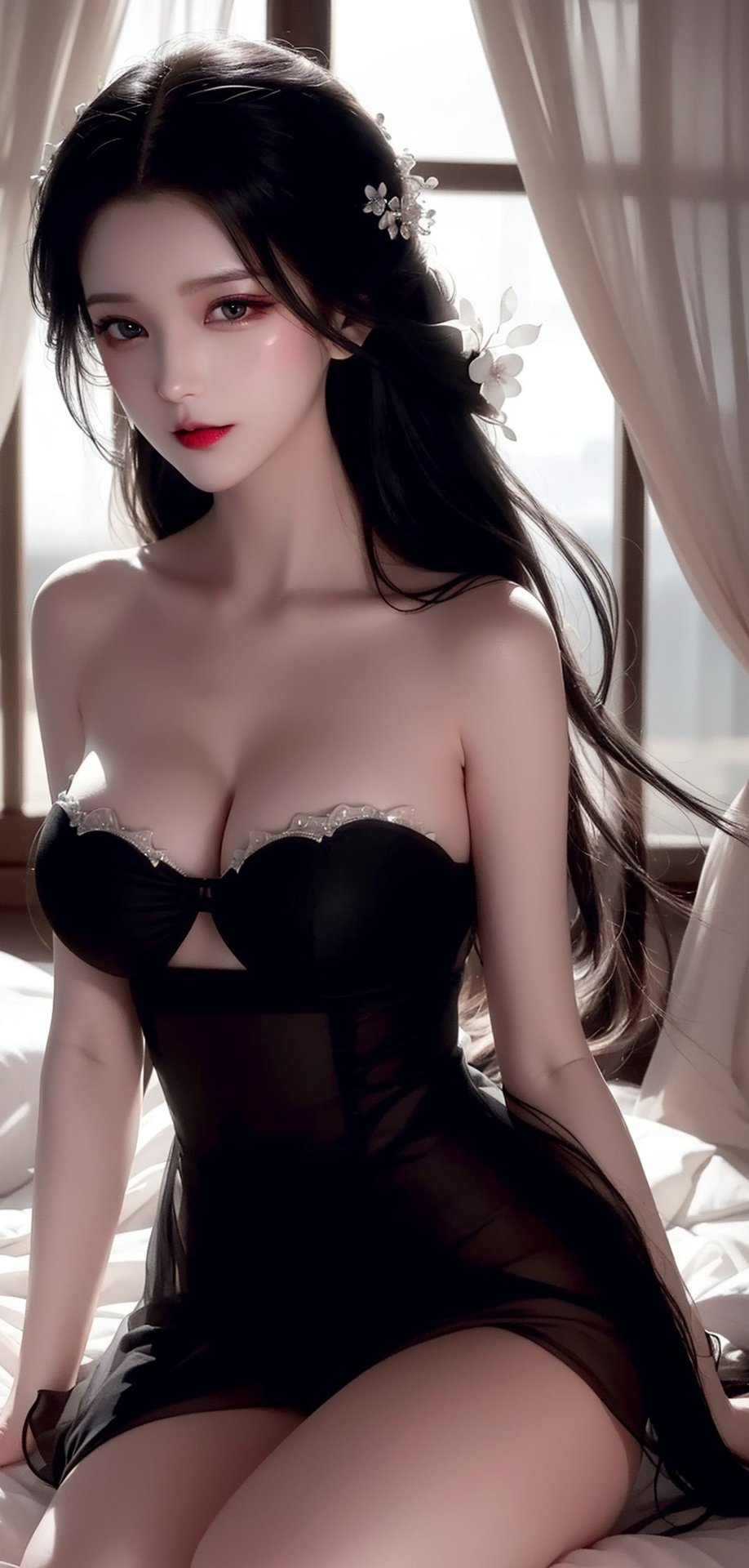 Explore the captivating beauty of a muse in this AI Generated realistic BiAn1 6期 Part02 collection. This lifelike image portrays an alluring woman with long dark hair, luscious red lips, and deep captivating eyes. She is adorned in delicate black lace lingerie, complemented by a mysterious wide-brimmed hat, exuding an aura of both elegance and enigma. Every detail from her direct gaze to the red rose in her hand emanates subtle sensuality and irresistible charm. This stunning digital artwork offers a vivid and emotional visual experience, showcasing the pinnacle of AI generated realism.