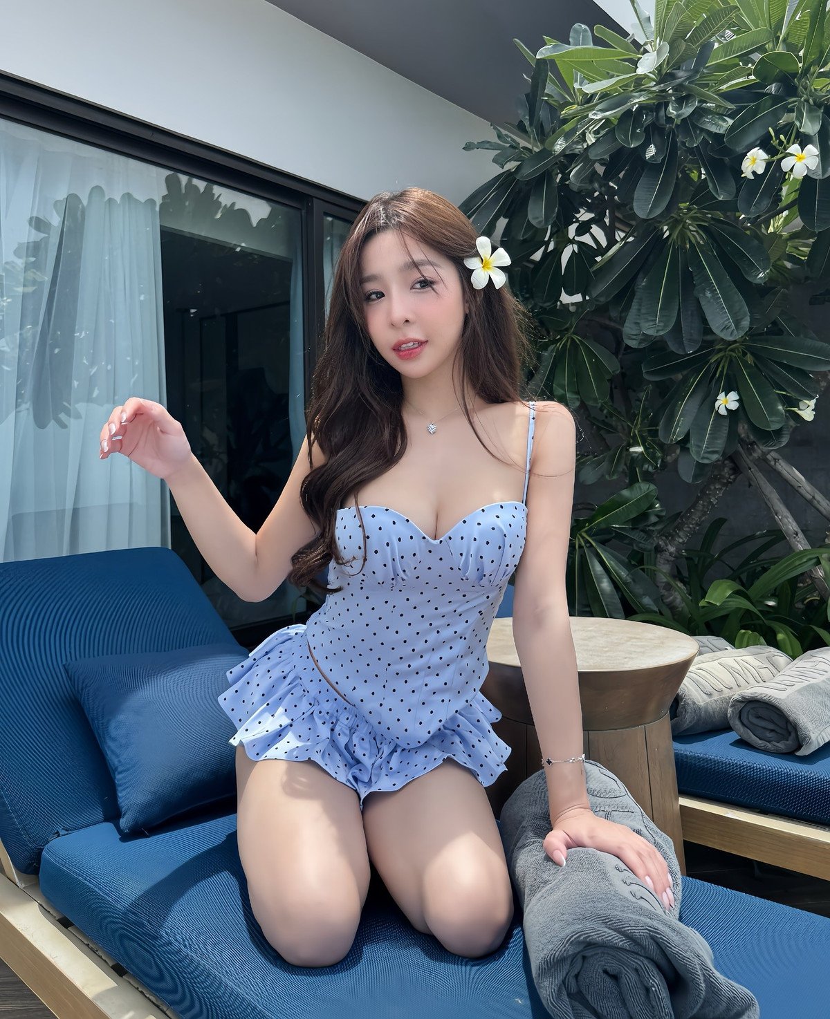 Tammy Pham shines brightly showcasing her alluring beauty by the high rise infinity pool She wears a charming polka dot two piece outfit both cute and subtly sensual With her long flowing hair and confident demeanor Tammy Pham captivates every gaze The stunning cityscape and distant ocean view further enhance her beauty This moment exudes relaxation and sophisticated style Tammy Pham posing by the infinity pool is enchanting fully displaying her graceful physique and radiant confidence The polka dot attire highlights her gentle femininity and captivating charm this is a beautiful and emotional photo capturing an ideal vacation