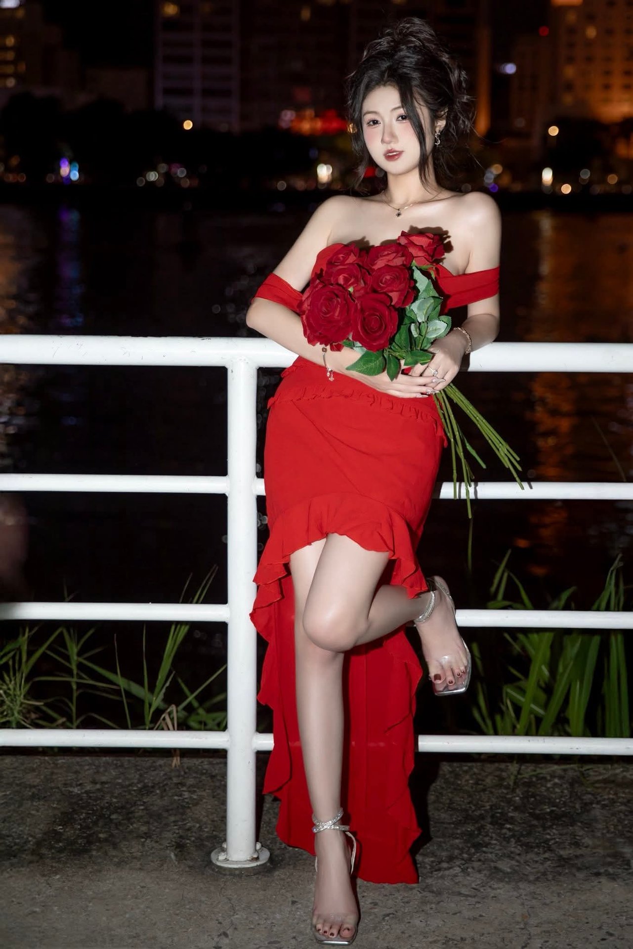This image captures a captivating moment of a lady in a vibrant red dress, showcasing alluring bare shoulders and long, slender legs. With a sophisticated fashion style, she poses elegantly on city steps at night, with sparkling urban lights as a backdrop. This beautiful portrait exudes confidence and charm. The crisp, high-quality image meets HD wallpaper standards, perfect for those who appreciate fashion beauty and portrait photography. The striking red dress is not just a focal point but also highlights her exquisite taste in attire, making her the center of attention and a symbol of modern allure.Stunning Vietnamese Girl Portrait: Elegant White Dress & Captivating Charm