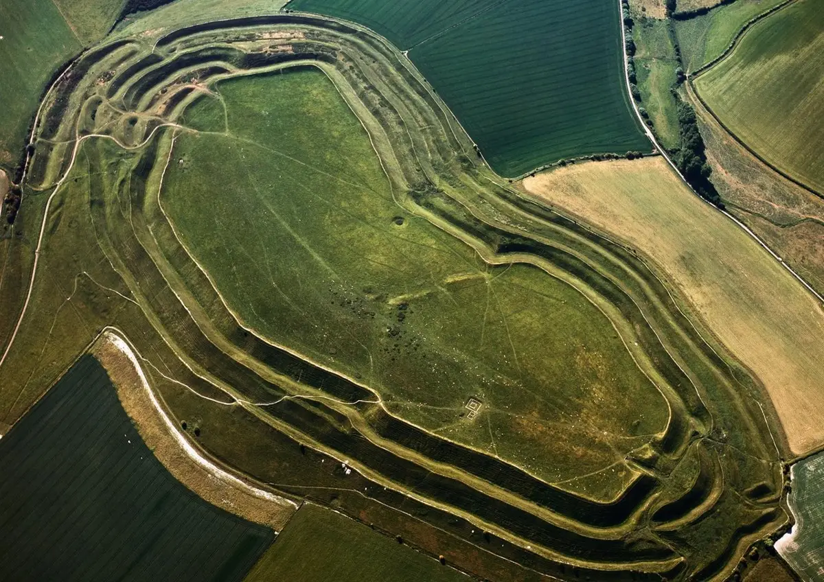 This stunning aerial view reveals Maiden Castle, a colossal Iron Age hillfort in Dorset, England. Dating back nearly 3000 years, it stands as one of Europe's largest and most complex prehistoric defensive structures. From above, its concentric ramparts and ditches form an impressive, winding pattern, an ancient scar upon the verdant landscape. This remarkable earthwork is a silent witness to ancient European history, once a formidable center of power and a battleground for Celtic and Roman conflicts. Today, Maiden Castle is not just a UK national heritage site but a captivating destination, inviting visitors to explore its magnificent archaeological features and connect with millennia of human history.#MaidenCastle #IronAgeHillfort #AncientHistory #DorsetEngland #UKHeritage