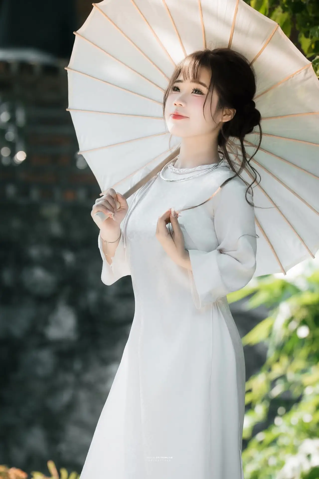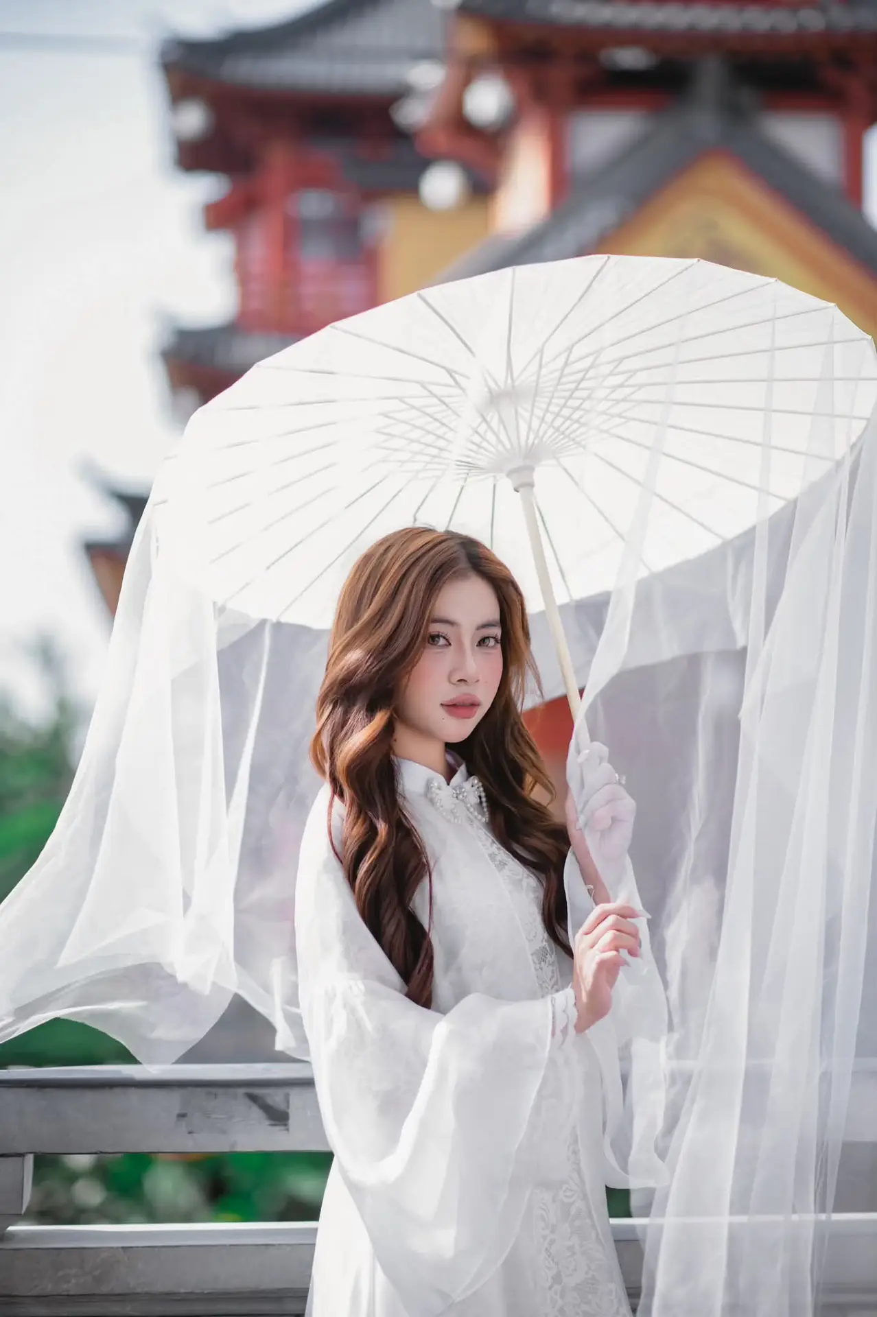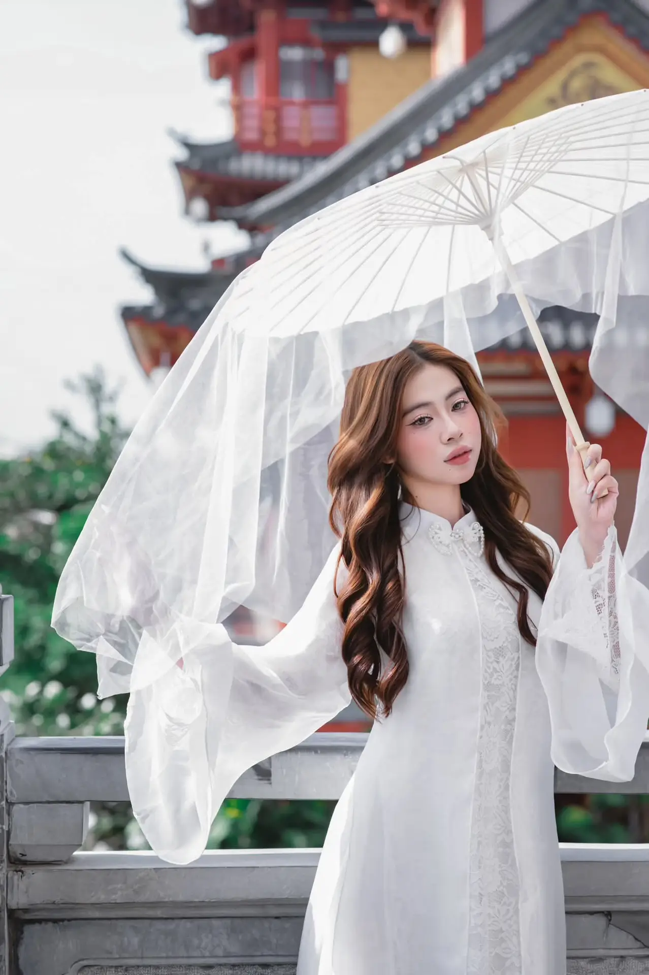 This stunning photograph beautifully captures the serene grace of an Asian girl adorned in a pristine white ao dai The model exudes a gentle elegance with her long flowing hair and delicate white umbrella Soft ethereal fabric billows around her creating a dreamy mystical effect that harmonizes perfectly with the traditional ancient architecture in the background It evokes a timeless sense of traditional artistry and cultural depth The harmonious blend of traditional attire and picturesque scenery results in an emotionally rich and captivating photographic masterpiece inviting viewers to appreciate the enduring beauty of Vietnamese women and Eastern culture