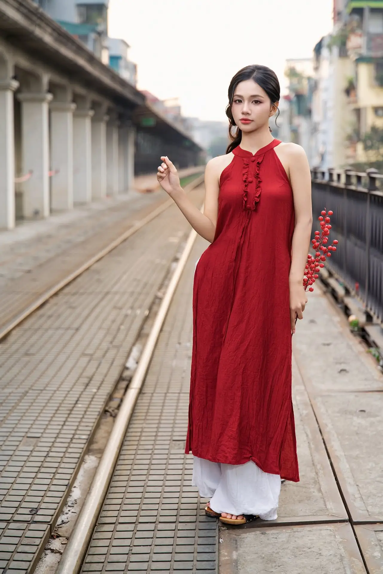 This photograph beautifully captures the elegant and gentle charm of a Vietnamese girl dressed in a striking modernized red outfit. She sits gracefully on the old tracks and sleepers of a railway bridge, creating a backdrop that is both classic and contemporary. Her dreamy gaze and the red flowers in her hand further enhance her pure Asian beauty, imbued with a touch of nostalgia. This is more than just an outdoor photoshoot; it is a harmonious blend of antique architecture and radiant youth. The image evokes feelings of peace, grace, and the timeless beauty of Vietnamese women.