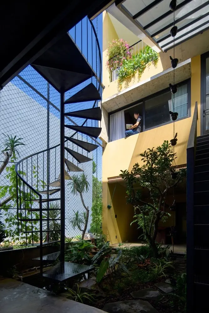 From an aerial perspective, the photograph reveals a vibrant, lush green space where people and nature harmoniously intertwine. This is a glimpse into a unique 'healing house' in Da Nang, an architectural marvel that captivates with its distinctive ecological design. Rather than merely being a backdrop, nature is actively integrated, creating small, shaded gardens within the architectural framework, offering freshness and tranquility. Spiral staircases invite exploration of this cool green sanctuary, where individuals can find relaxation and connection. More than just a residence, this house is an ideal destination for rejuvenation, demonstrating how architecture can perfectly blend with the environment, providing an inspiring and sustainable living experience.