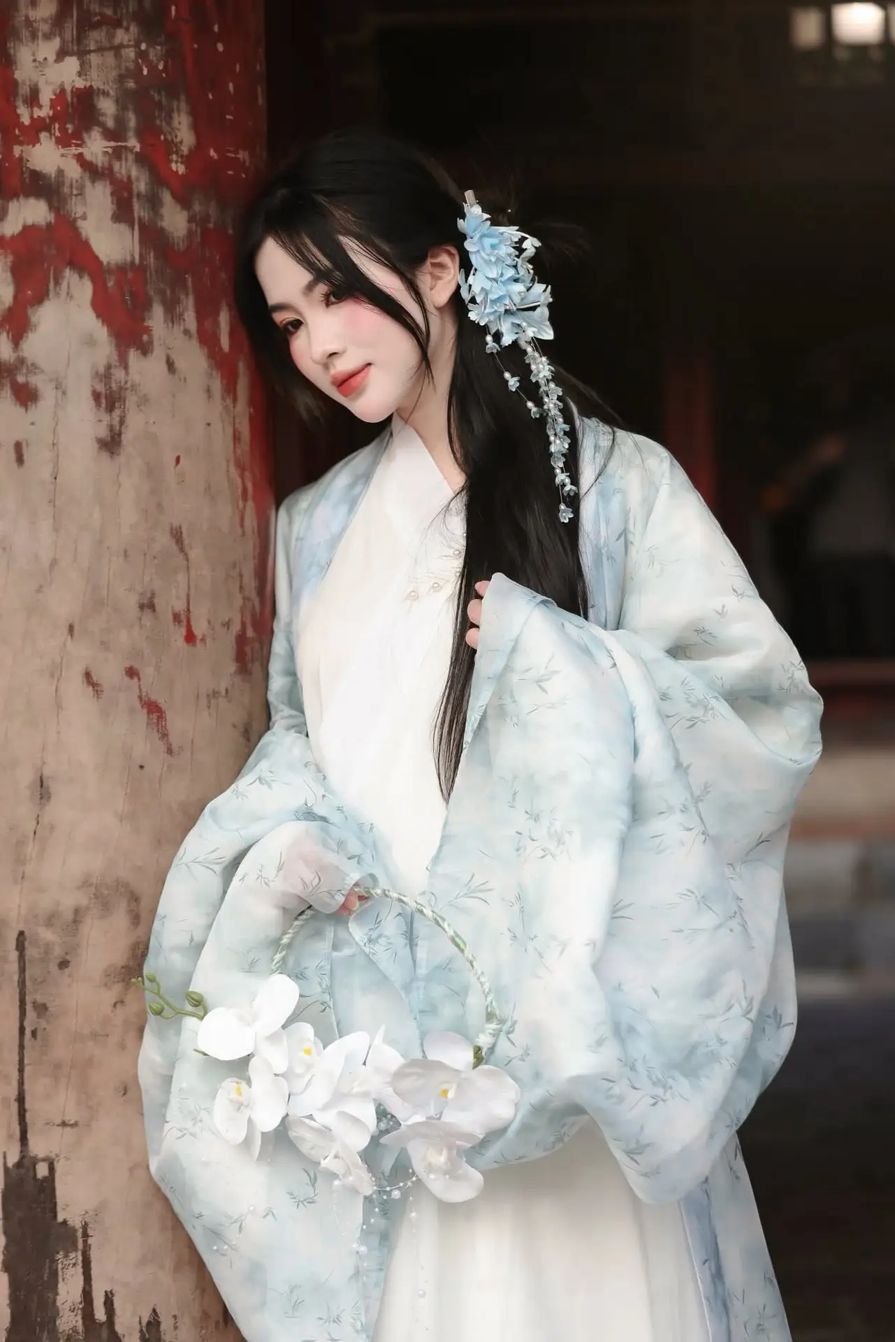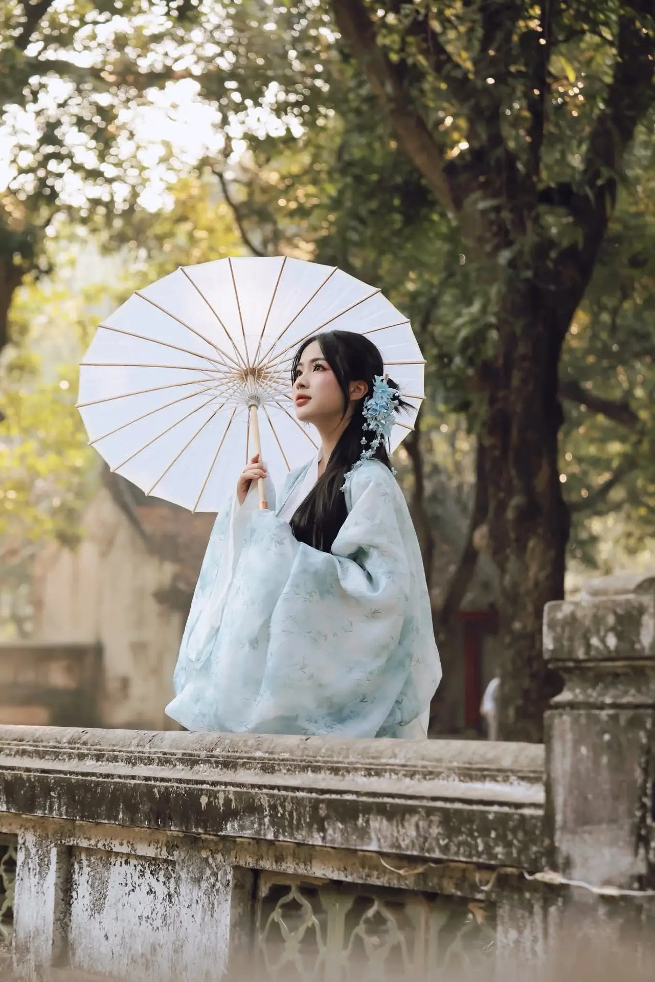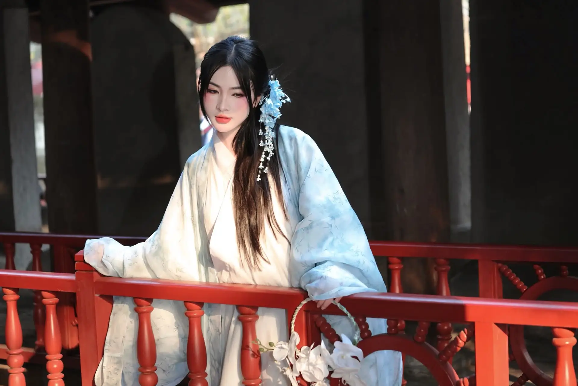 This captivating image features a young Vietnamese woman exuding gentle elegance and grace adorned in a sophisticated traditional costume of delicate blue and white hues. The attire a modern interpretation of ancient styles beautifully highlights her serene East Asian charm. Posed within the solemn embrace of ancient architecture possibly a revered temple or pagoda her figure leaning against a vibrant red railing creates a remarkably harmonious scene. Her contemplative gaze and the subtle floral hair accessory enhance the romantic and tranquil atmosphere. More than just a beautiful photograph it is a refined blend of human beauty and cultural heritage reminding us of the enduring value of tradition in contemporary life and evoking a sense of nostalgia and peace.