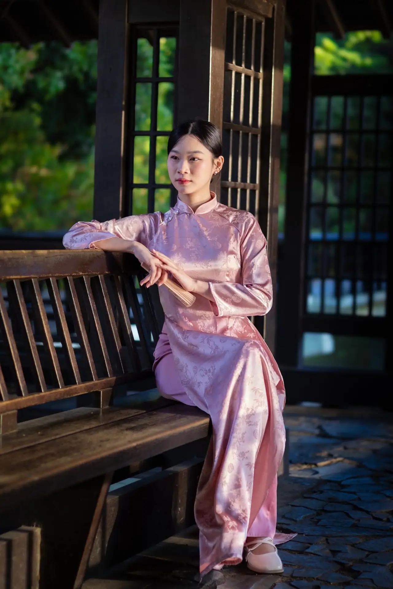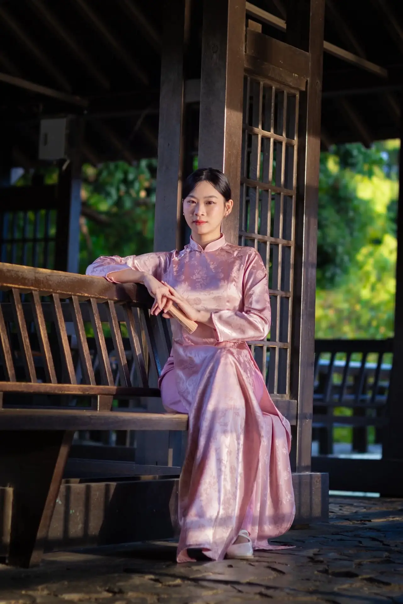 This image beautifully captures the gentle and elegant charm of a Vietnamese woman in a soft pink Ao Dai. The girl sits gracefully on an antique wooden bench, highlighting her poise and confident demeanor. The flowing Ao Dai gently embraces her figure, creating a subtle allure while preserving traditional modesty. The natural backdrop of lush greenery and rustic wooden architecture further accentuates the pure beauty of the subject. This is more than just a beautiful photograph; it is a tribute to the timeless culture and inherent grace of Vietnamese women, an embodiment of sophistication and refinement.