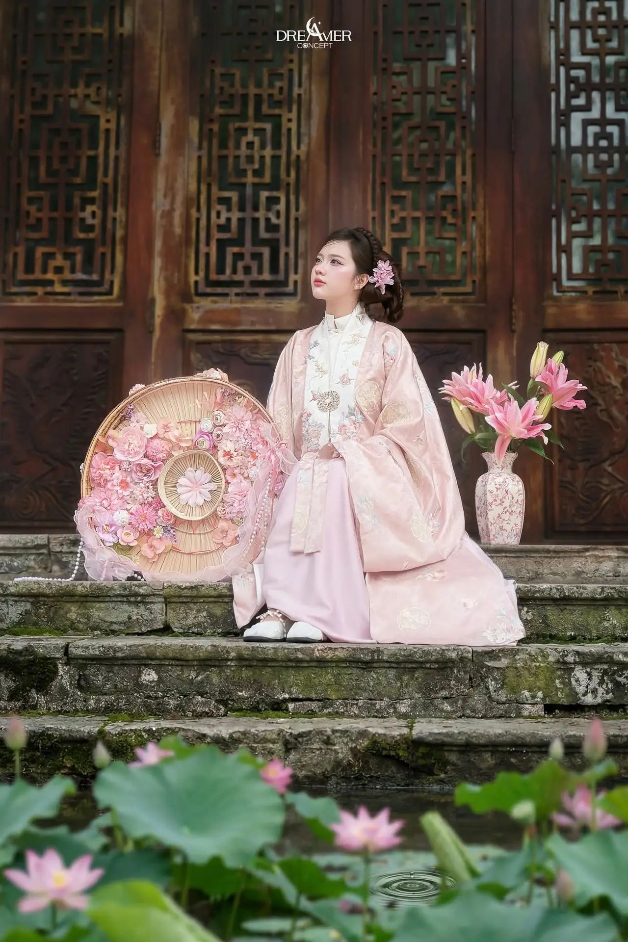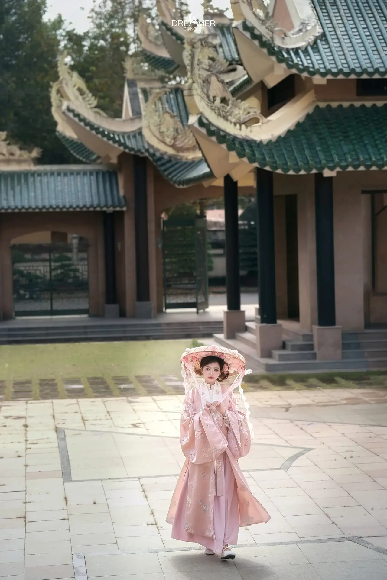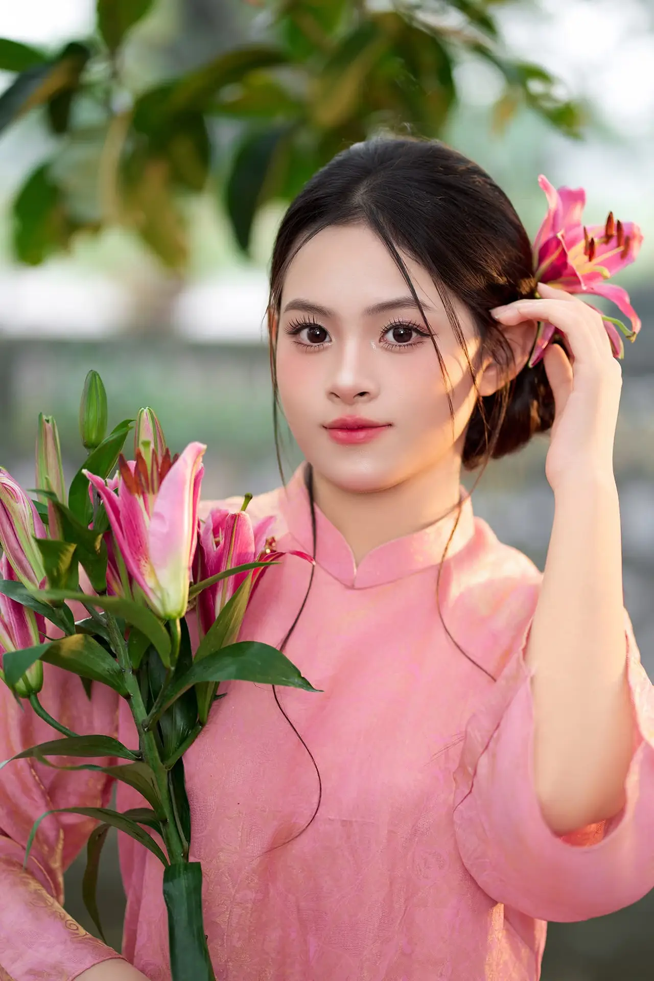 This stunning photograph captures a young Vietnamese woman in a soft pink Ao Dai standing gracefully amidst an ancient architectural setting Her elegant beauty complemented by the bouquet of flowers she holds blends perfectly with the solemn charm of moss-covered tiled roofs and traditional wooden pillars More than just a moment this image is a tender declaration of Vietnamese cultural beauty where the Ao Dai is not merely an attire but a symbol of grace elegance and national identity It evokes a sense of peace and nostalgia for precious traditional values