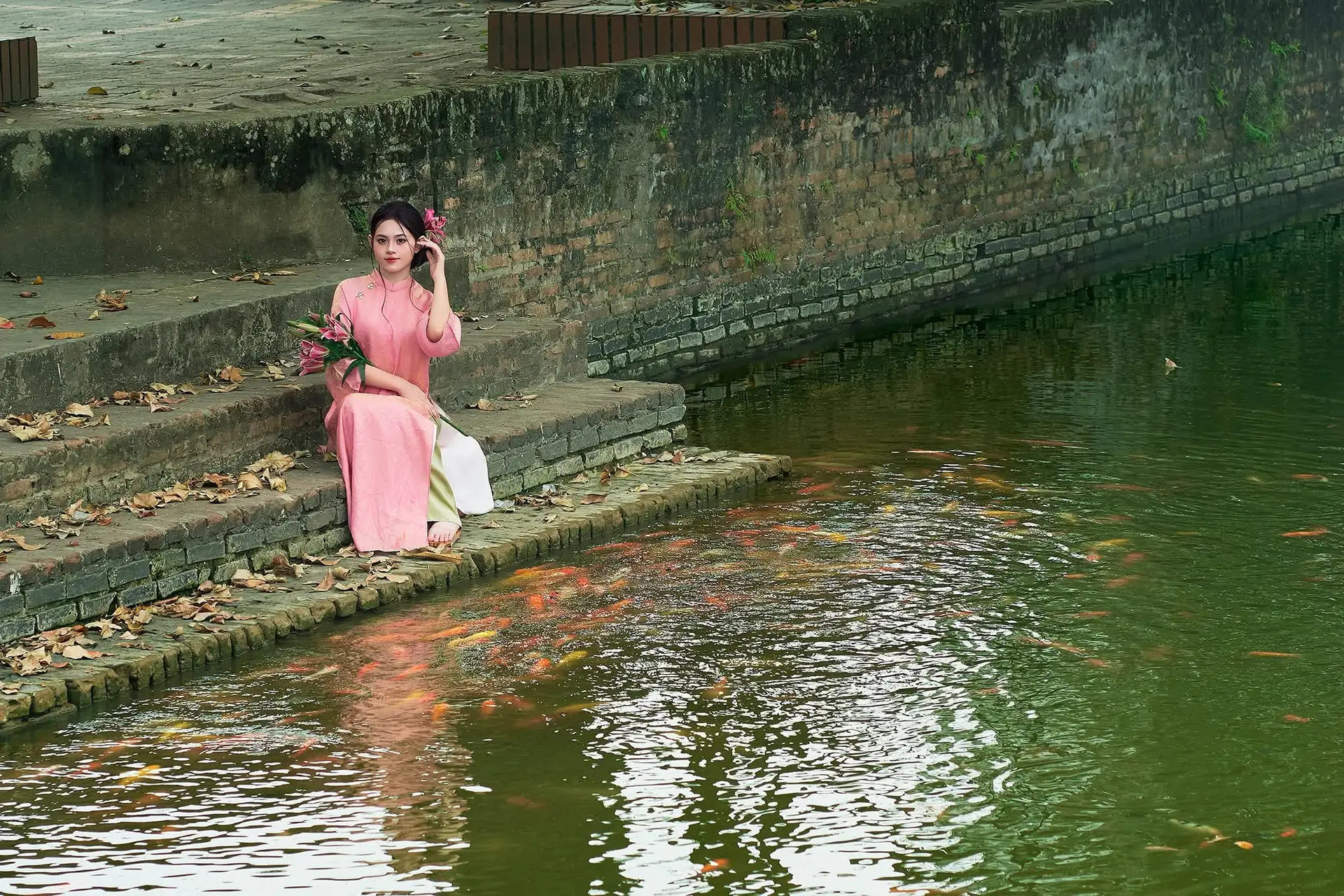 #VietnameseBeauty #AoDaiFashion #TraditionalCharm #LotusPond #AsianGrace